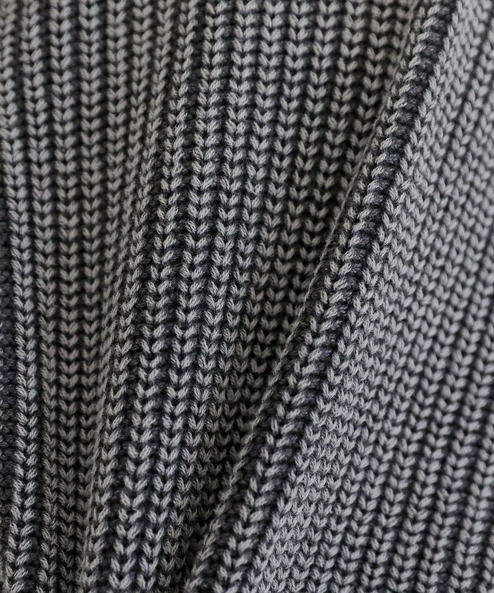 ローゲージの畦編みニットで、程よい膨らみと暖かみのある生地感。綿100%なのでチクチク感がなく柔らかな肌触りです。