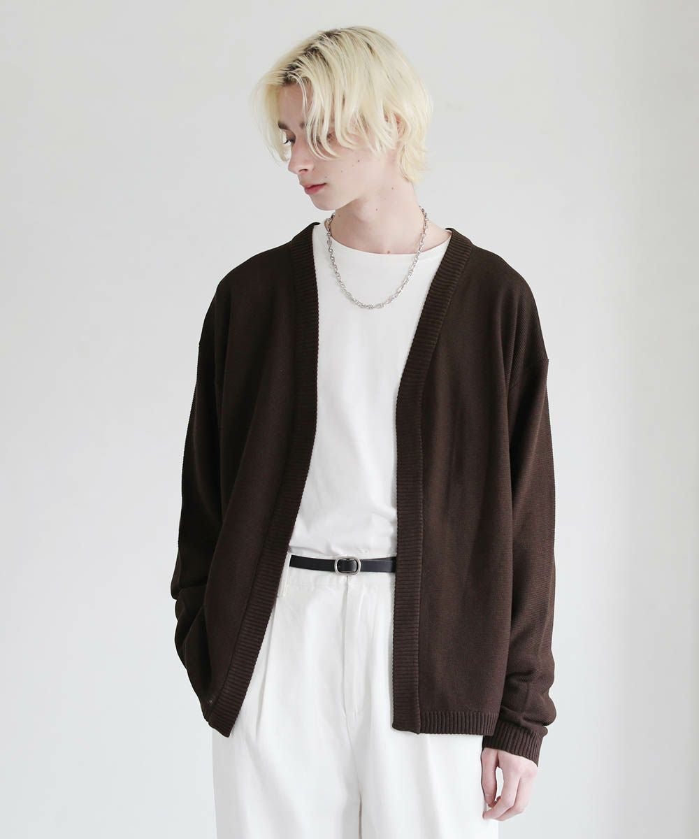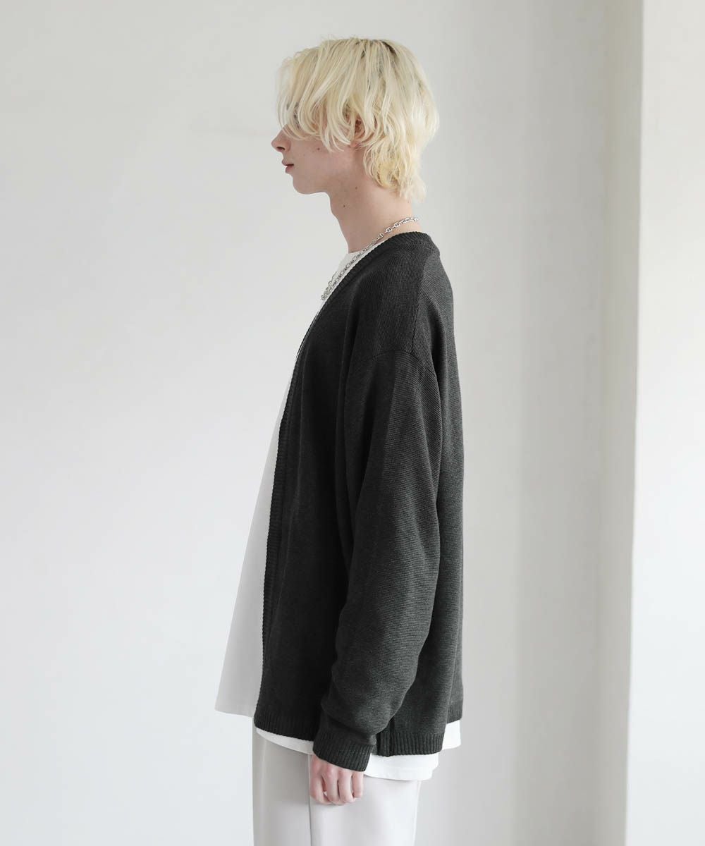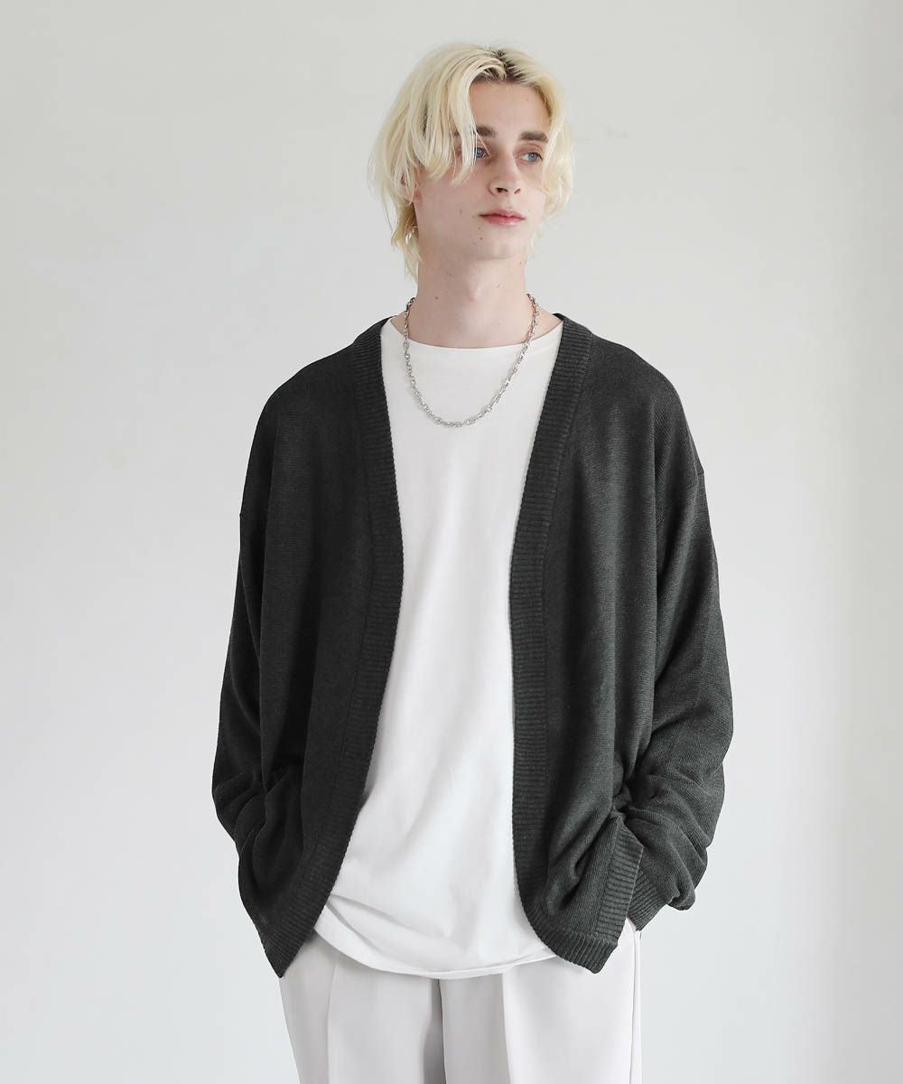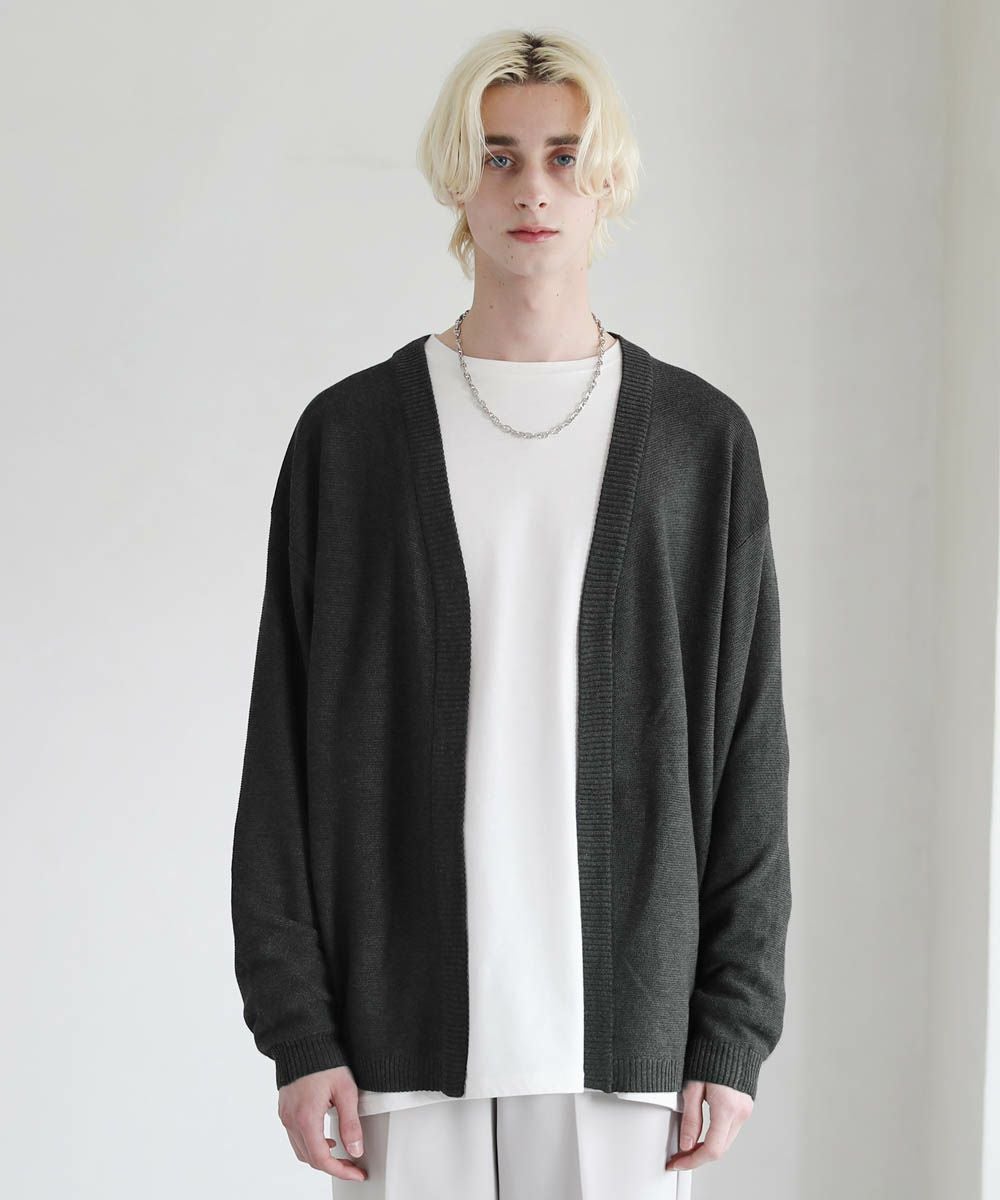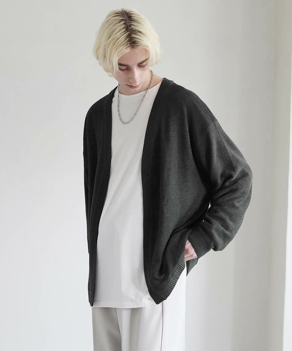 春から秋まで着まわせる、涼やかな透け感を持つガーター編みのハイゲージカーディガンです。カットソーやシャツの上からでも気軽にサッと羽織れるボタンレスデザインを採用。肩の落ちたドロップショルダーのデザインがユルい抜け感のあるアイテムです。リラックス感のあるゆったりとしたシルエットで、デイリーカジュアルからキレイめまで幅広いシーン活躍します。