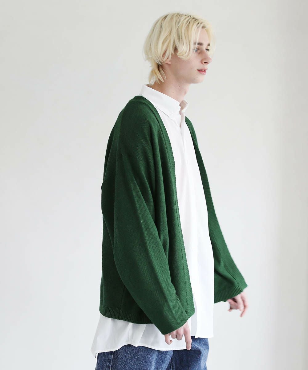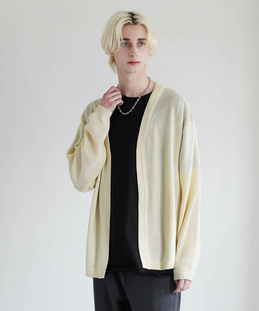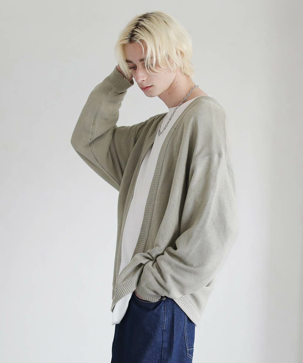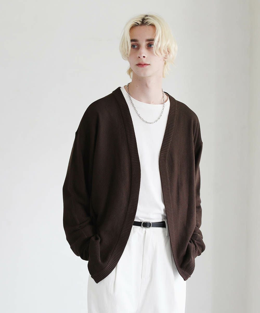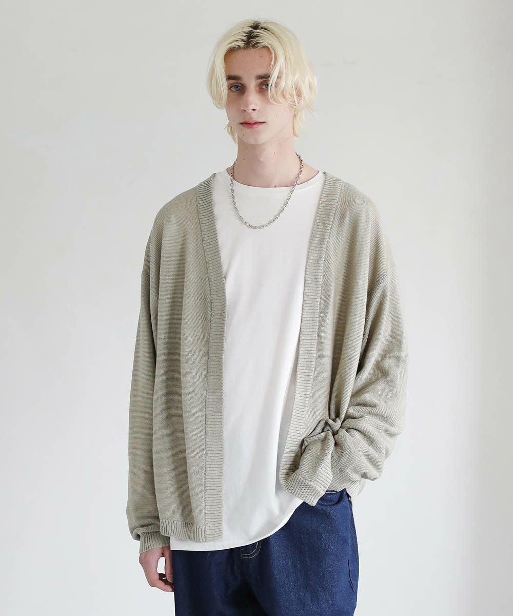 春から秋まで着まわせる、涼やかな透け感を持つガーター編みのハイゲージカーディガンです。カットソーやシャツの上からでも気軽にサッと羽織れるボタンレスデザインを採用。肩の落ちたドロップショルダーのデザインがユルい抜け感のあるアイテムです。リラックス感のあるゆったりとしたシルエットで、デイリーカジュアルからキレイめまで幅広いシーン活躍します。