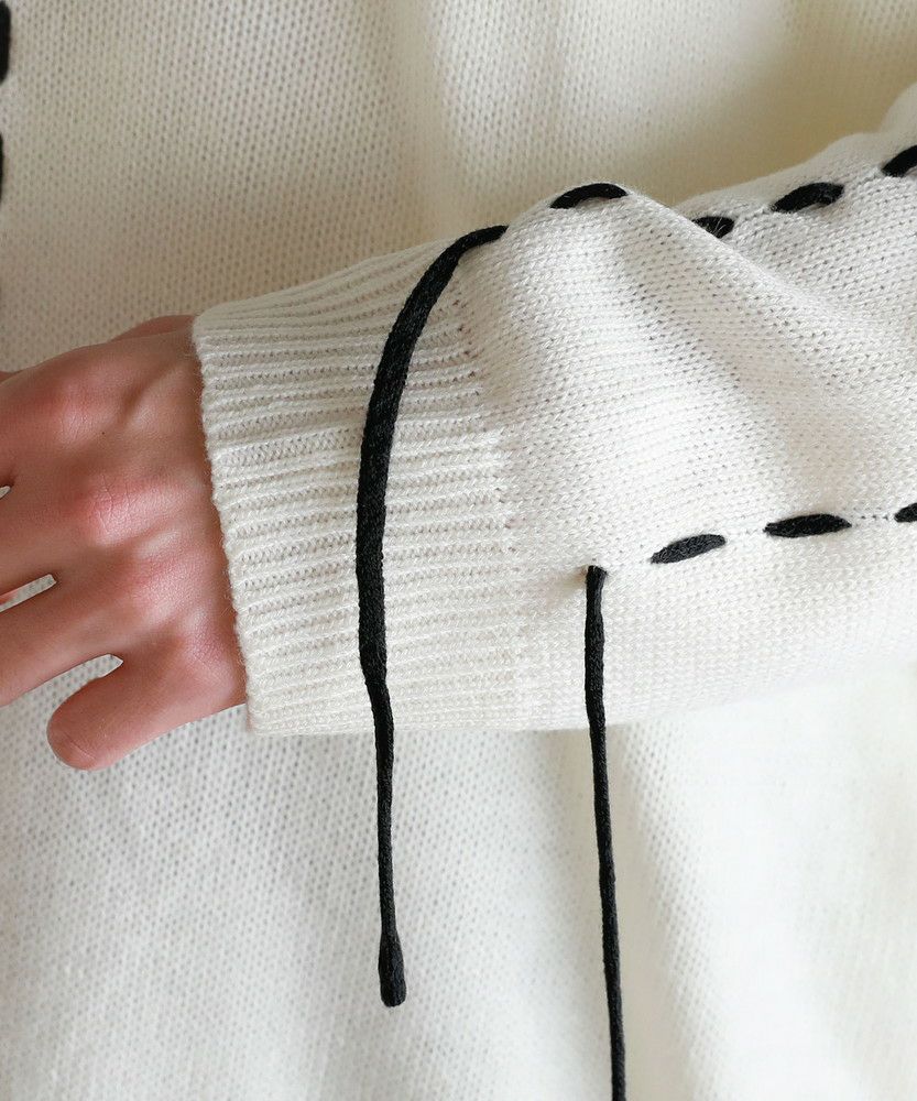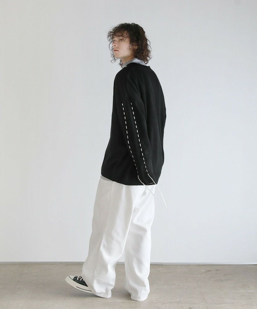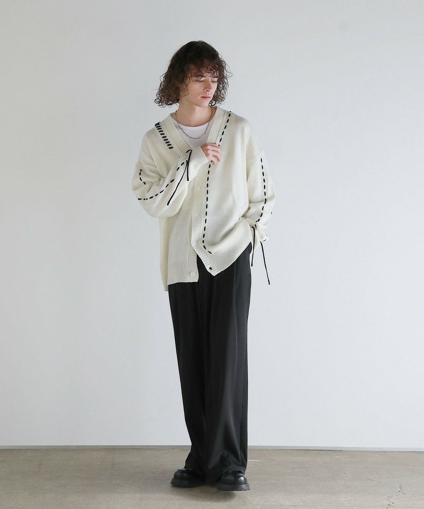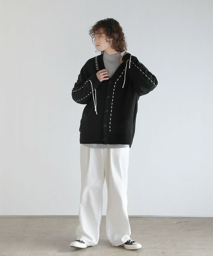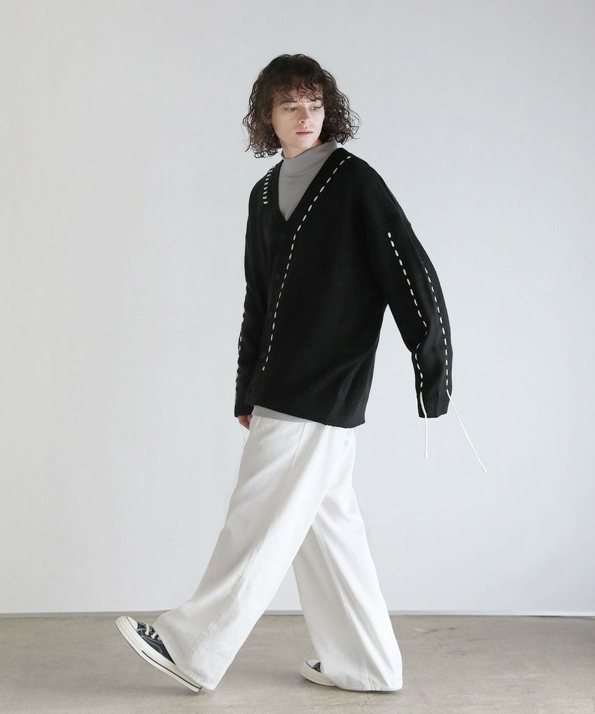 トレンド感のあるビッグサイズとハンドステッチデザインで今っぽく着こなせるニットカーディガン。さっと羽織るだけでこなれた着こなしが完成する、シンプルながらトレンドを押さえたアイテムです。アシンメトリーにステッチの入ったデザインが、さり気ないアクセントを与える一着。さらに袖口から垂らしたコードが動きをプラスしてくれます。大きめにとった身幅やアームホールは抜け感のある印象にまとまり、ゆったりと着こなせてデイリーユースにピッタリです。