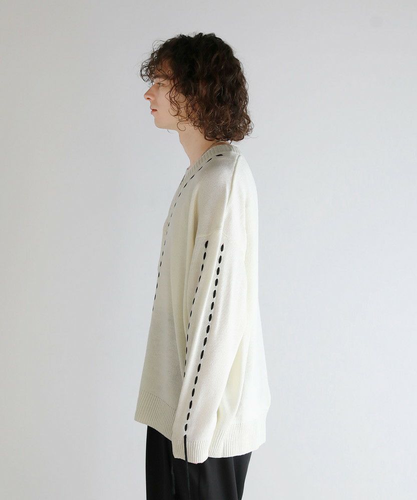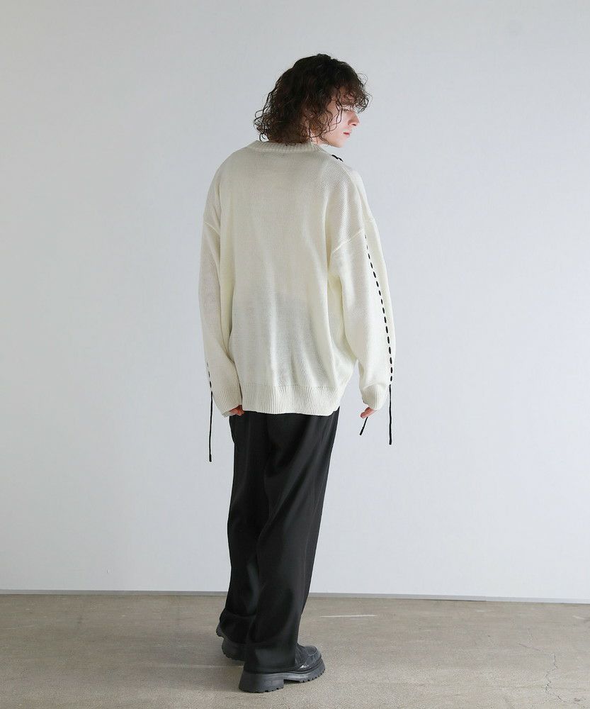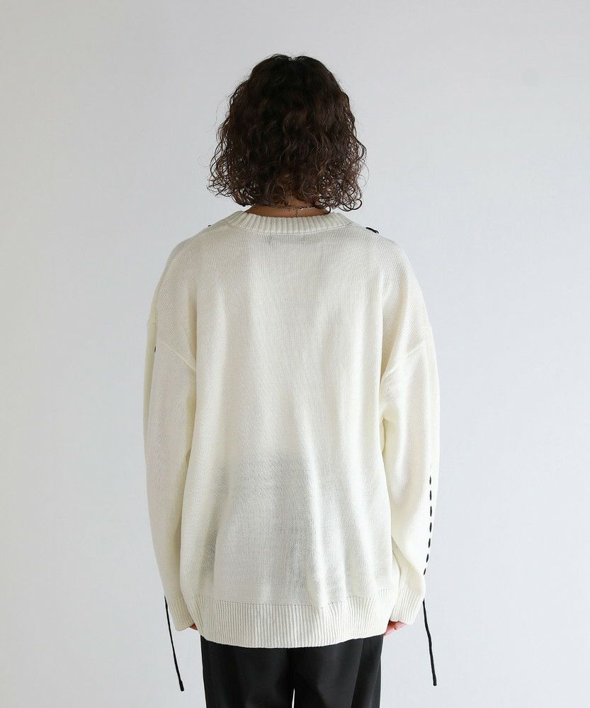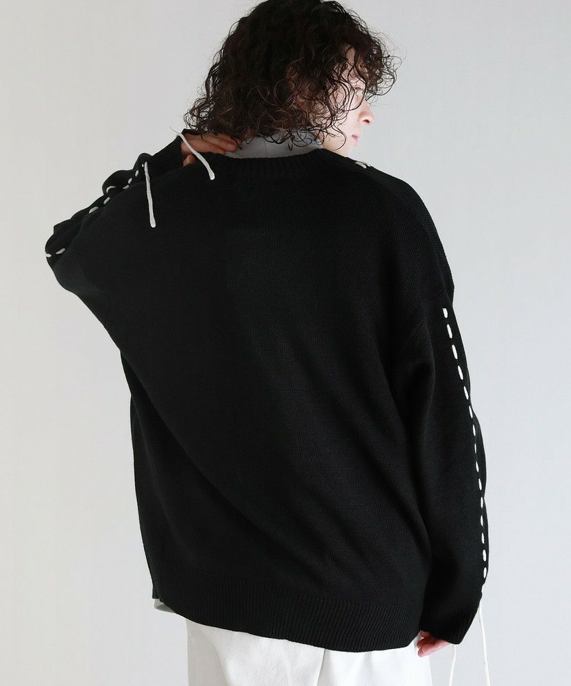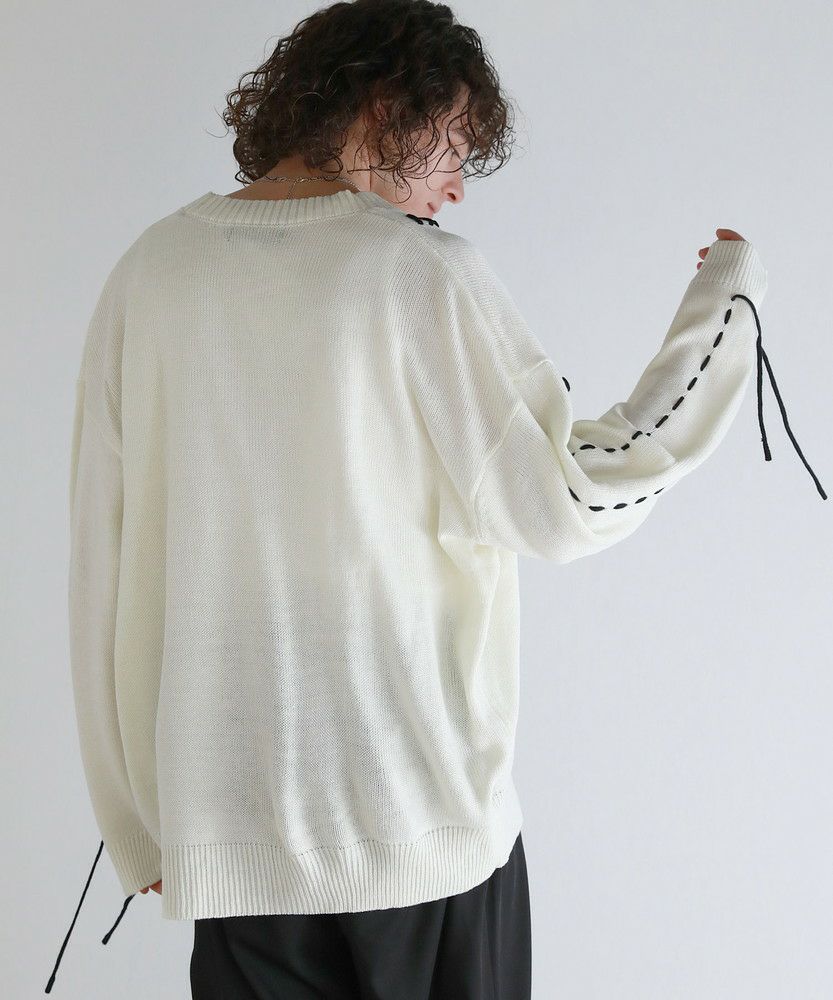 トレンド感のあるビッグサイズとハンドステッチデザインで今っぽく着こなせるニットカーディガン。さっと羽織るだけでこなれた着こなしが完成する、シンプルながらトレンドを押さえたアイテムです。アシンメトリーにステッチの入ったデザインが、さり気ないアクセントを与える一着。さらに袖口から垂らしたコードが動きをプラスしてくれます。大きめにとった身幅やアームホールは抜け感のある印象にまとまり、ゆったりと着こなせてデイリーユースにピッタリです。