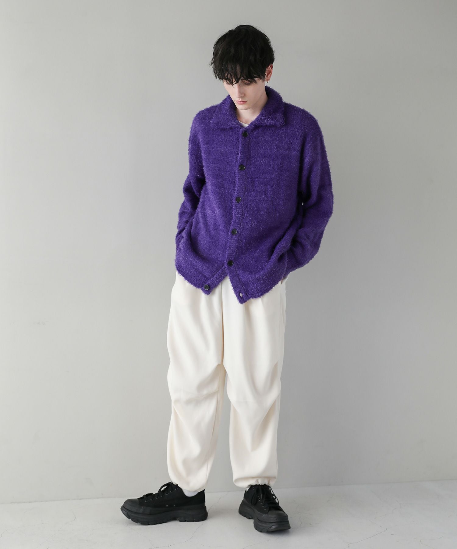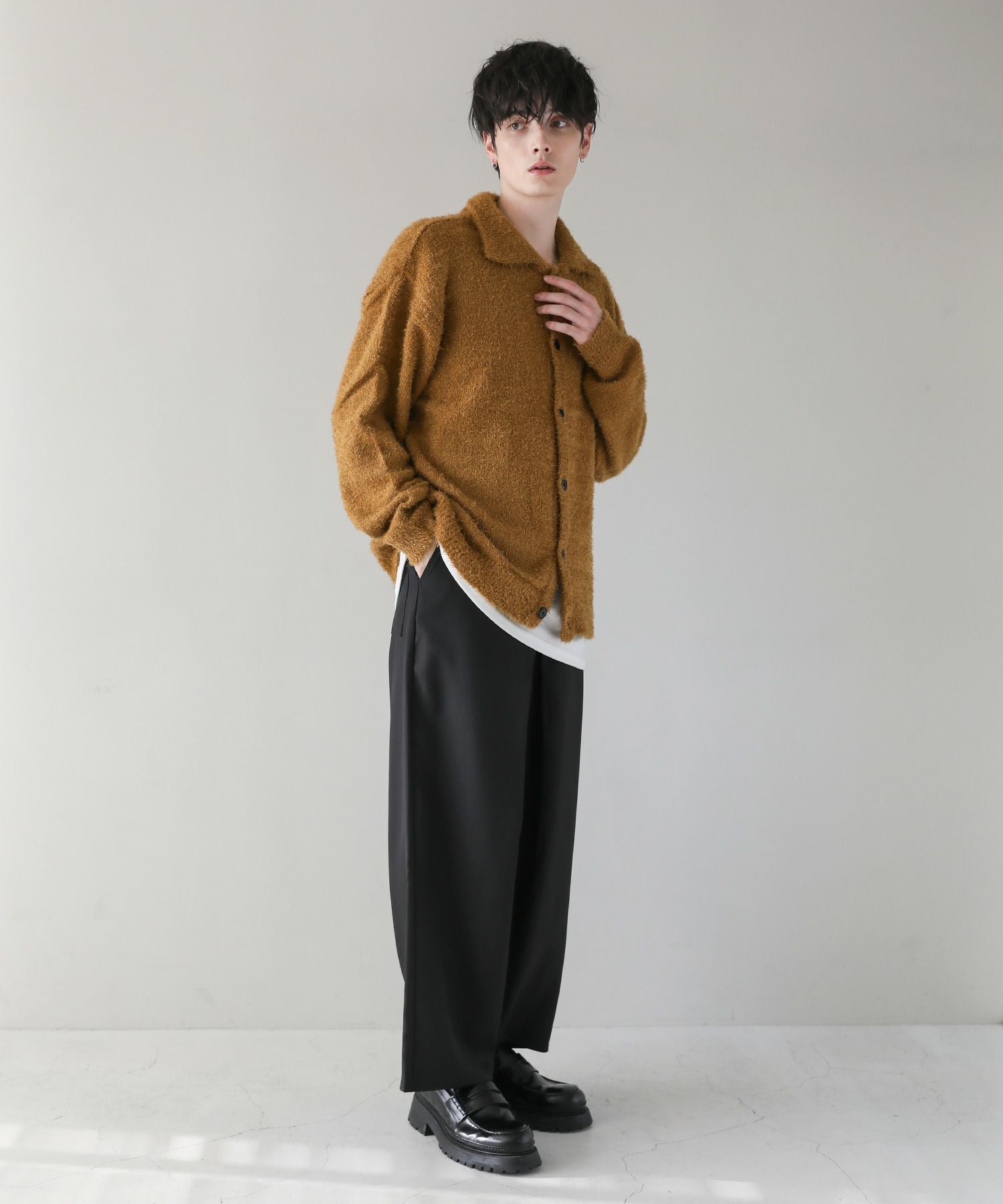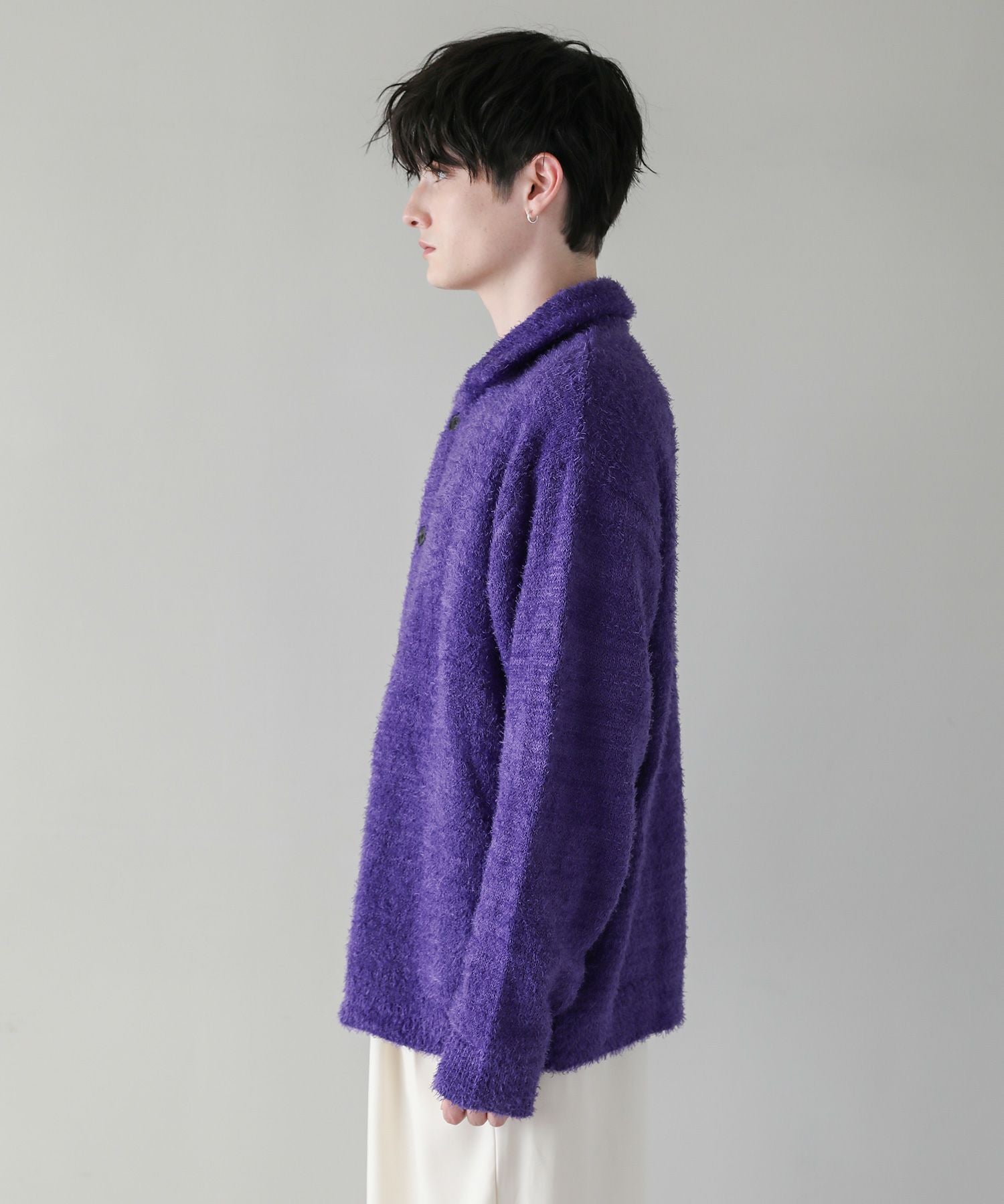 カーディガンとしてはもちろん、ボタンを閉じてポロニットとしてトレンド感たっぷりの着こなしが可能。