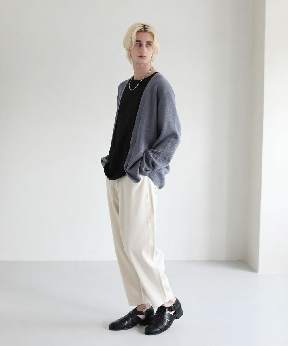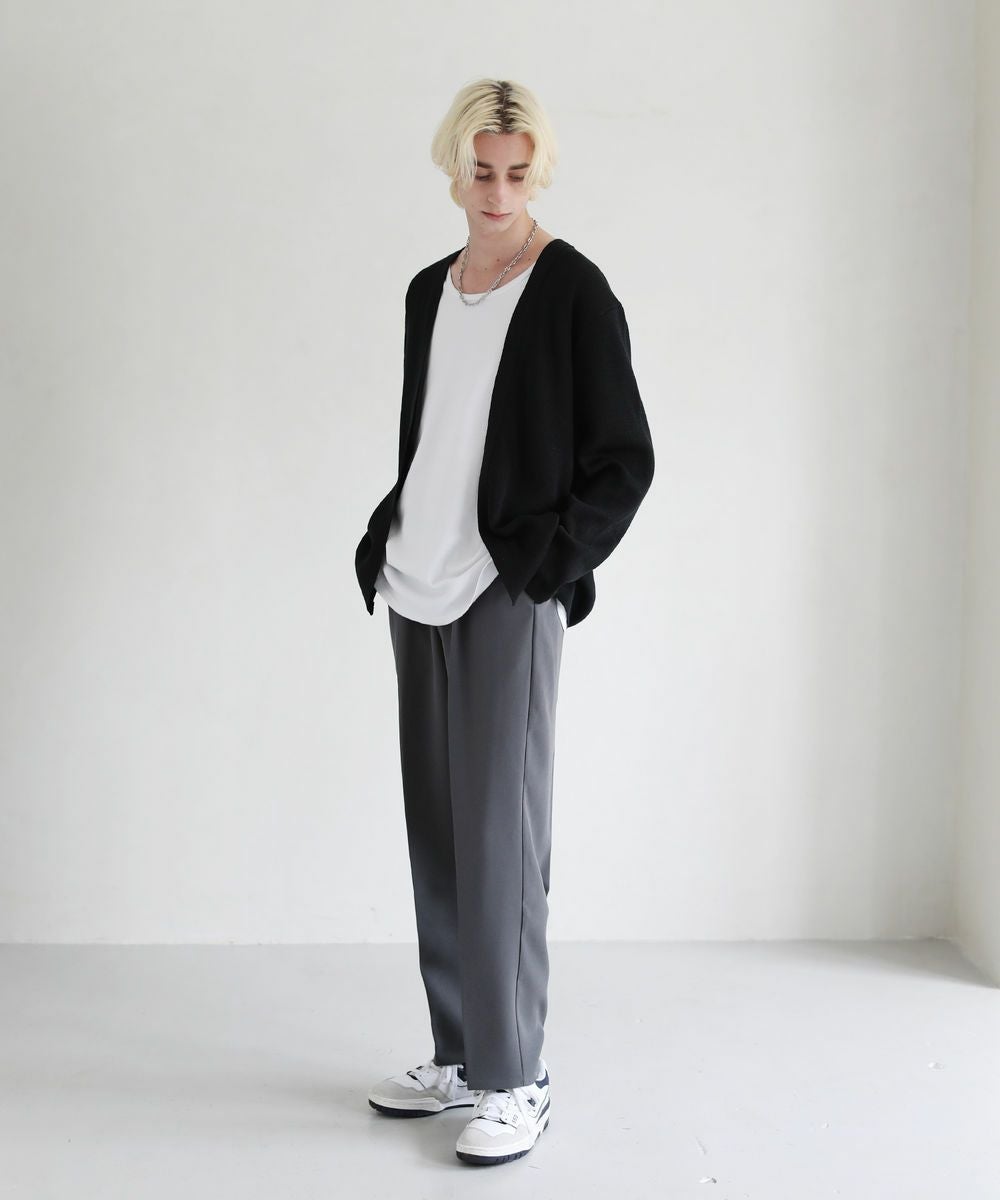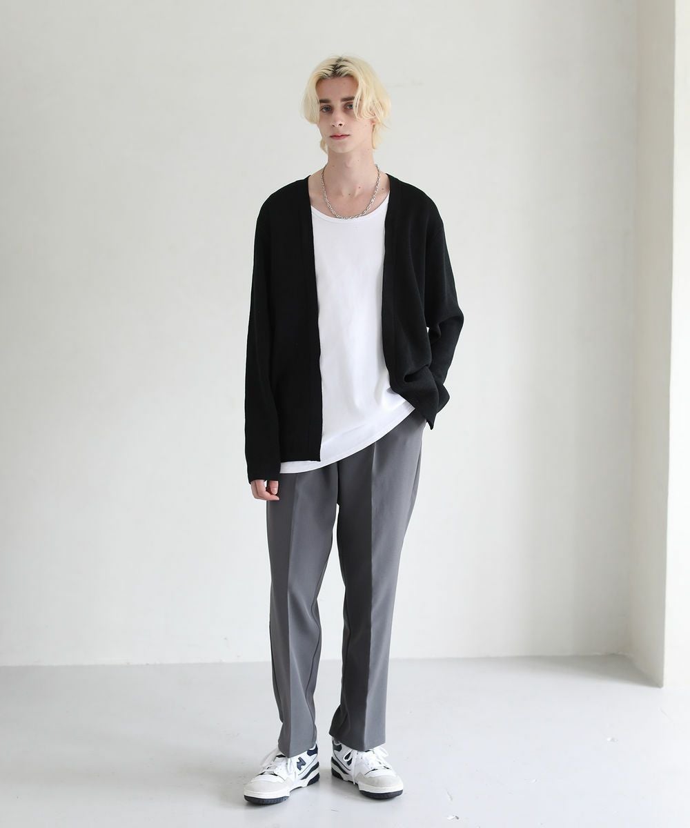 ボタンがないデザインの『ボタンレスカーデ』です。ガウンのようにも見えるデザインで、普通のカーディガンよりもリラックス感のある着こなしがお楽しみいただけます。シンプルなコーディネートにボタンレスカーデをプラスするだけで簡単に抜け感が出て、グッとお洒落な装いになります。