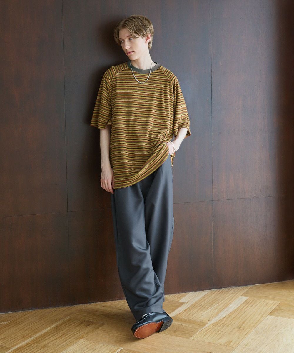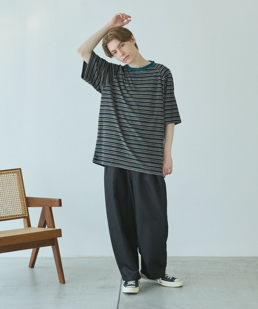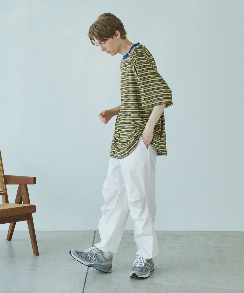 スラックスと合わせたクリーンな着こなしや、ラフにデニムやイージーパンツ、スニーカーを合わせた着こなしもおすすめ。ランダムなボーダー柄と首元の配色部分がアクセントとなる為、一枚着でも単調にならずおしゃれにまとまります。シンプルになりがちな夏の着こなしに新鮮さを与えてくれる一着です。