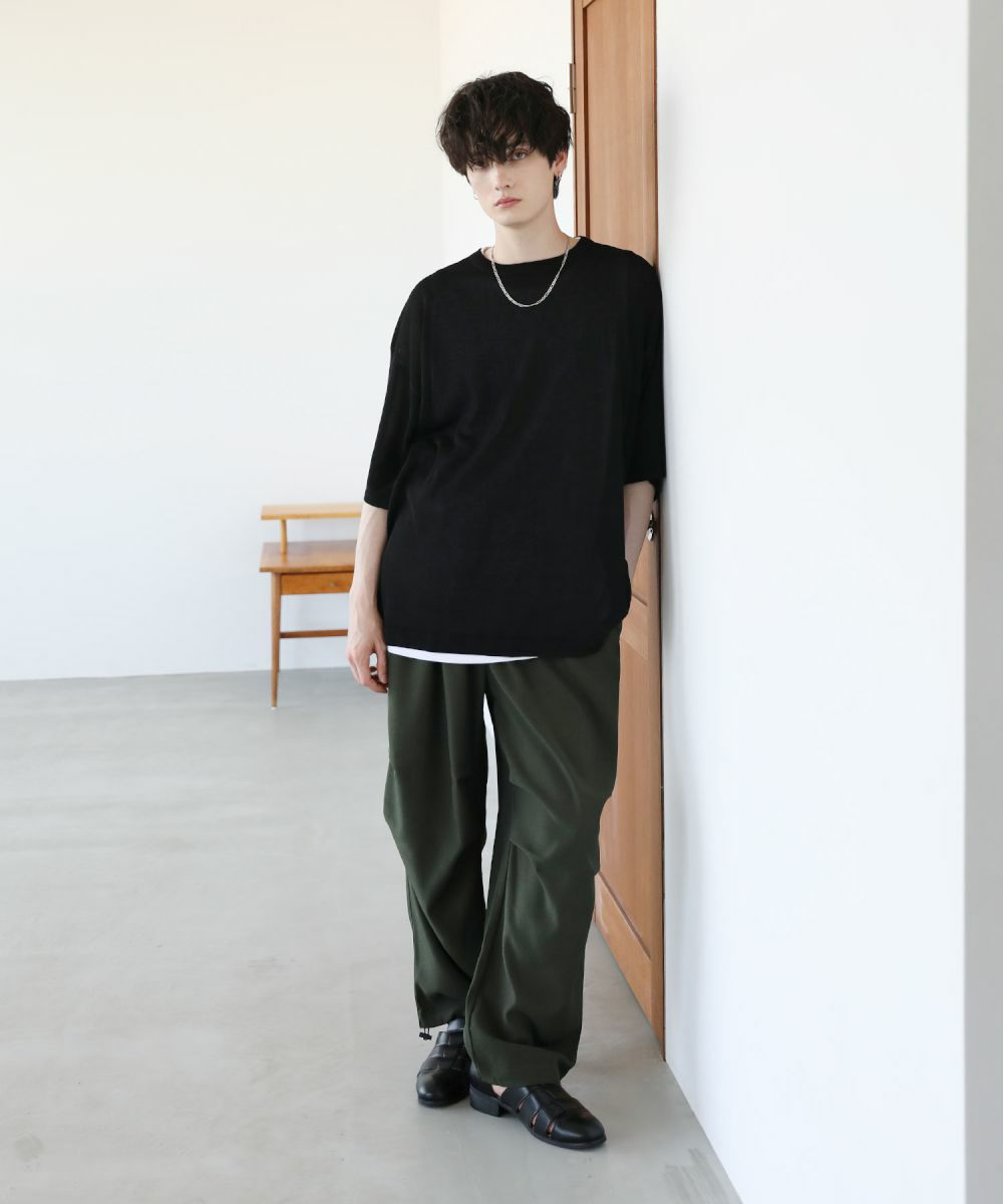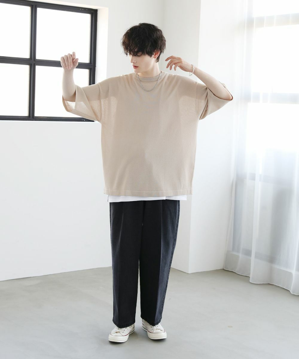 お尻が隠れるくらいの丈感とゆとりのある身幅でどんなボトムとも合わせやすいのがポイント。ワイドパンツやデニムパンツ、スキニーパンツなどお手持ちのボトムやスタイルに合わせて着用することが可能。透け感がある薄手な生地感なので、カラーバランスを楽しみながらレイヤードスタイリングを楽しめます。