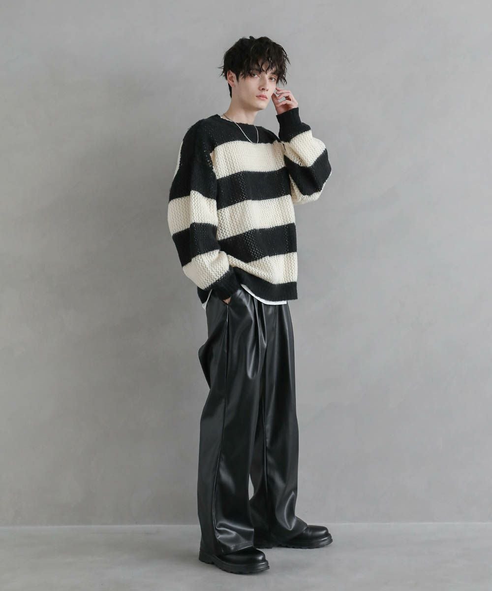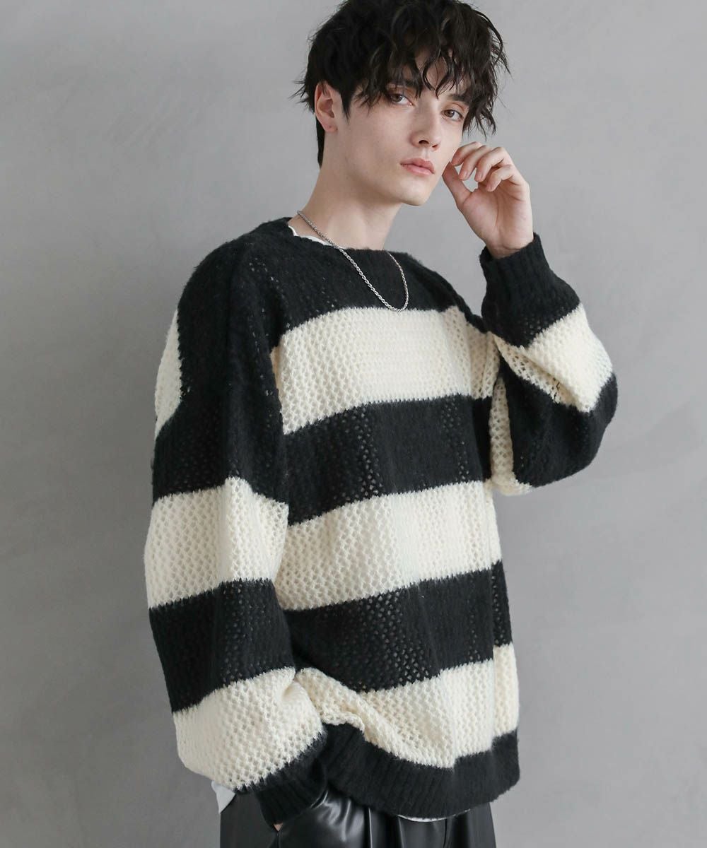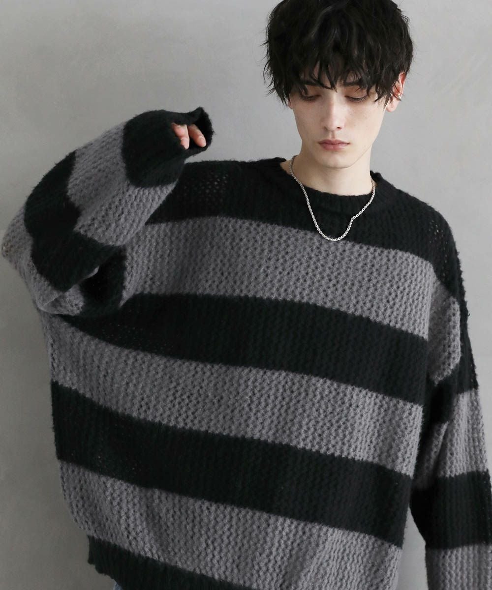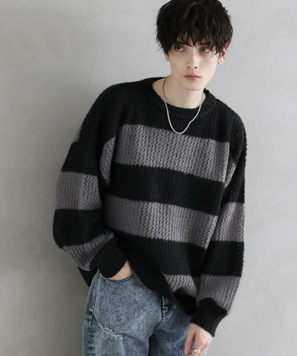 カラー糸をMIXした表情のあるメランジニットのブラックに、着こなしのメインになるボーダー2色を加えた3色展開。秋冬のスタイリングにラフな抜け感をプラスする、おすすめのアイテムです。
