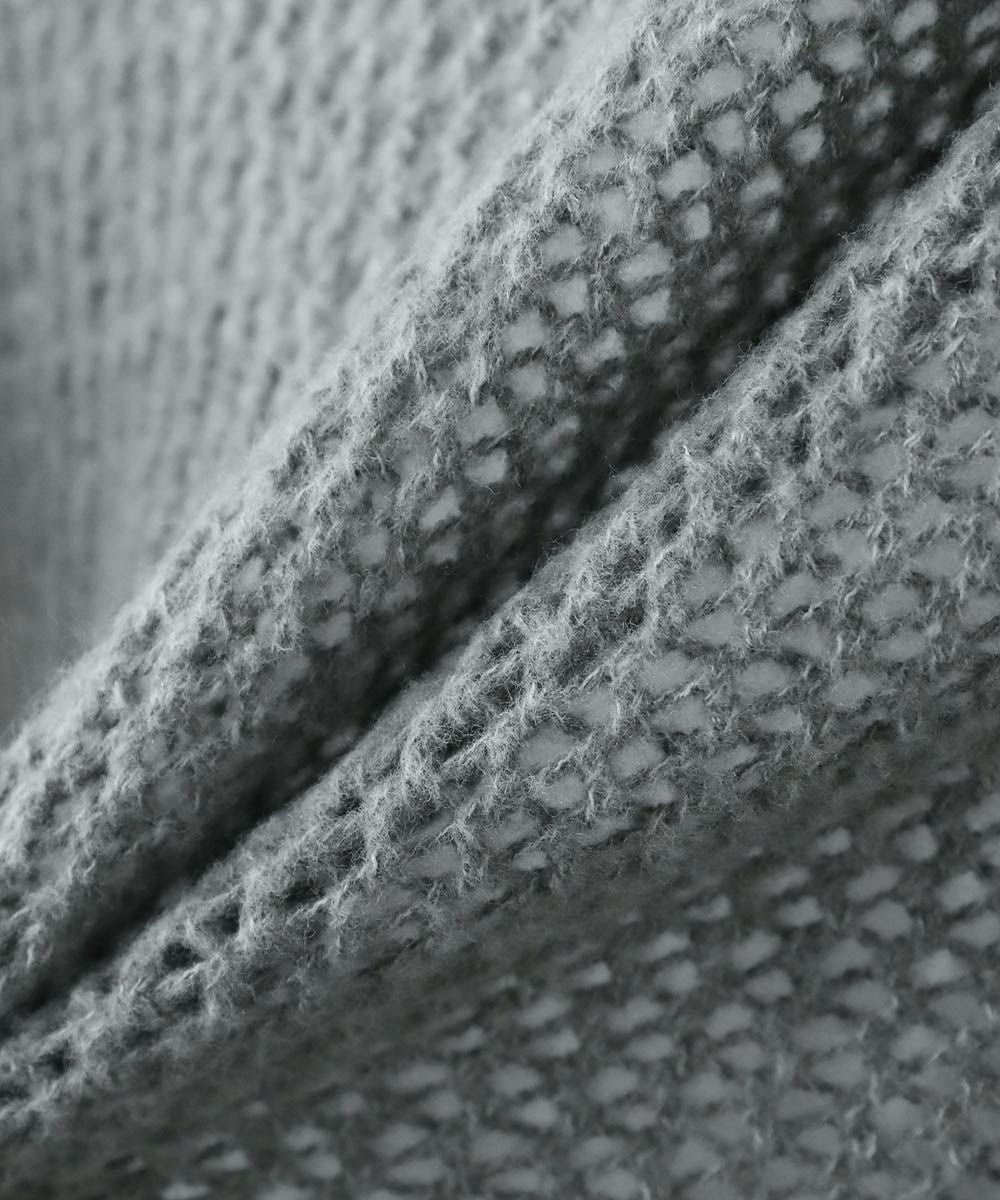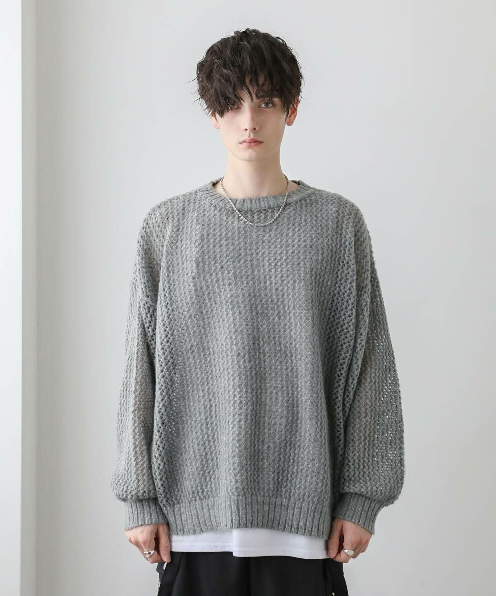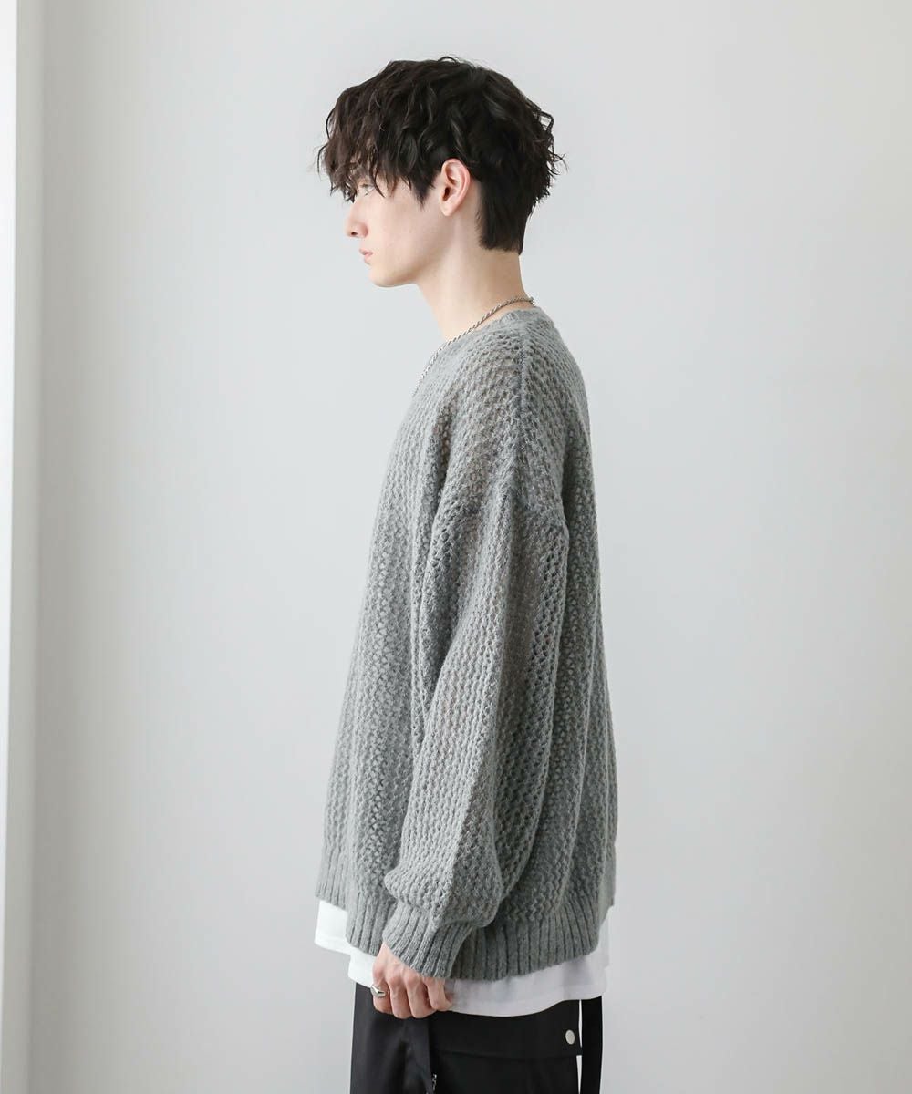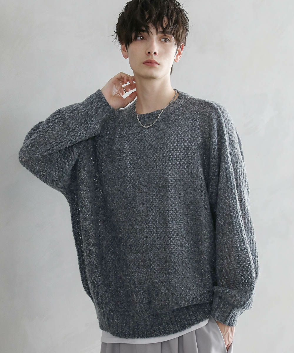 1枚でトレンドの着こなしを作る、透かし編みニットが登場。ざっくりとした編み地で、インナーとのレイヤードを楽しめる1着です。ゆとりのあるルーズシルエットにドロップショルダー、丸みのある溜まり袖がアクセントに。起毛感のあるモヘアタッチのニットは、秋冬らしい温かみのある雰囲気をプラスしてくれます。