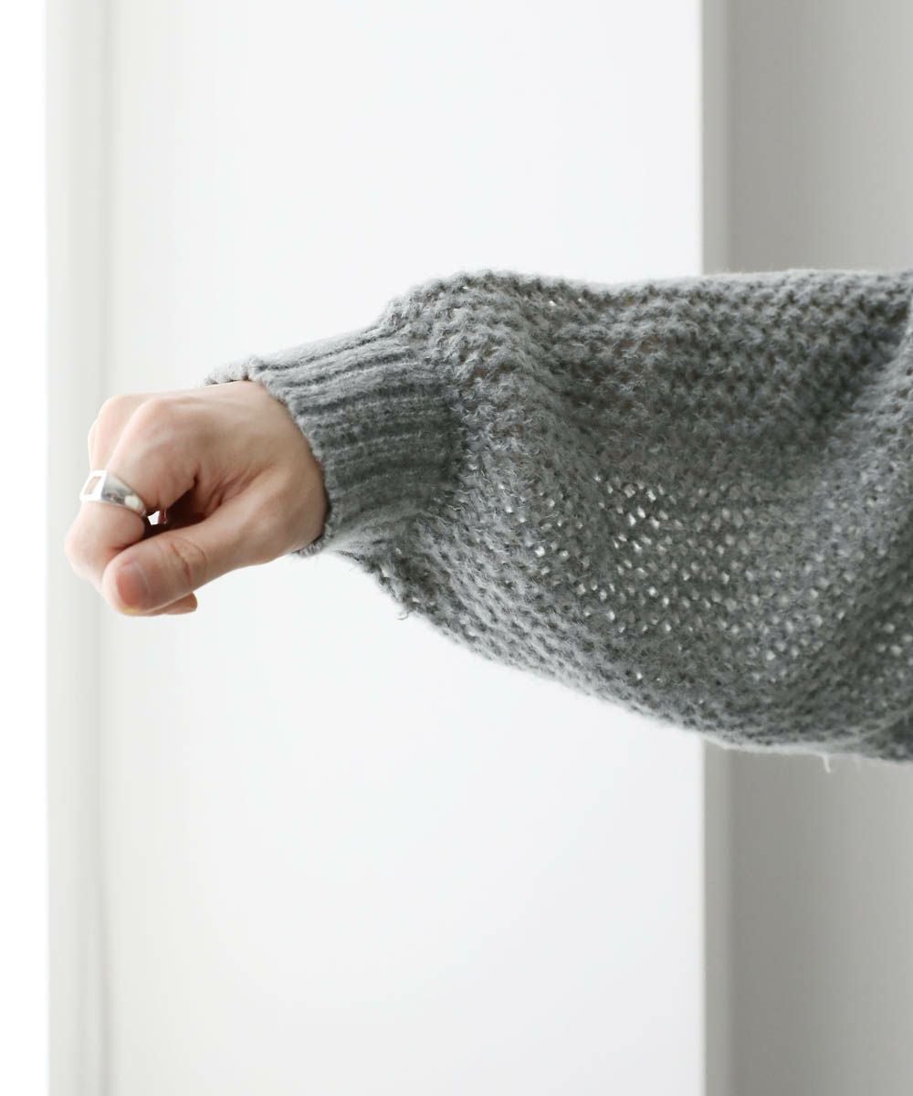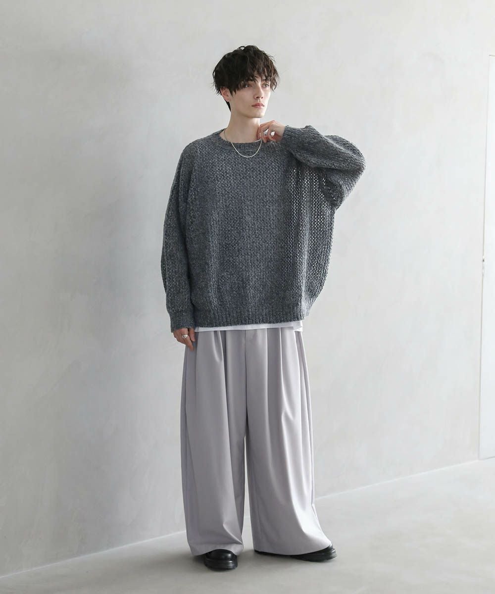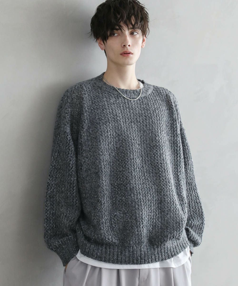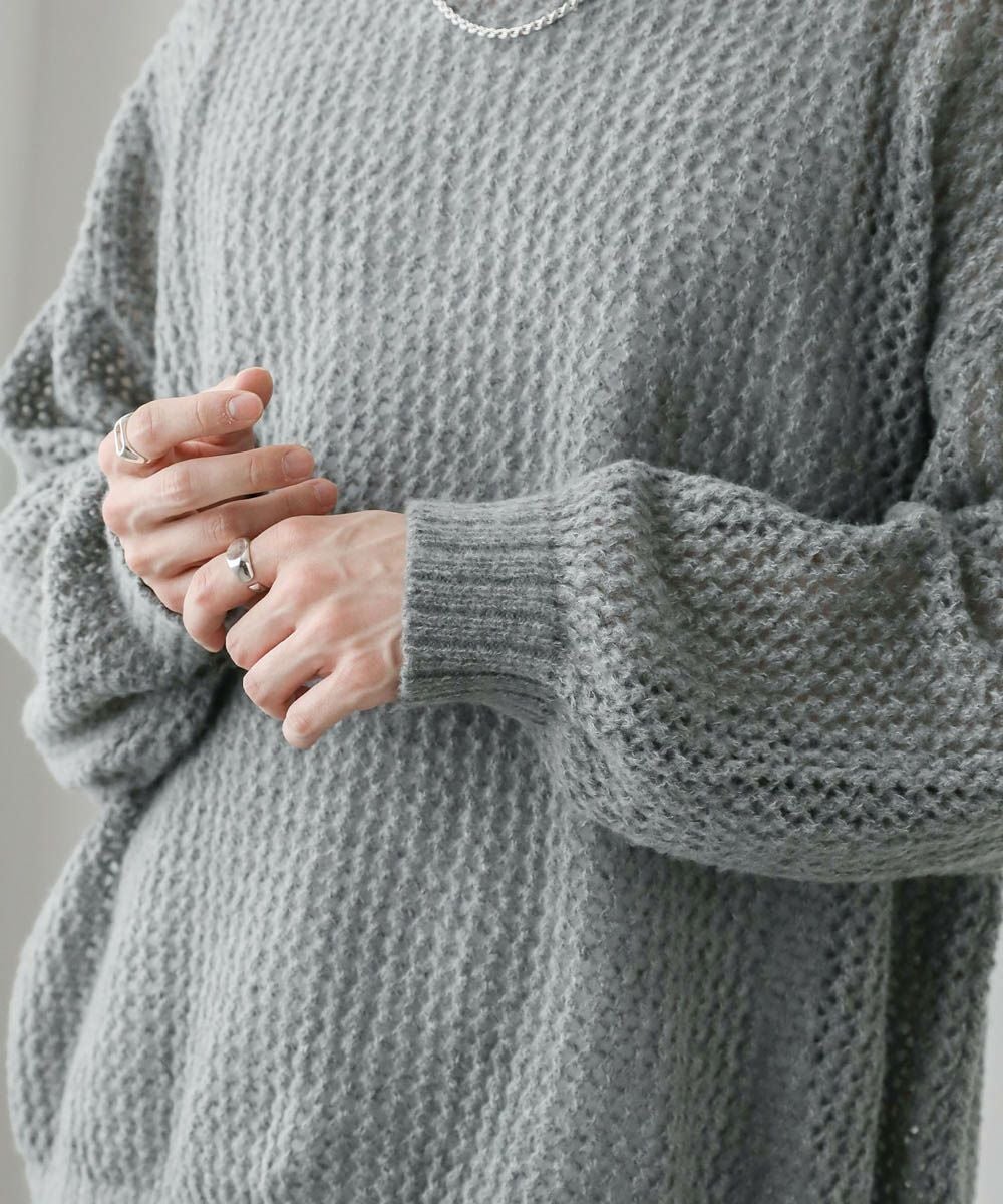 1枚でトレンドの着こなしを作る、透かし編みニットが登場。ざっくりとした編み地で、インナーとのレイヤードを楽しめる1着です。ゆとりのあるルーズシルエットにドロップショルダー、丸みのある溜まり袖がアクセントに。起毛感のあるモヘアタッチのニットは、秋冬らしい温かみのある雰囲気をプラスしてくれます。