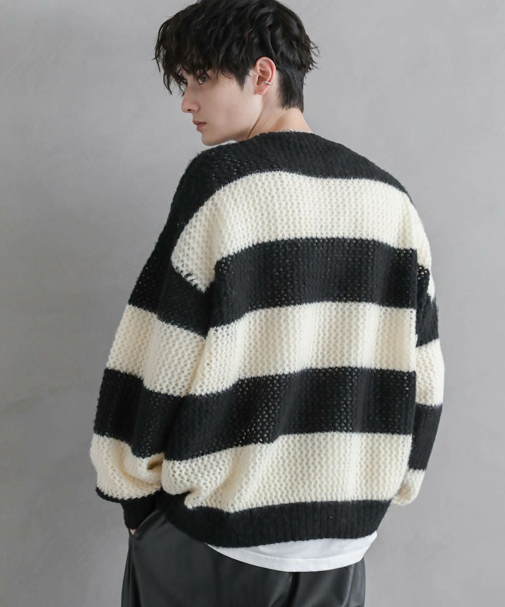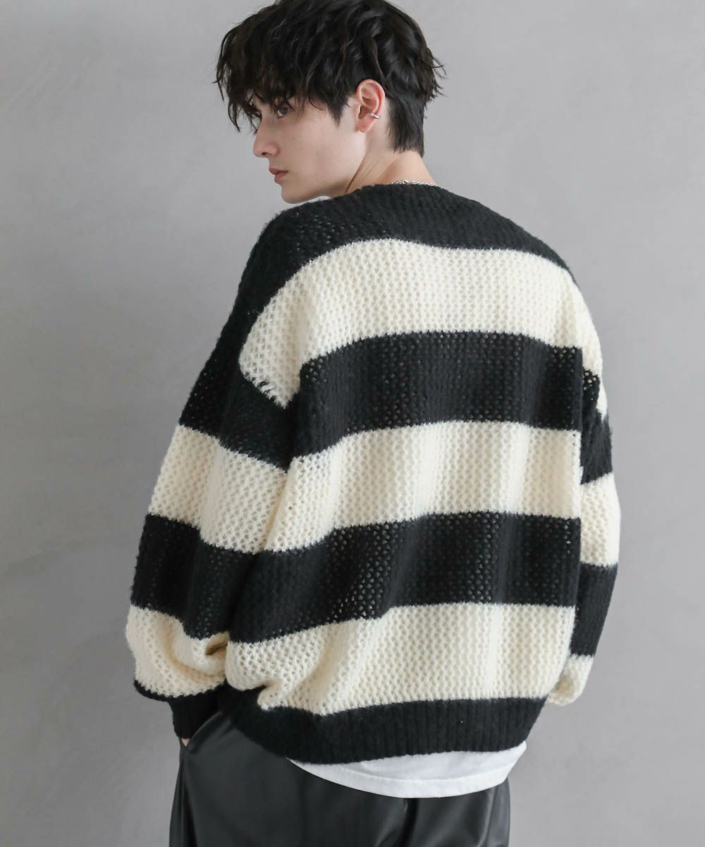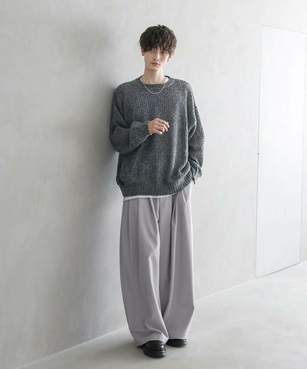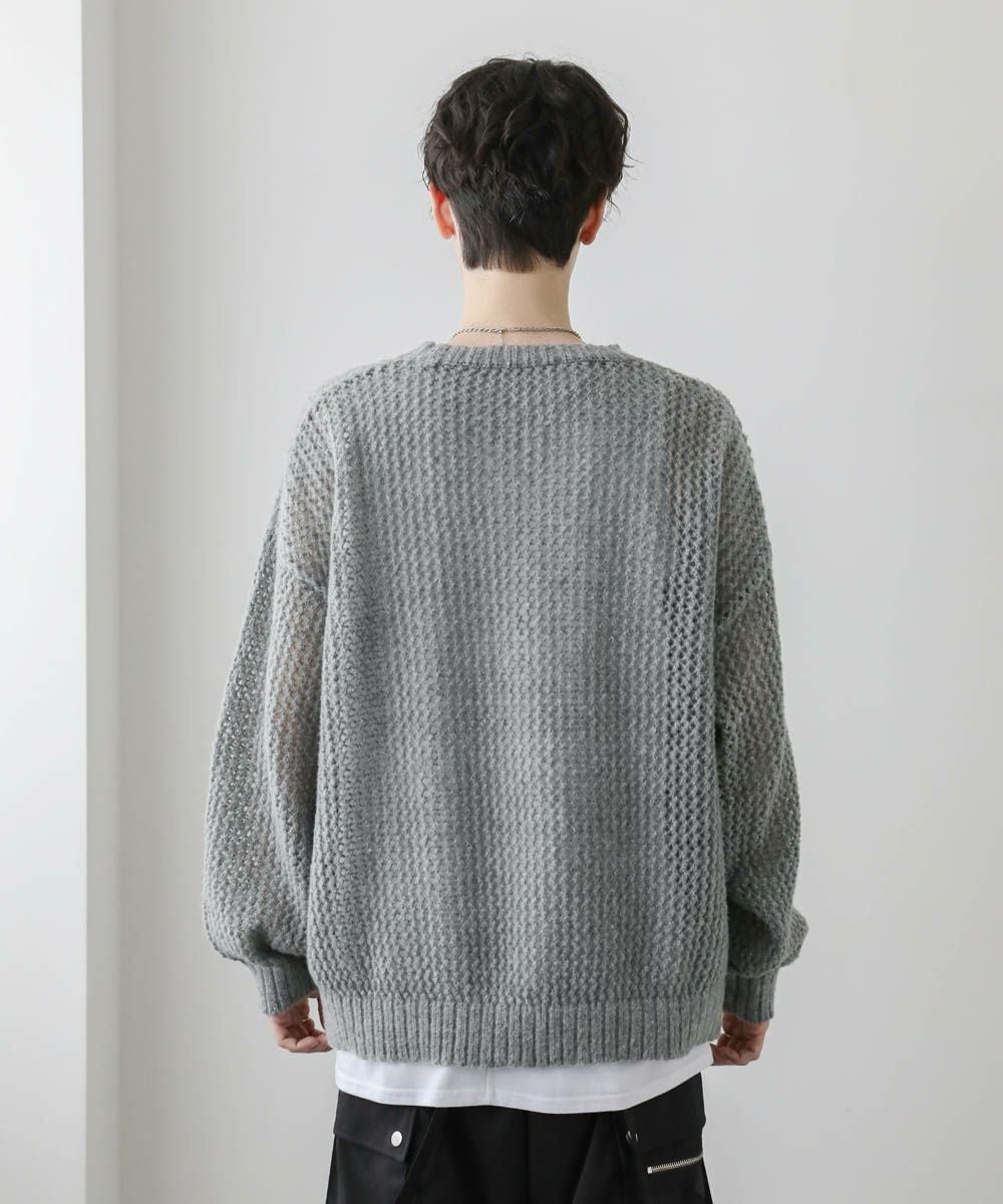 1枚でトレンドの着こなしを作る、透かし編みニットが登場。ざっくりとした編み地で、インナーとのレイヤードを楽しめる1着です。ゆとりのあるルーズシルエットにドロップショルダー、丸みのある溜まり袖がアクセントに。起毛感のあるモヘアタッチのニットは、秋冬らしい温かみのある雰囲気をプラスしてくれます。