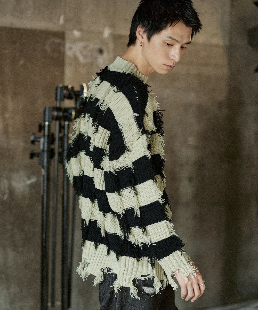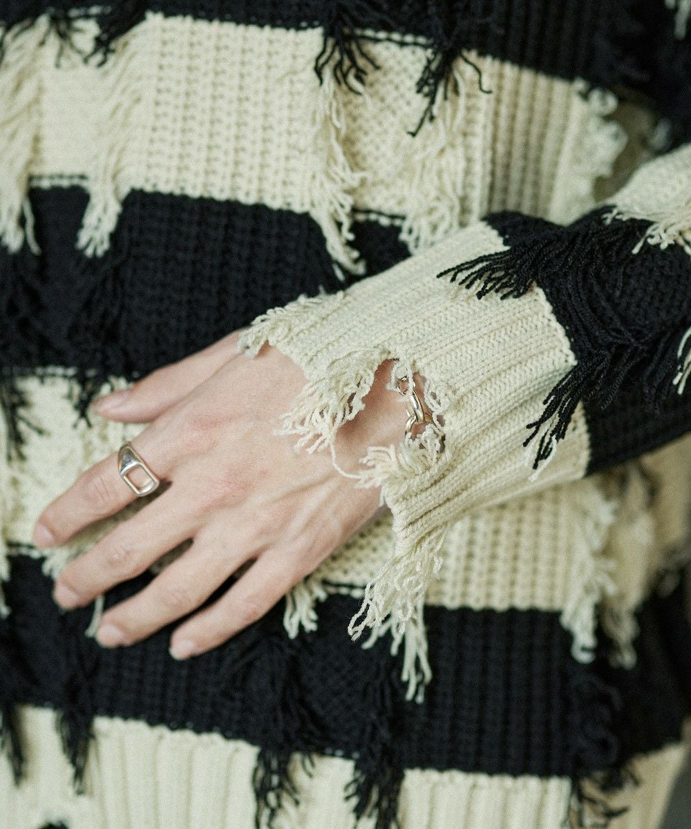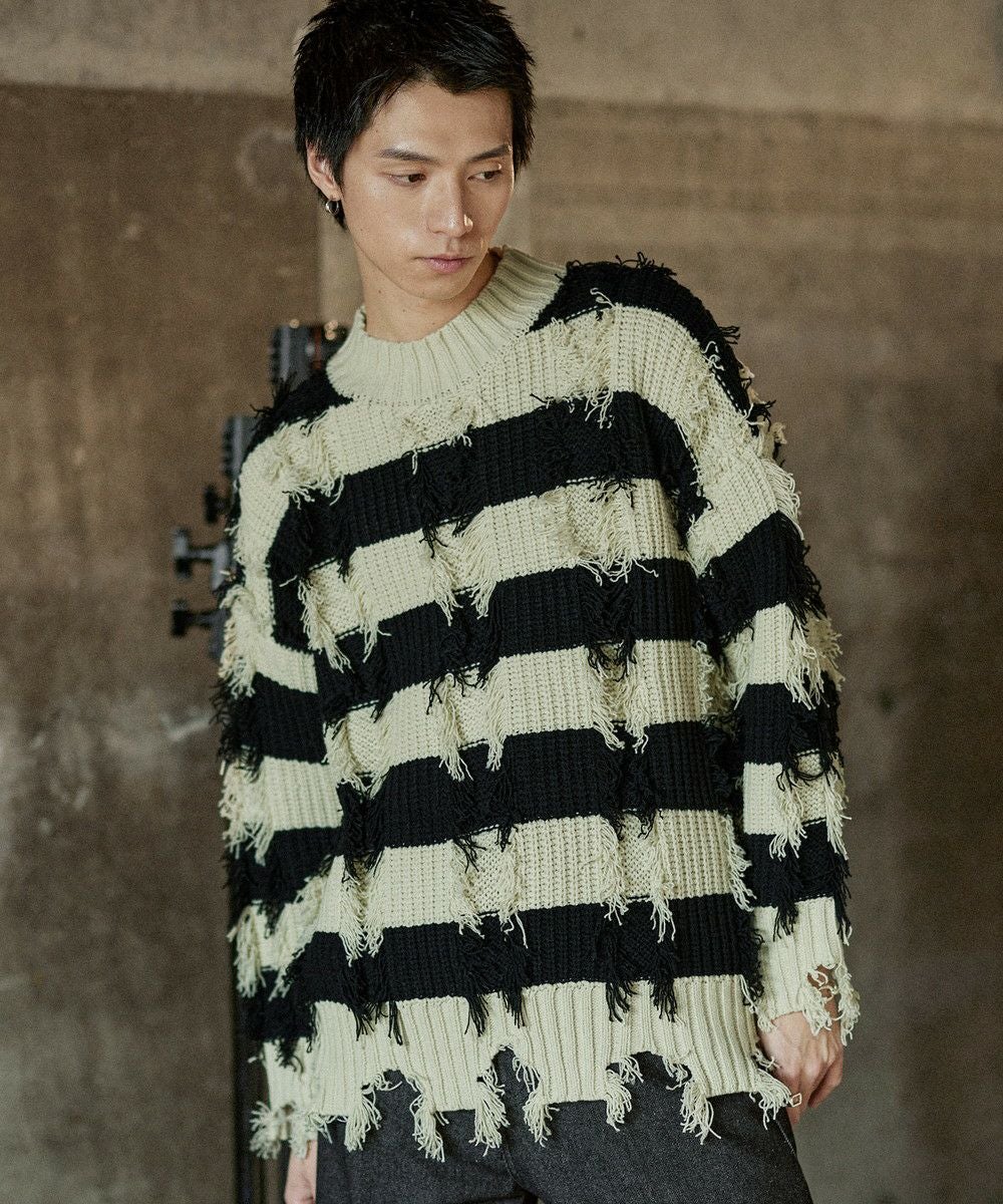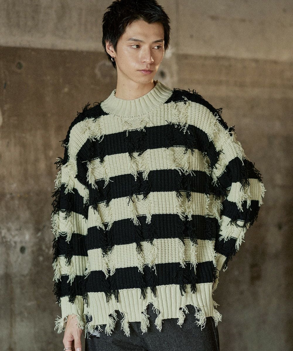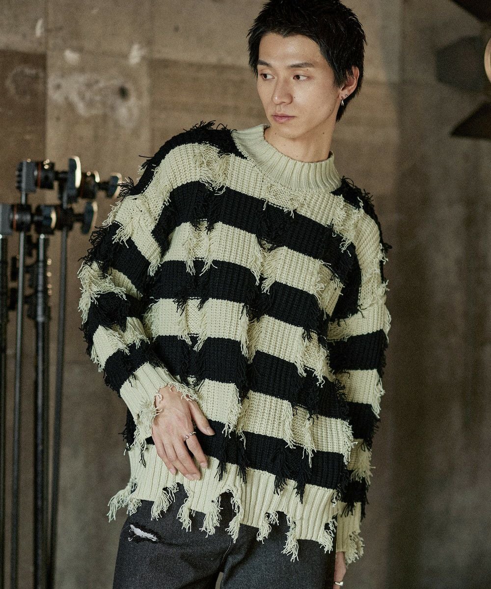 ダメージ加工と随所に施されたフリンジデザインが印象的なボーダーニット。裾や袖口のダメージ加工とインパクトのある太めのボーダーが存在感を発揮してくれる1着です。ざっくりとした編み地に加え、ゆとりのあるオーバーサイズシルエットとドロップショルダーが抜け感をプラス。デザイン性が高く主役感のあるボーダーニットは、1枚で着こなしの幅を広げてくれるアイテムです。