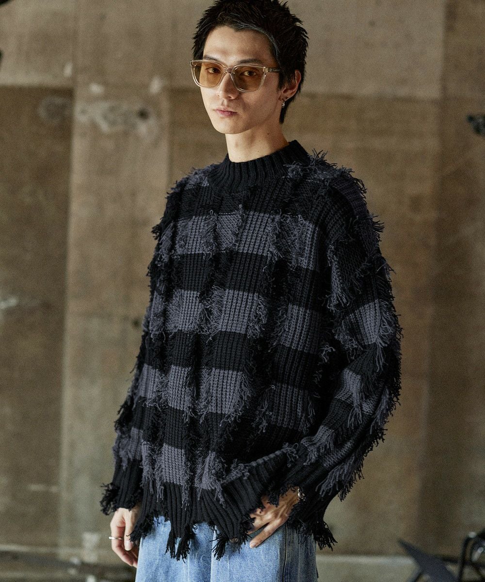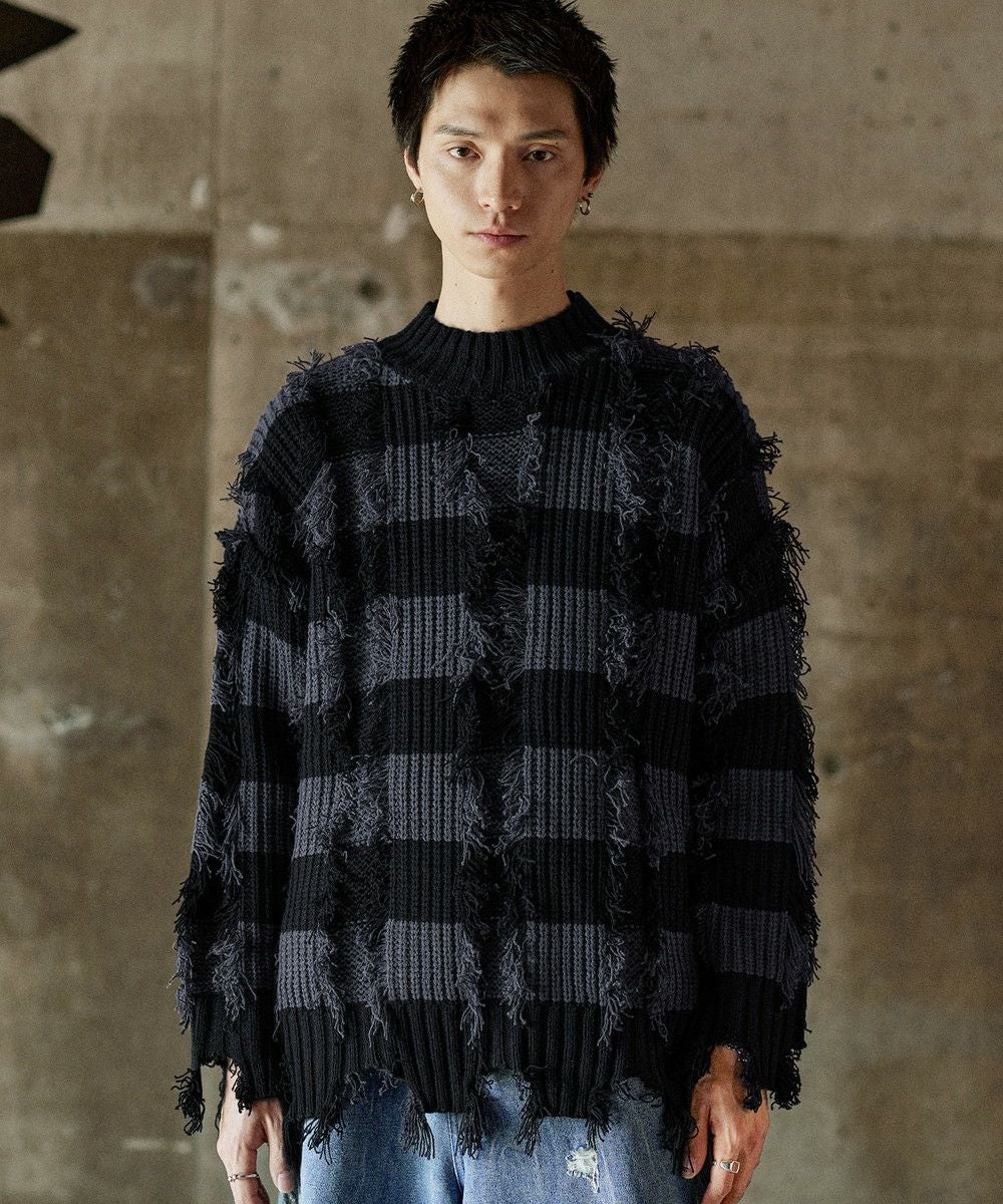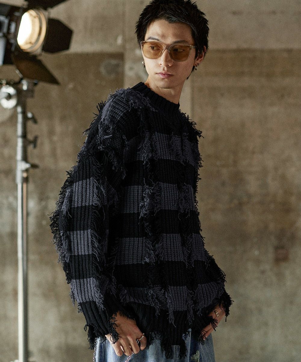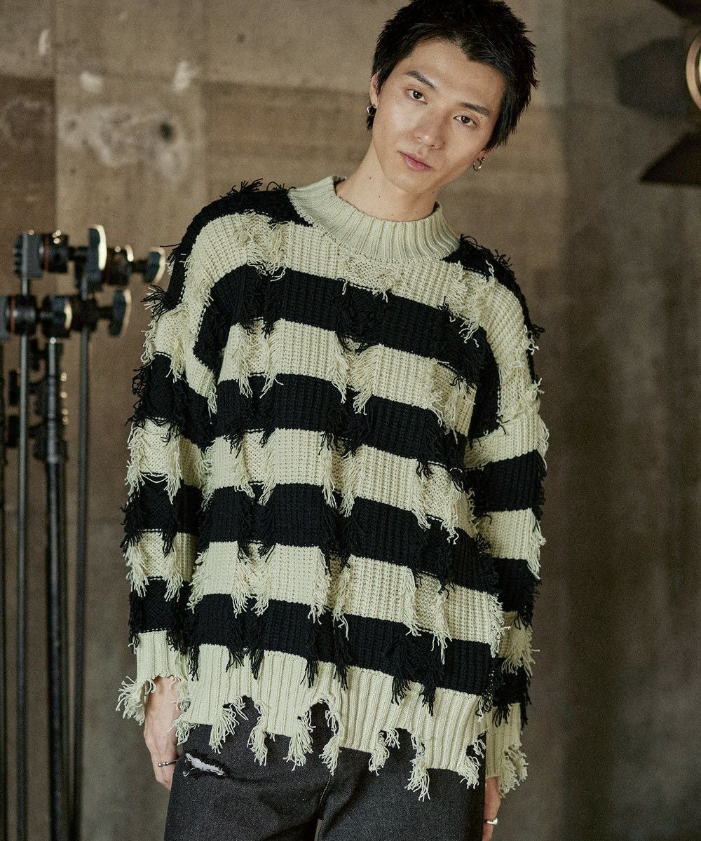 ダメージ加工と随所に施されたフリンジデザインが印象的なボーダーニット。裾や袖口のダメージ加工とインパクトのある太めのボーダーが存在感を発揮してくれる1着です。ざっくりとした編み地に加え、ゆとりのあるオーバーサイズシルエットとドロップショルダーが抜け感をプラス。デザイン性が高く主役感のあるボーダーニットは、1枚で着こなしの幅を広げてくれるアイテムです。