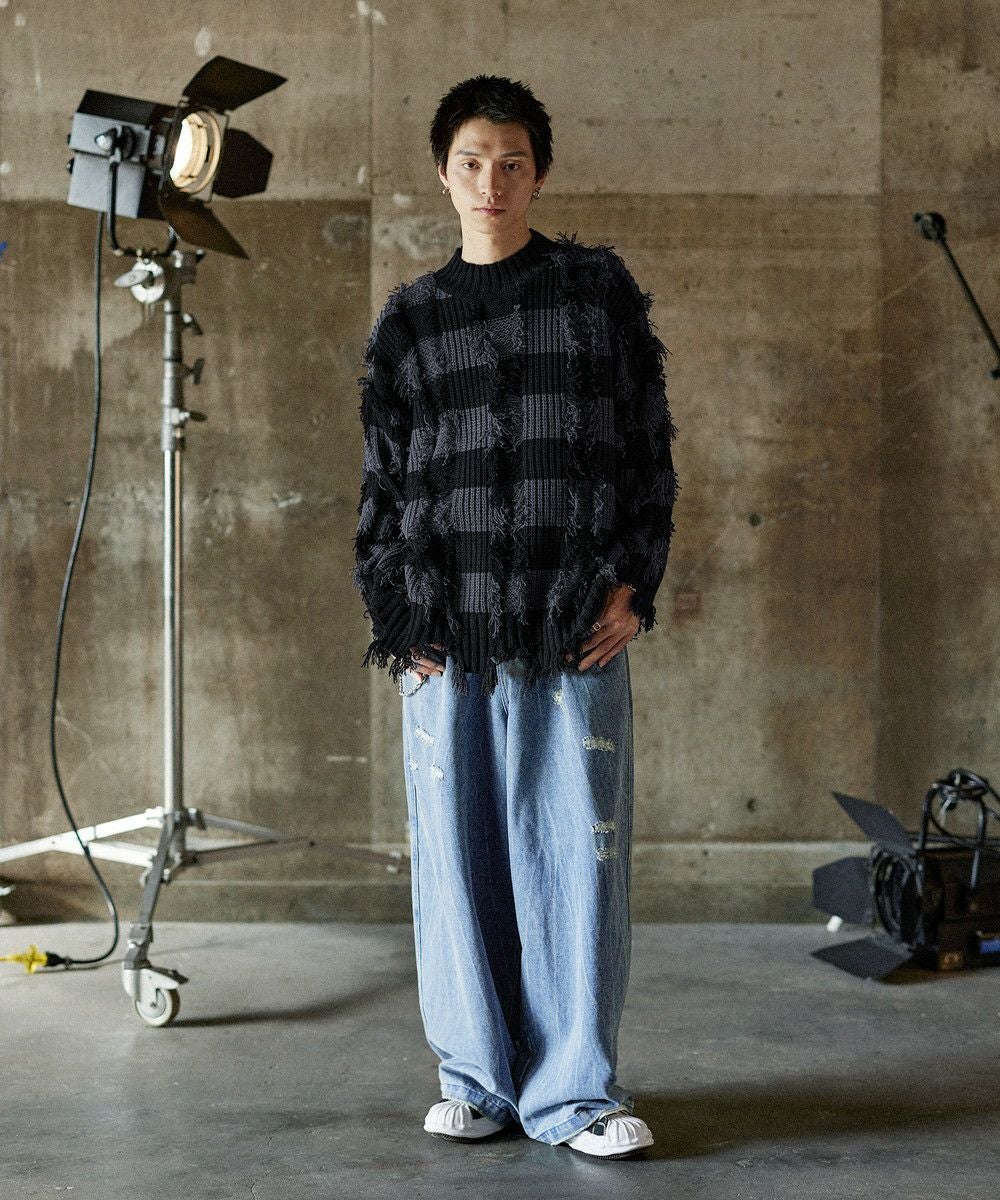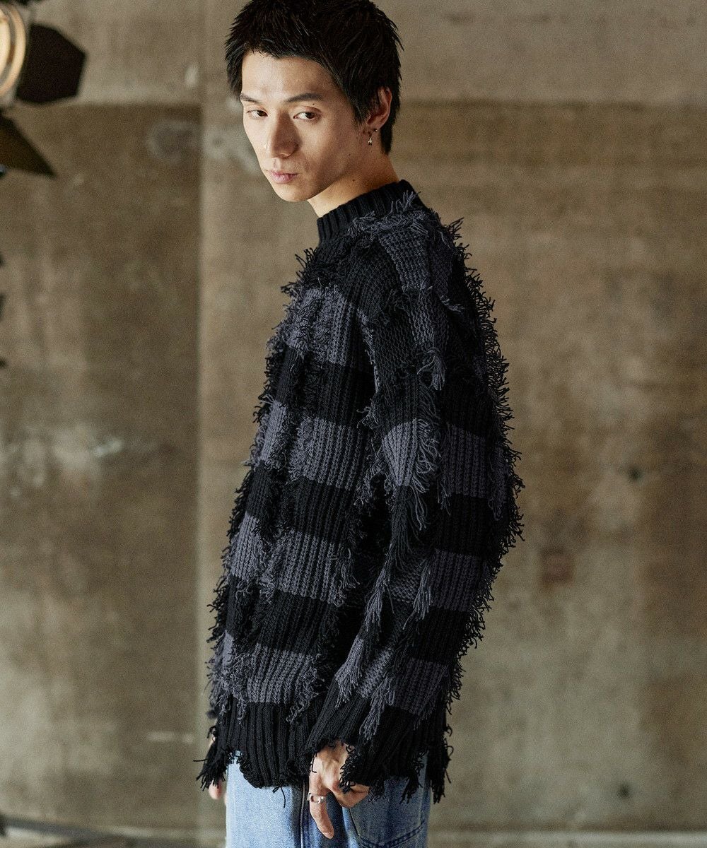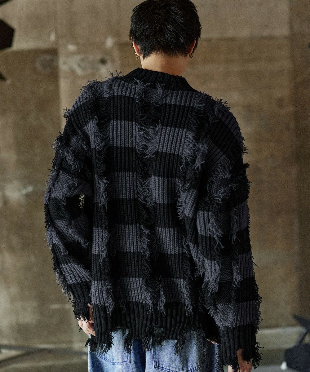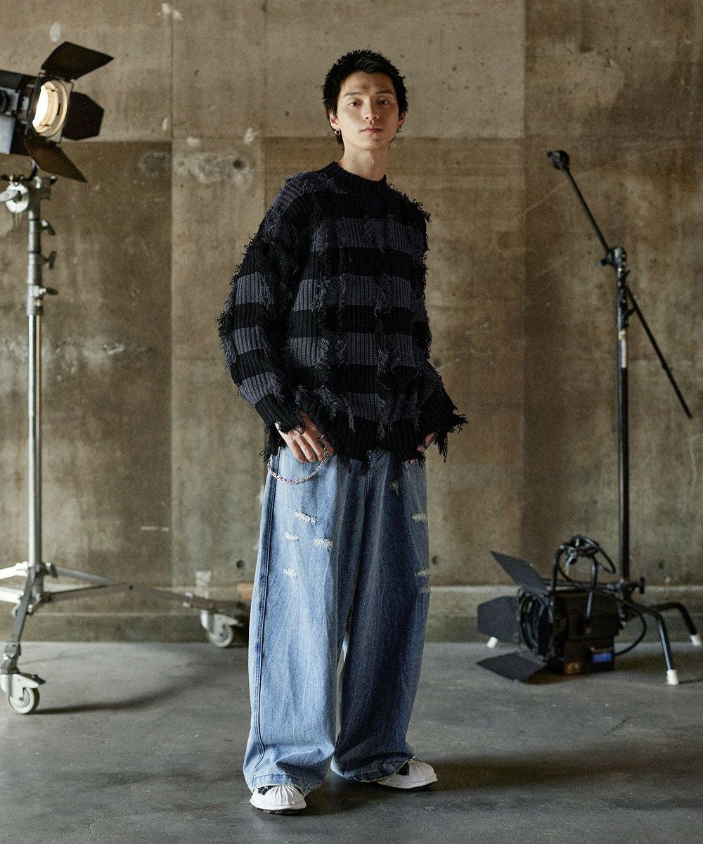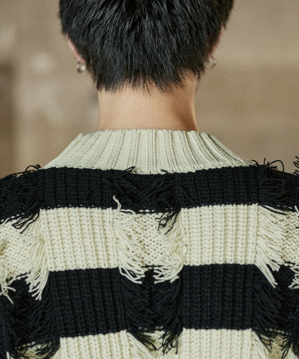 ダメージ加工と随所に施されたフリンジデザインが印象的なボーダーニット。裾や袖口のダメージ加工とインパクトのある太めのボーダーが存在感を発揮してくれる1着です。ざっくりとした編み地に加え、ゆとりのあるオーバーサイズシルエットとドロップショルダーが抜け感をプラス。デザイン性が高く主役感のあるボーダーニットは、1枚で着こなしの幅を広げてくれるアイテムです。