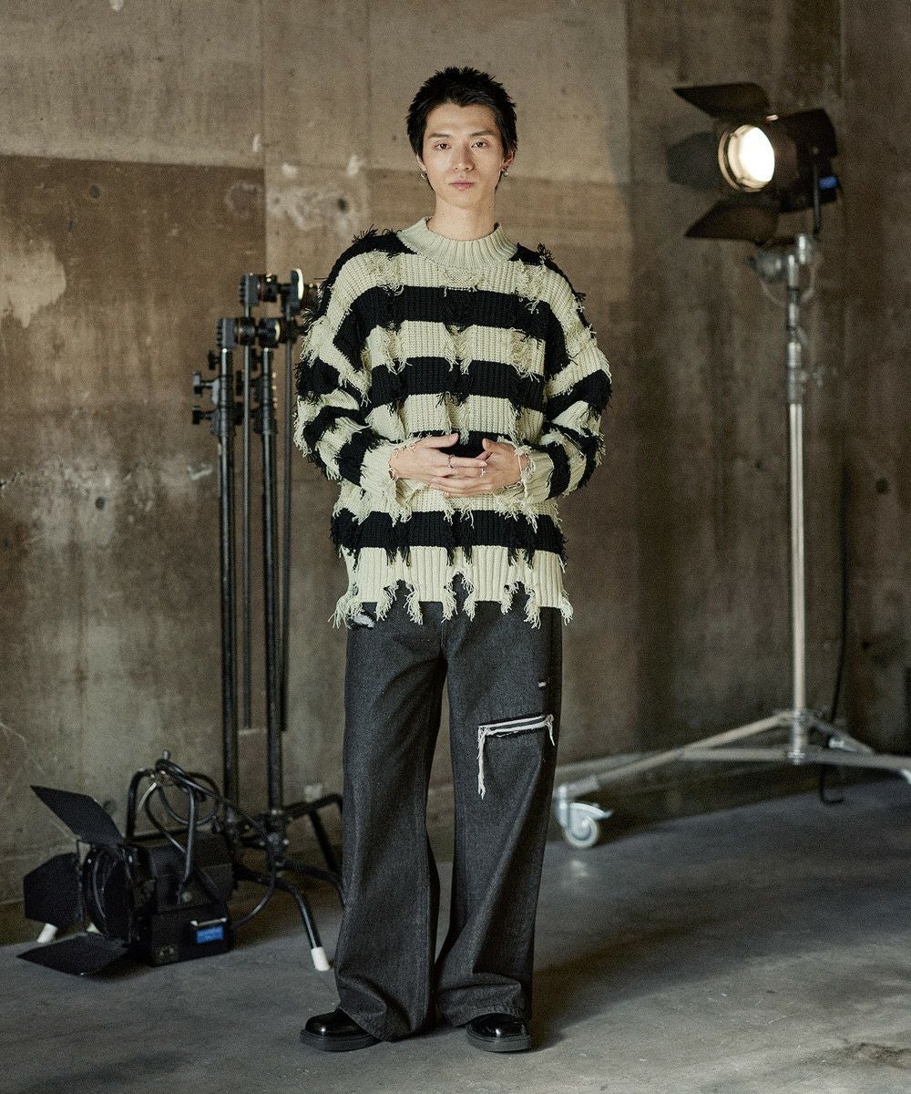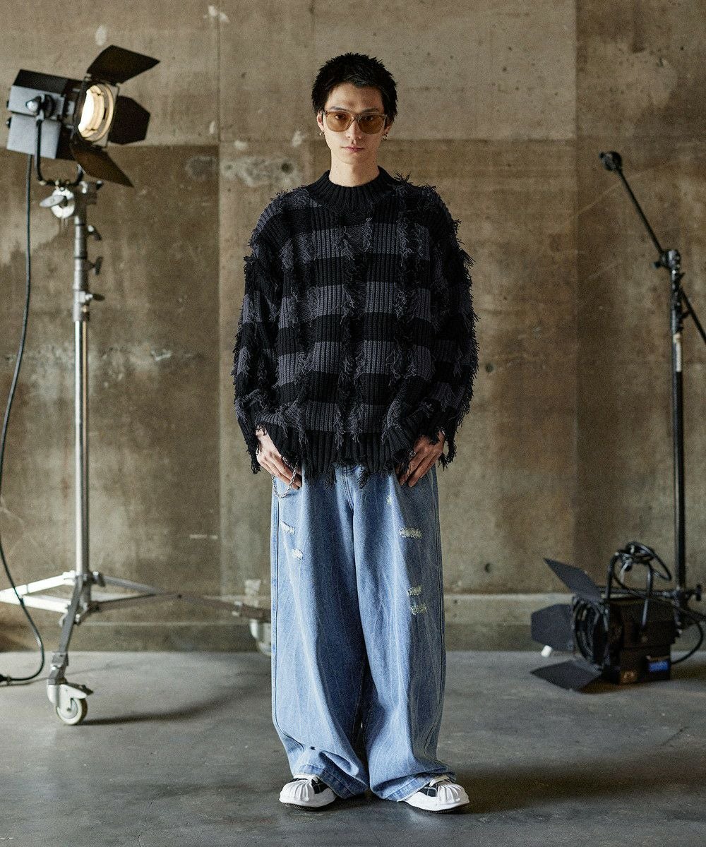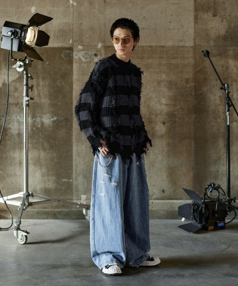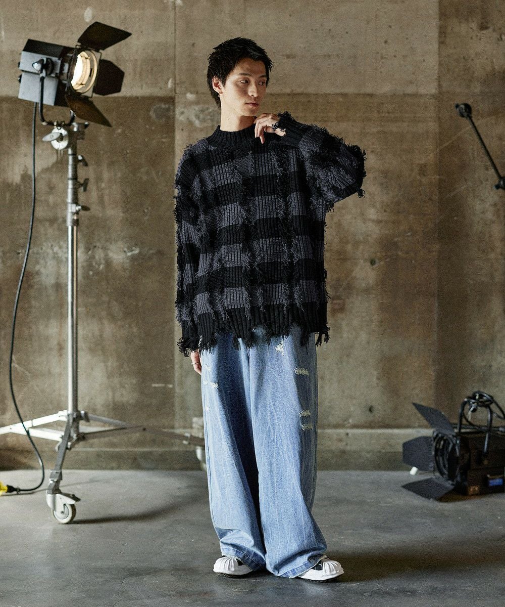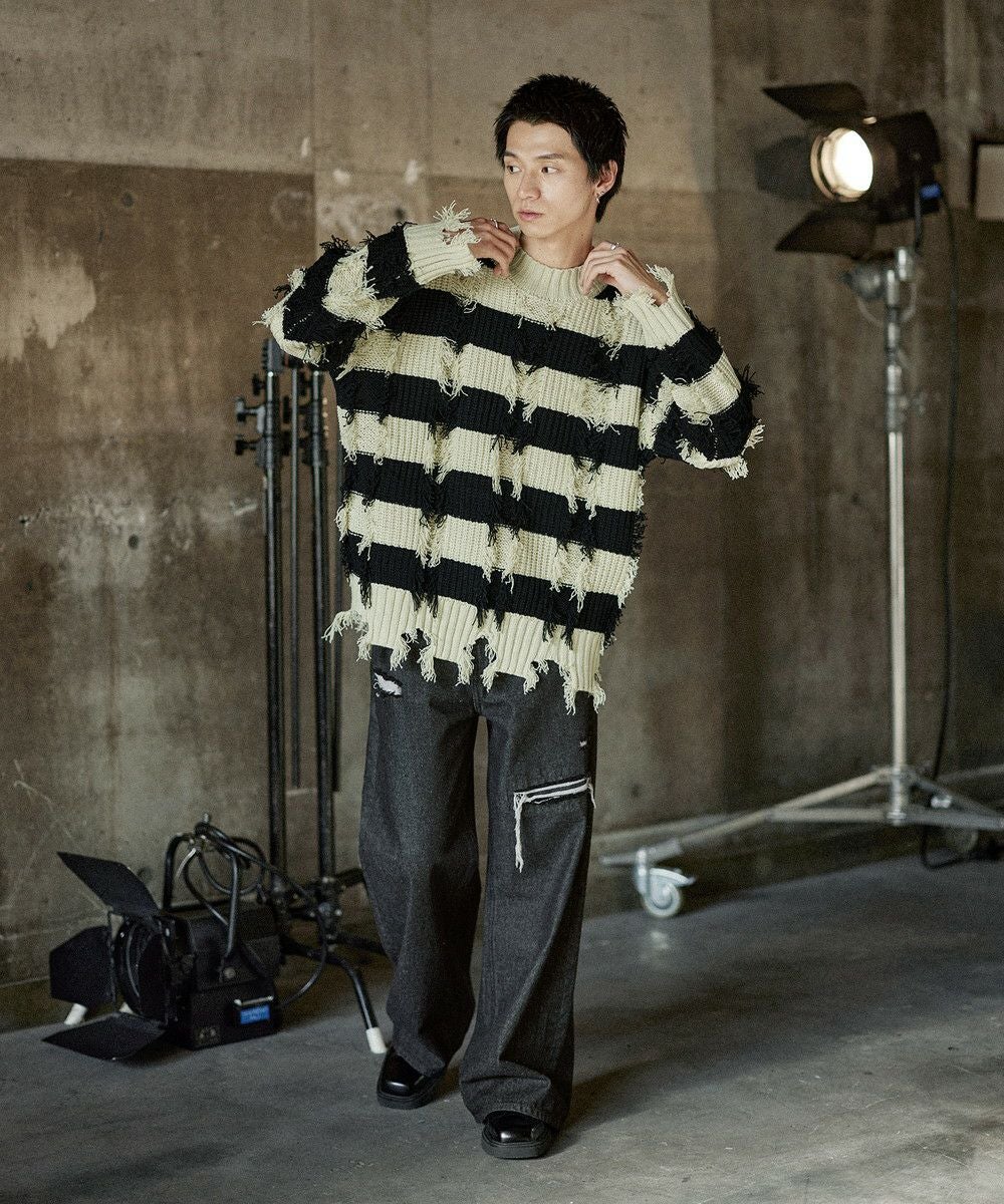 ダメージ加工と随所に施されたフリンジデザインが印象的なボーダーニット。裾や袖口のダメージ加工とインパクトのある太めのボーダーが存在感を発揮してくれる1着です。ざっくりとした編み地に加え、ゆとりのあるオーバーサイズシルエットとドロップショルダーが抜け感をプラス。デザイン性が高く主役感のあるボーダーニットは、1枚で着こなしの幅を広げてくれるアイテムです。