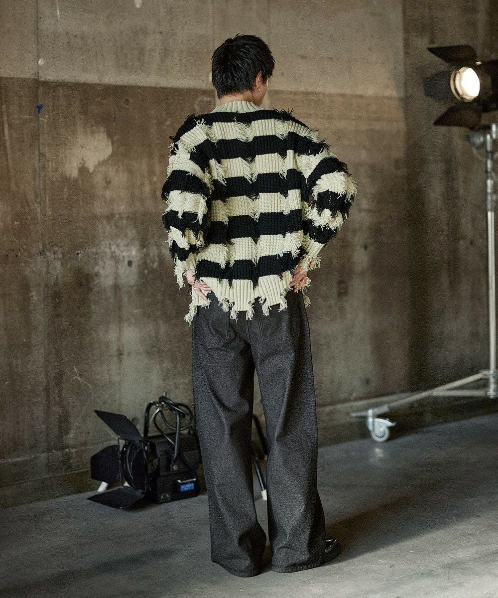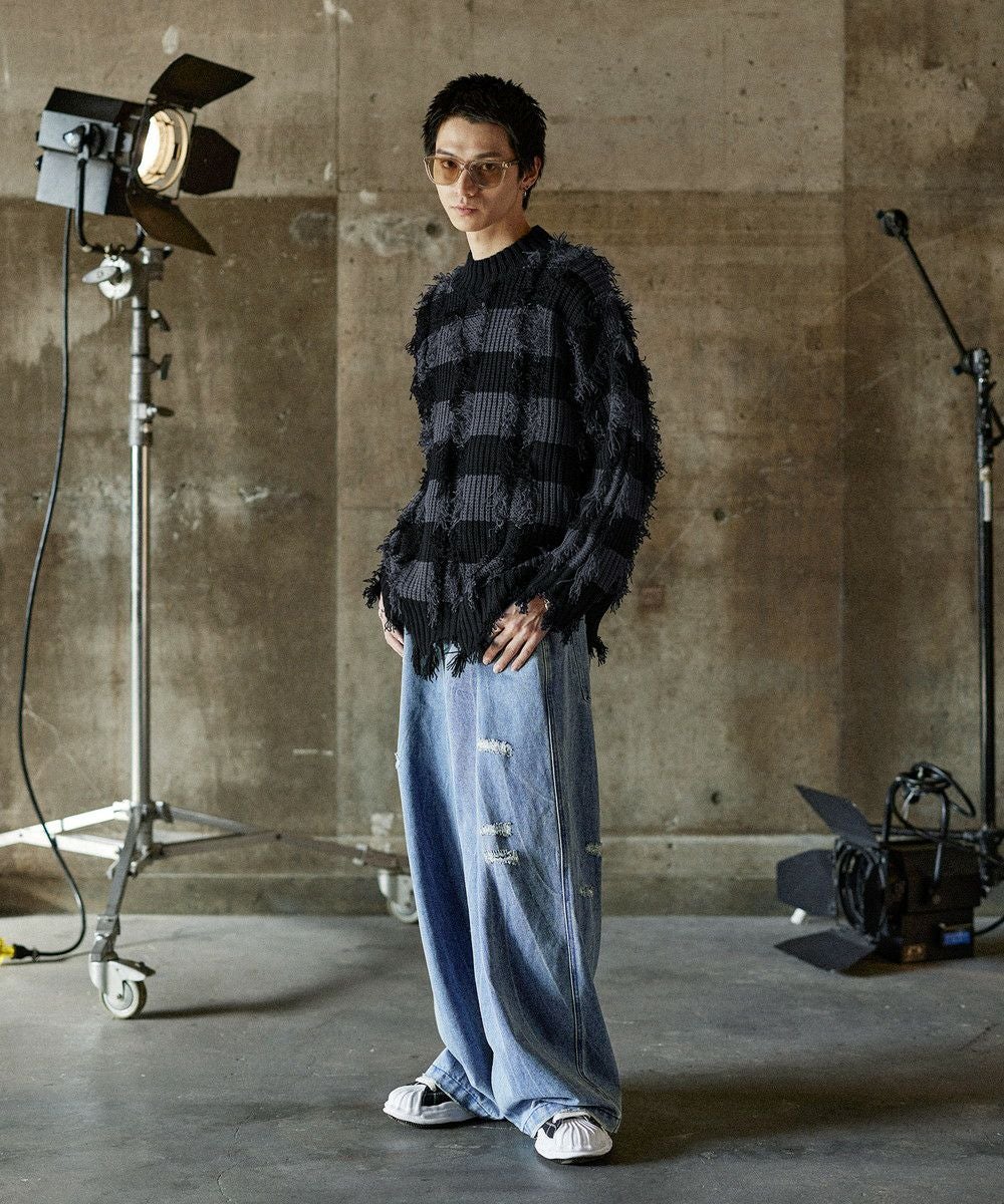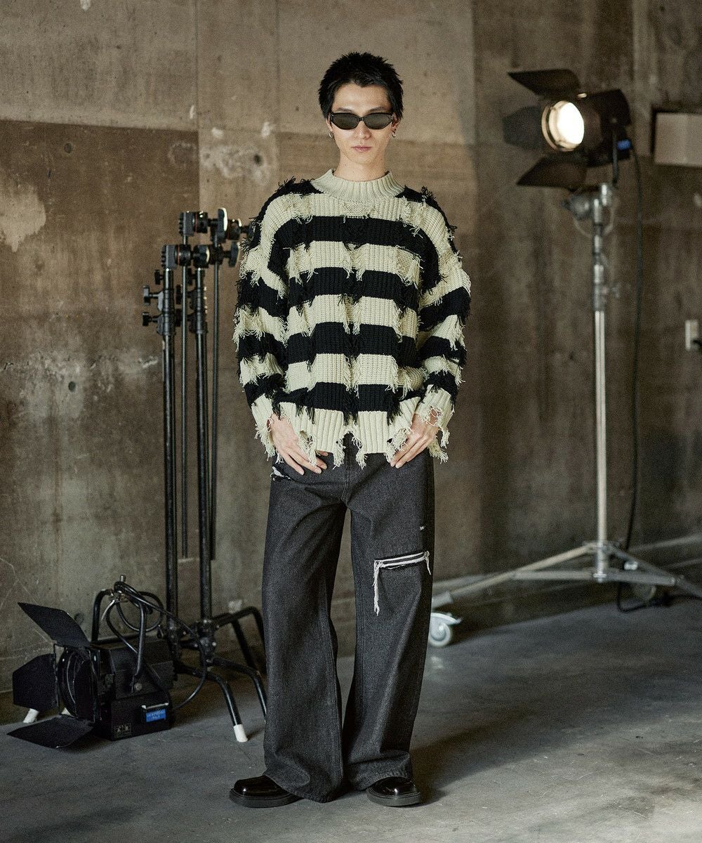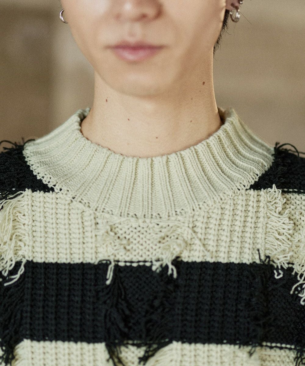 ダメージ加工と随所に施されたフリンジデザインが印象的なボーダーニット。裾や袖口のダメージ加工とインパクトのある太めのボーダーが存在感を発揮してくれる1着です。ざっくりとした編み地に加え、ゆとりのあるオーバーサイズシルエットとドロップショルダーが抜け感をプラス。デザイン性が高く主役感のあるボーダーニットは、1枚で着こなしの幅を広げてくれるアイテムです。