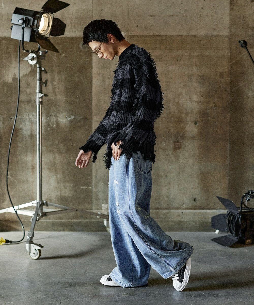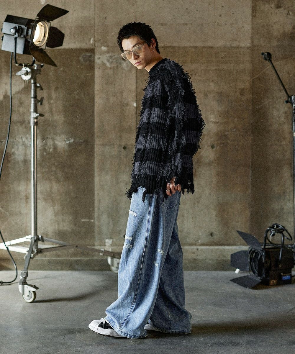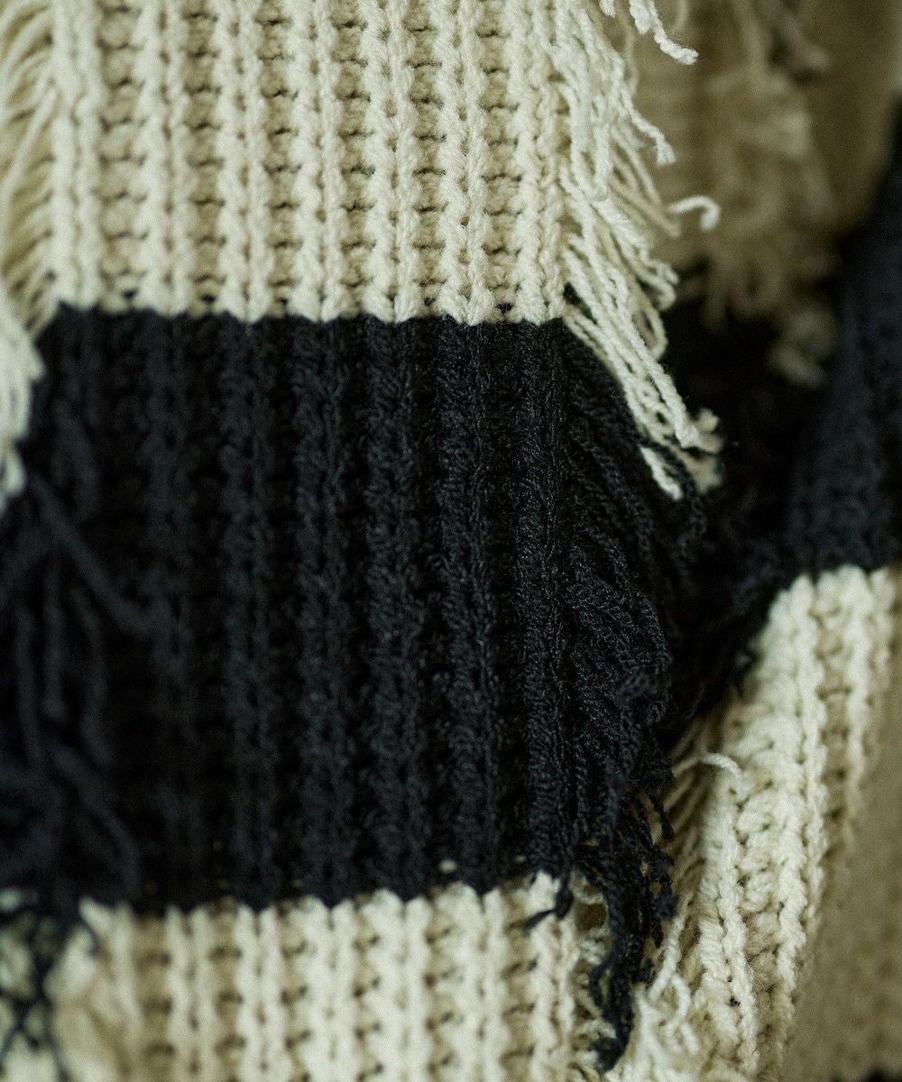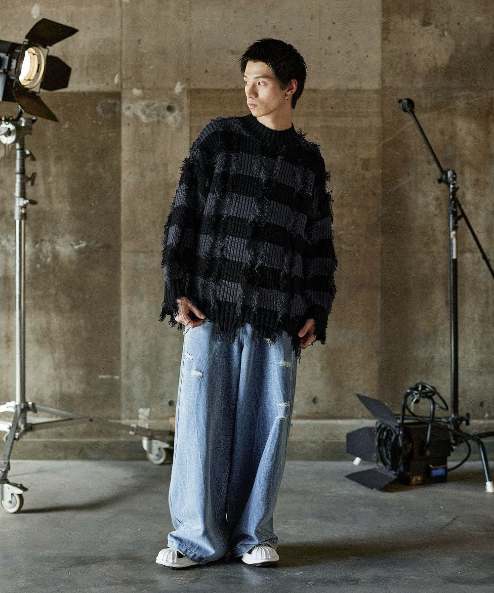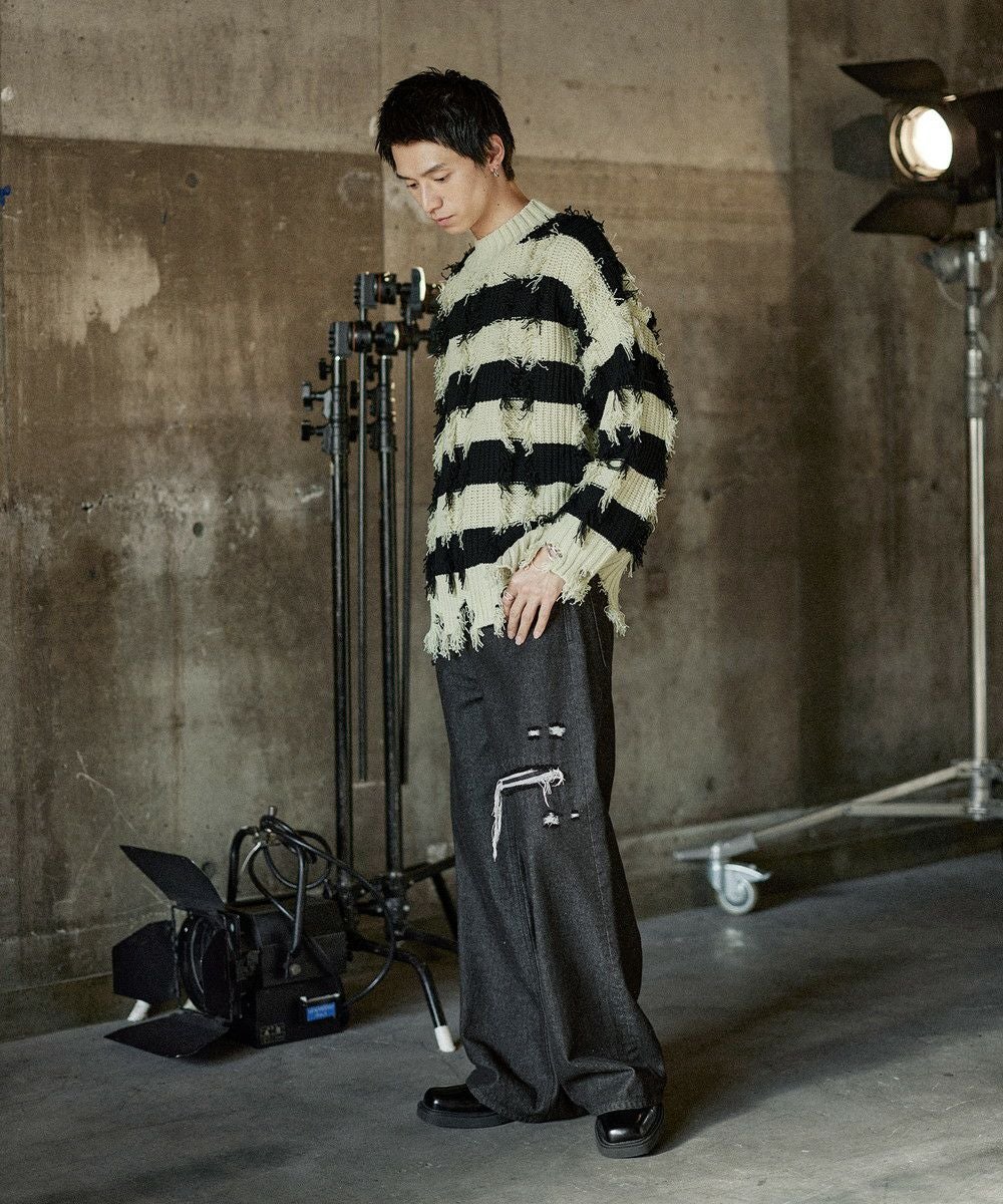ダメージ加工と随所に施されたフリンジデザインが印象的なボーダーニット。裾や袖口のダメージ加工とインパクトのある太めのボーダーが存在感を発揮してくれる1着です。ざっくりとした編み地に加え、ゆとりのあるオーバーサイズシルエットとドロップショルダーが抜け感をプラス。デザイン性が高く主役感のあるボーダーニットは、1枚で着こなしの幅を広げてくれるアイテムです。