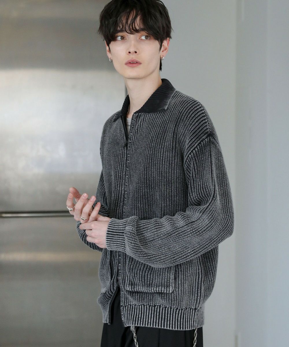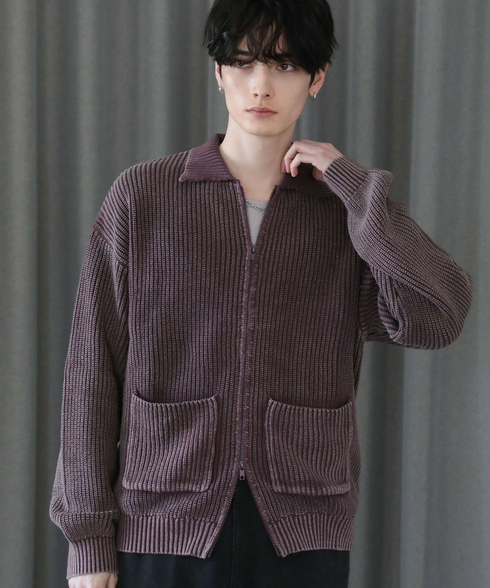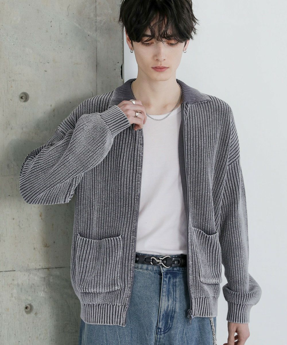 ヴィンテージ感のある風合いが魅力のカーディガン。ピグメント加工により独特の色褪せ感やムラ感を作り、古着のような雰囲気を演出しました。前を閉めればトップスとして、開けて着ればライトアウターとして使える万能アイテム。ダブルジップなので、下を開けてレイヤードスタイルを作るなど自由自在に着こなせます。袖にボリュームを持たせたたまりシルエットや、フロントのポケットなどがコーディネートのアクセントに。裾と袖のリブも太めなのでコーディネートにメリハリをプラスしてくれます。トレンドライクなルーズシルエットで、シンプルなコーディネートでもこなれた雰囲気に仕上げてくれる一着です。