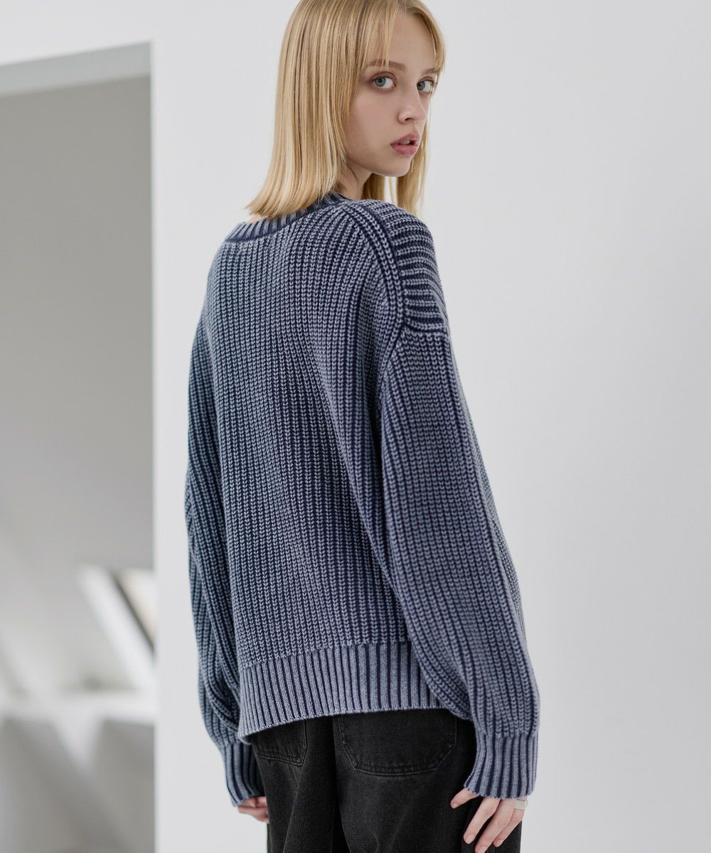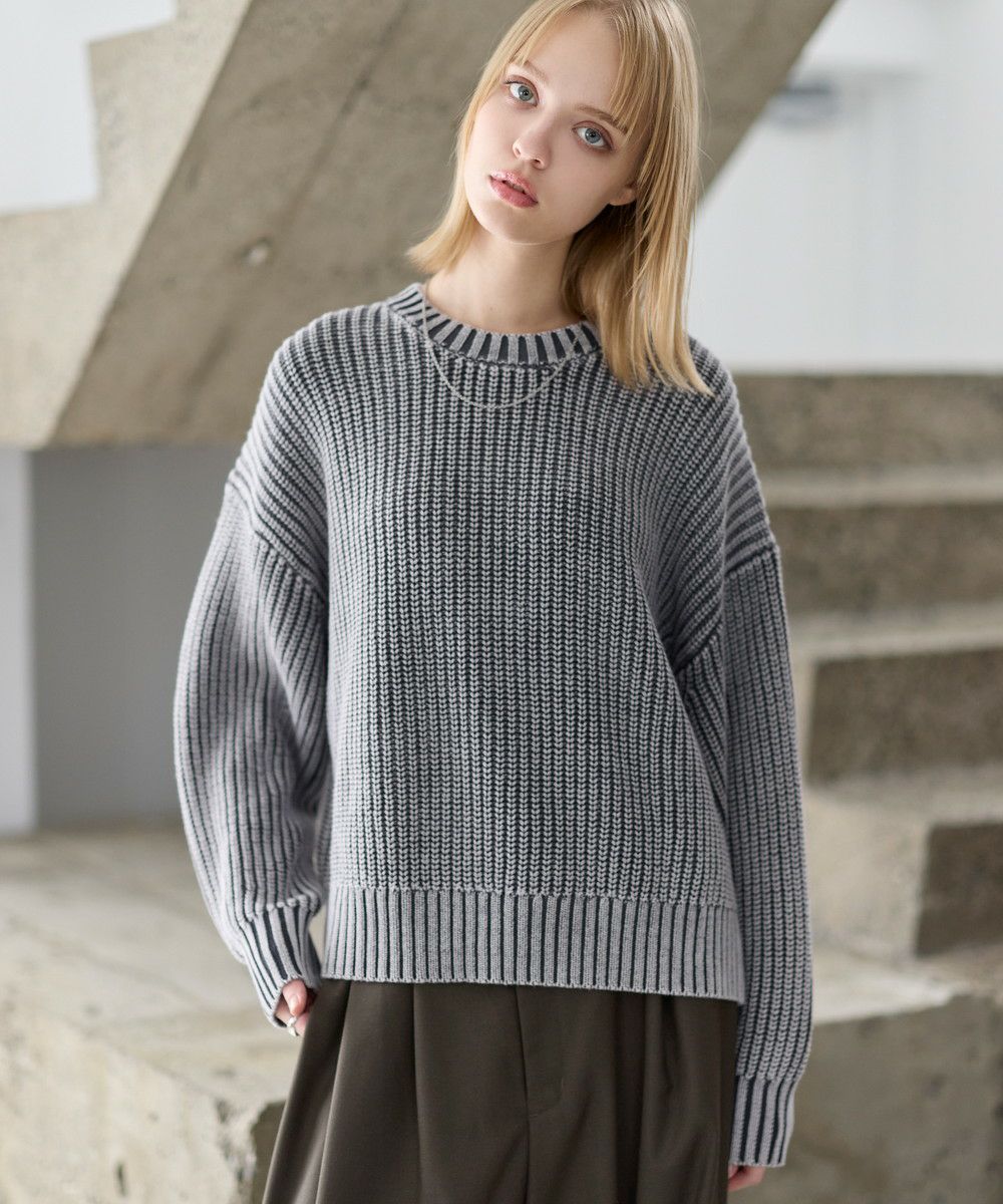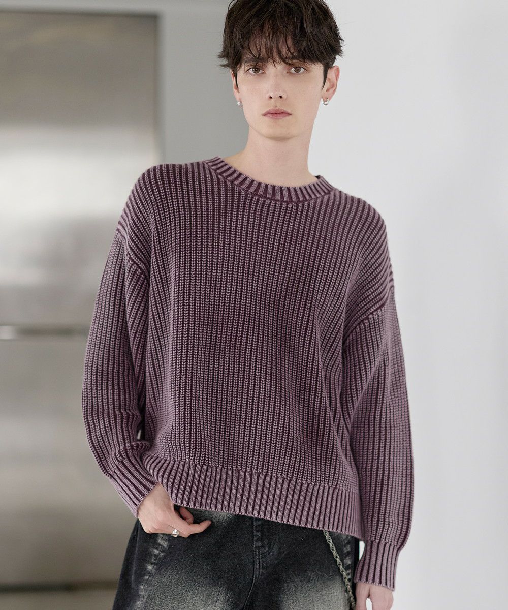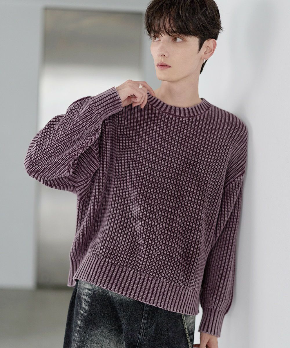 ピグメント加工がヴィンテージ感を醸す畦編みニット。ゆったりとした身幅とドロップショルダーがこなれた印象を生み出します。シンプルなクルーネックデザインでクセが無く、様々なアイテムと合わせて着用可能。着丈を短めに設定し、トレンドライクなシルエットに仕上げました。カラーは落ち着いたくすみカラーのブラック、グレー、ブルー、ワインの4色展開。表情のある生地感のため、1枚でもお洒落に着こなしていただけます。