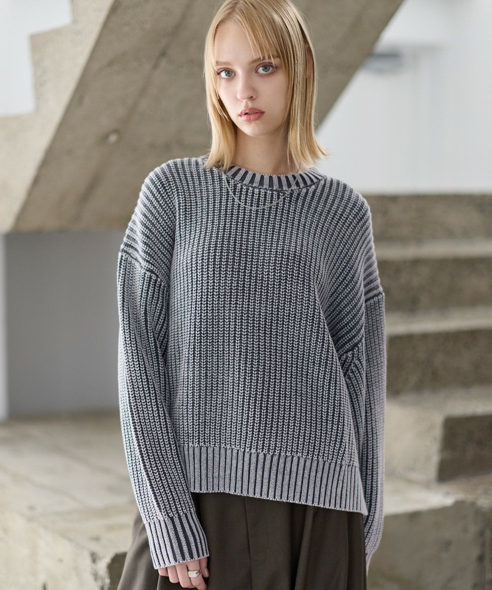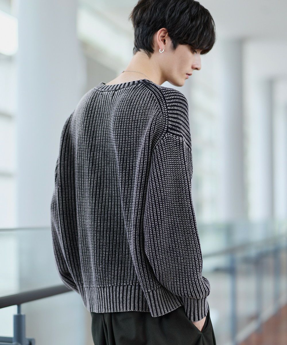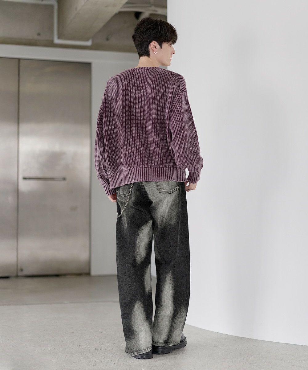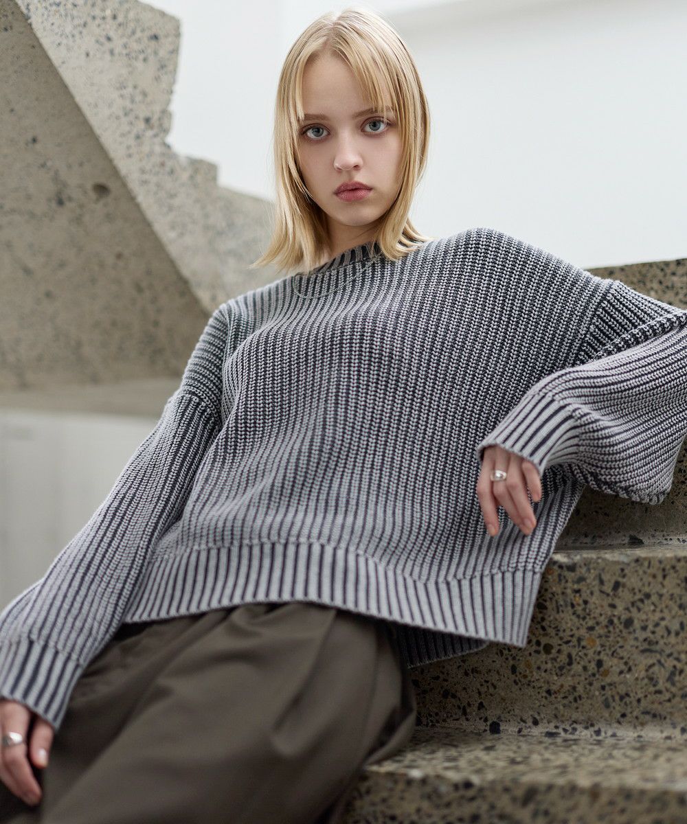 ピグメント加工がヴィンテージ感を醸す畦編みニット。ゆったりとした身幅とドロップショルダーがこなれた印象を生み出します。シンプルなクルーネックデザインでクセが無く、様々なアイテムと合わせて着用可能。着丈を短めに設定し、トレンドライクなシルエットに仕上げました。カラーは落ち着いたくすみカラーのブラック、グレー、ブルー、ワインの4色展開。表情のある生地感のため、1枚でもお洒落に着こなしていただけます。