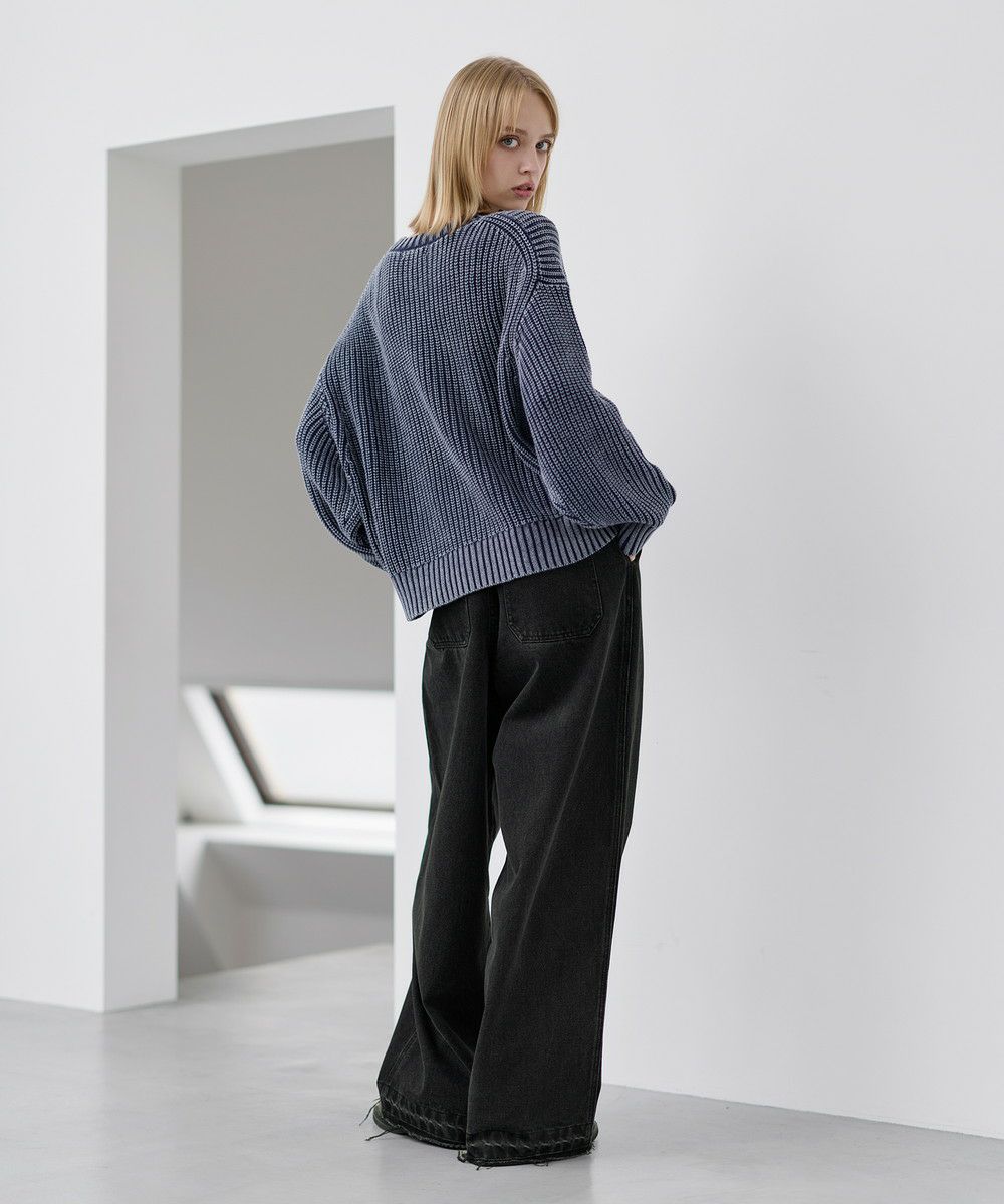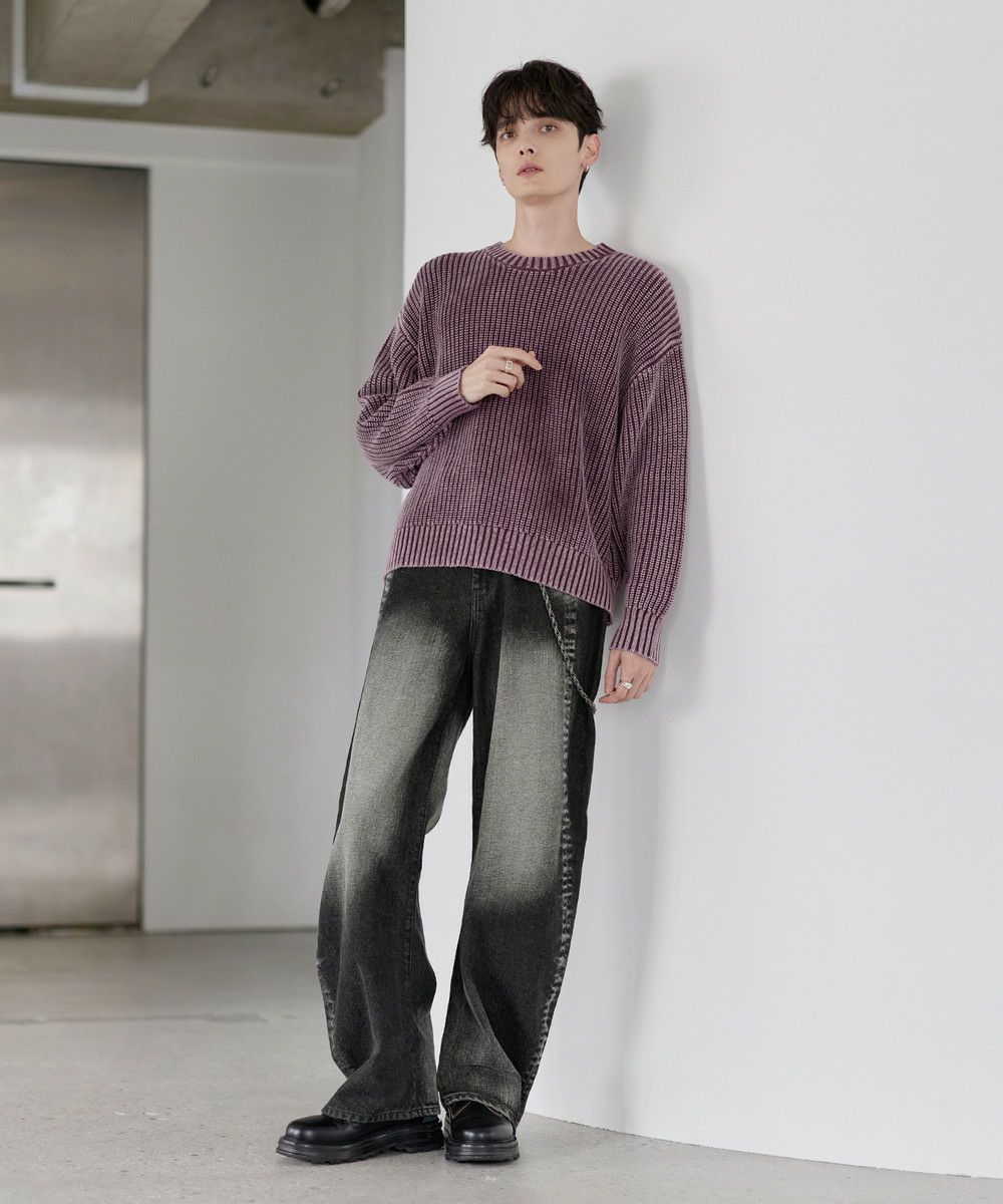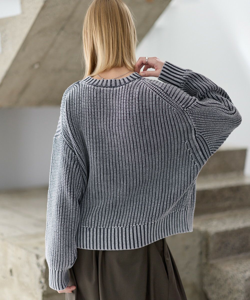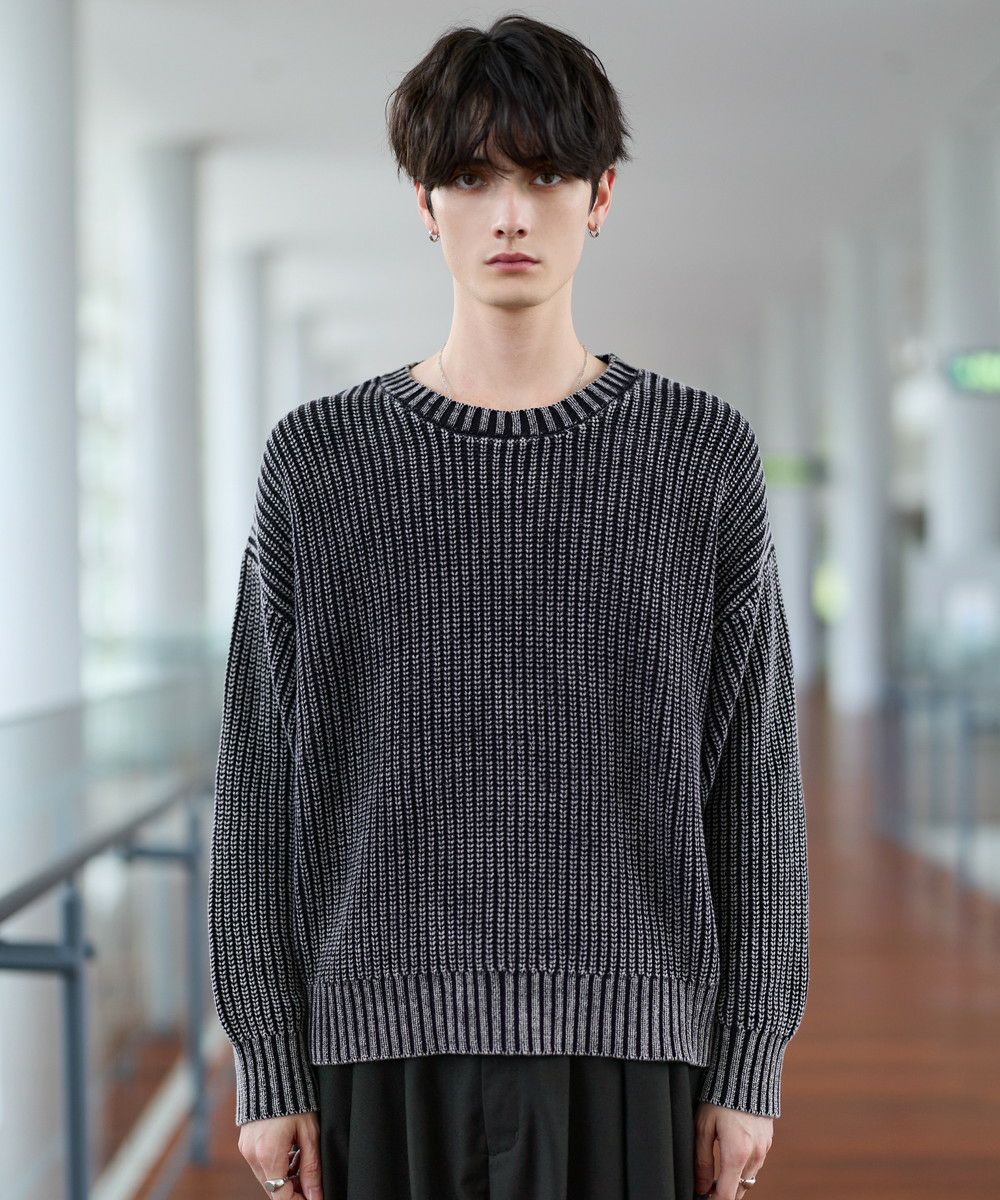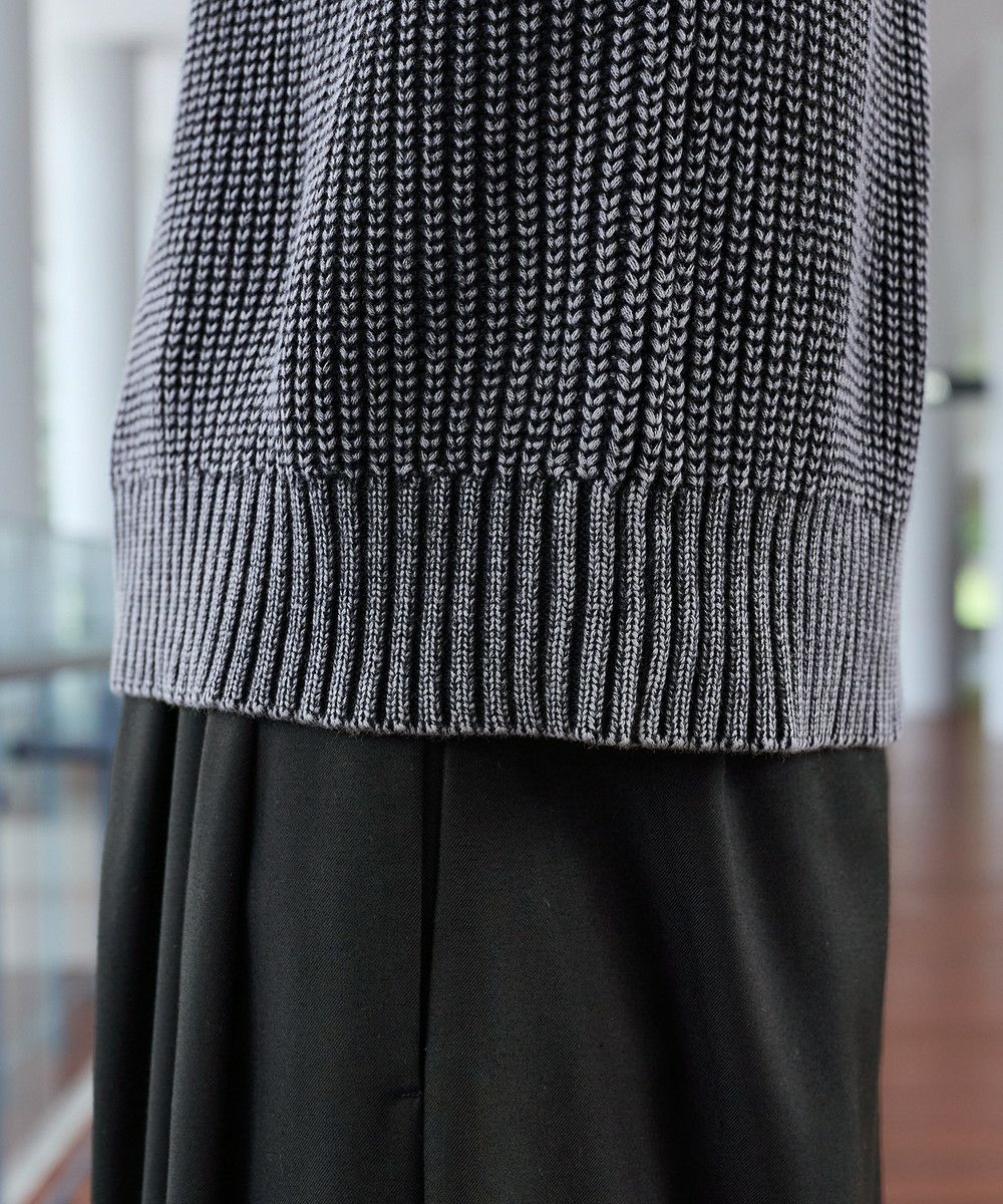 ピグメント加工がヴィンテージ感を醸す畦編みニット。ゆったりとした身幅とドロップショルダーがこなれた印象を生み出します。シンプルなクルーネックデザインでクセが無く、様々なアイテムと合わせて着用可能。着丈を短めに設定し、トレンドライクなシルエットに仕上げました。カラーは落ち着いたくすみカラーのブラック、グレー、ブルー、ワインの4色展開。表情のある生地感のため、1枚でもお洒落に着こなしていただけます。
