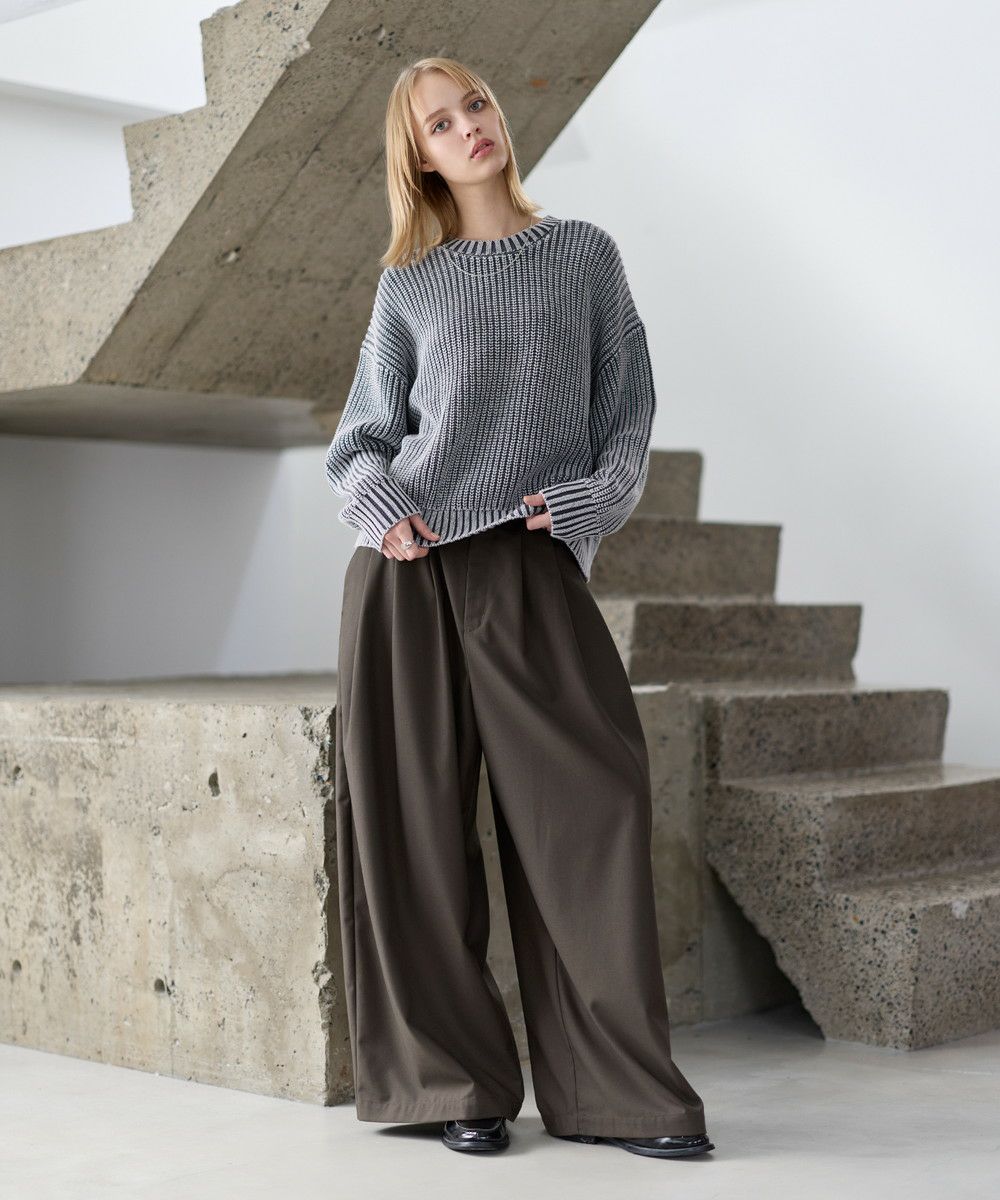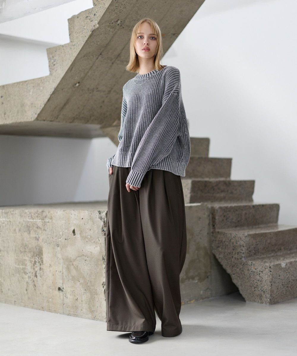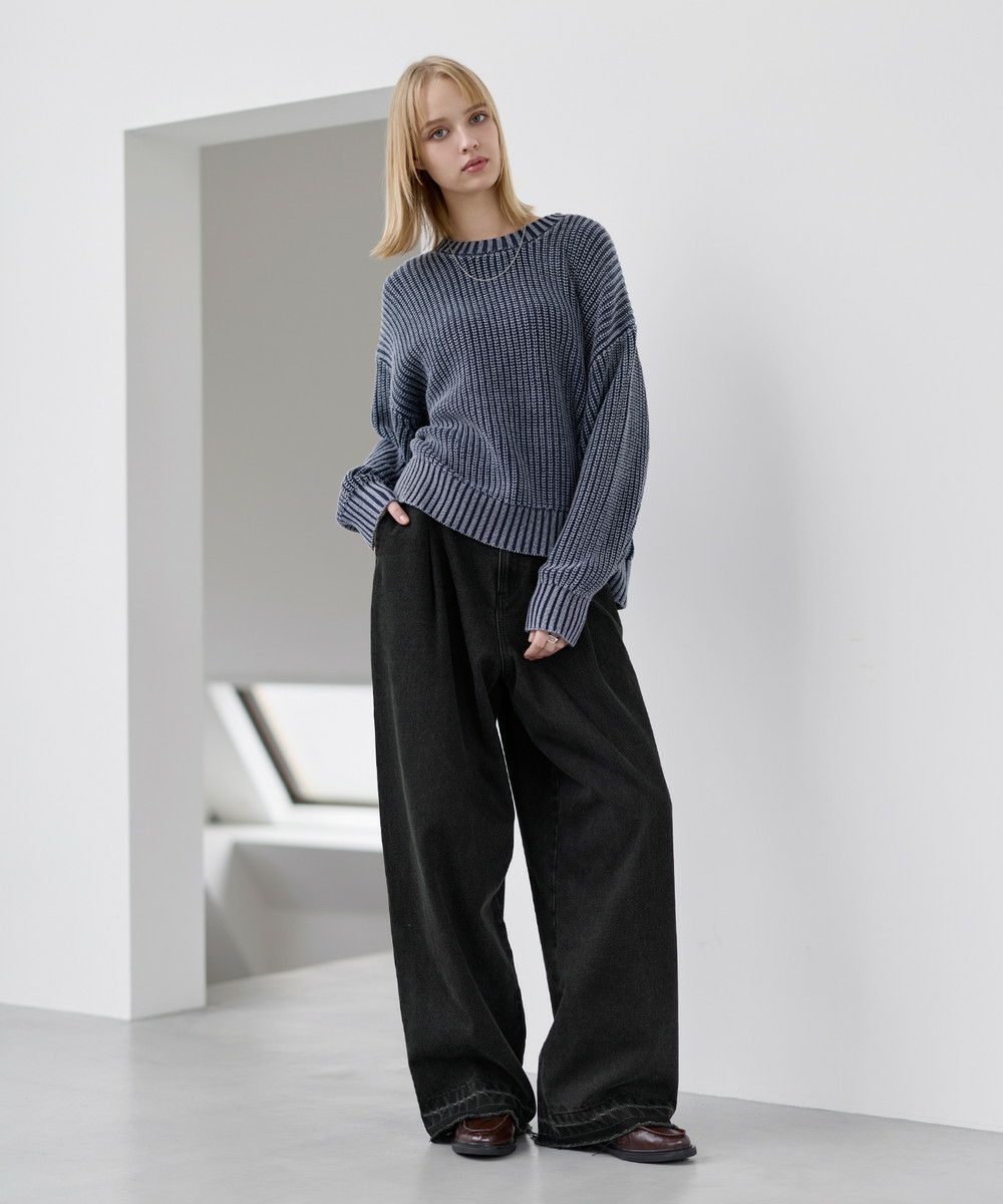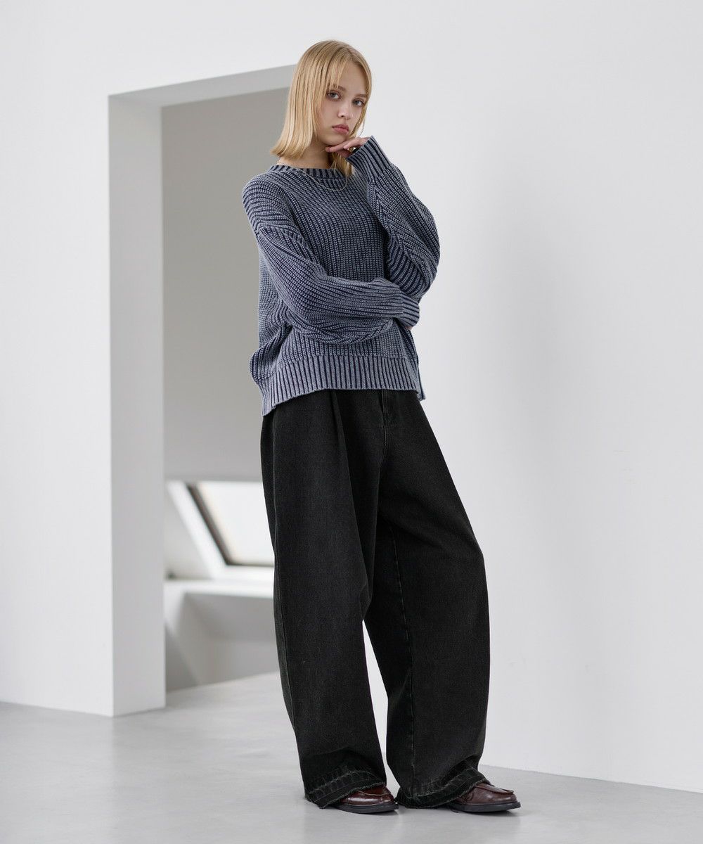 ピグメント加工がヴィンテージ感を醸す畦編みニット。ゆったりとした身幅とドロップショルダーがこなれた印象を生み出します。シンプルなクルーネックデザインでクセが無く、様々なアイテムと合わせて着用可能。着丈を短めに設定し、トレンドライクなシルエットに仕上げました。カラーは落ち着いたくすみカラーのブラック、グレー、ブルー、ワインの4色展開。表情のある生地感のため、1枚でもお洒落に着こなしていただけます。