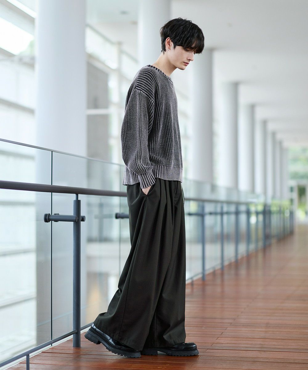 リラックス感のあるオーバーサイズアイテムなので、パンツもワイドなスラックスやデニムなどゆったり感のあるアイテムがおすすめです。やや短めの丈感に対してボディ周りをワイドに取ったシルエットがバランス良く、ボトムを選ばずデイリーに活躍します。