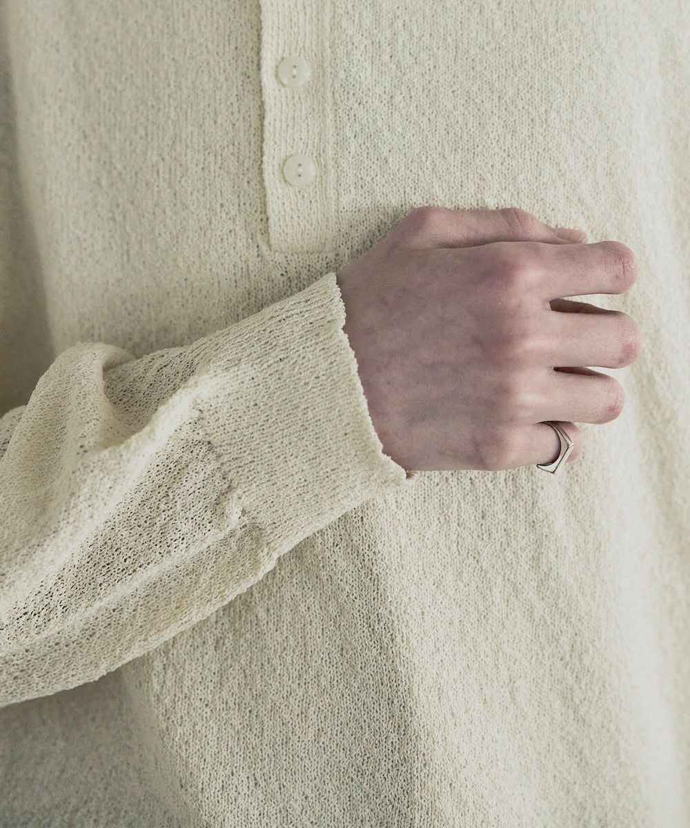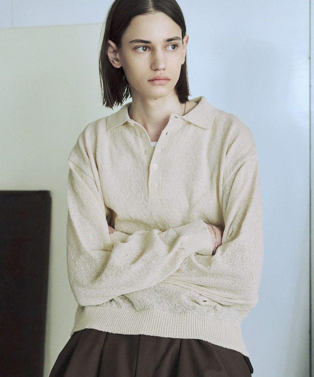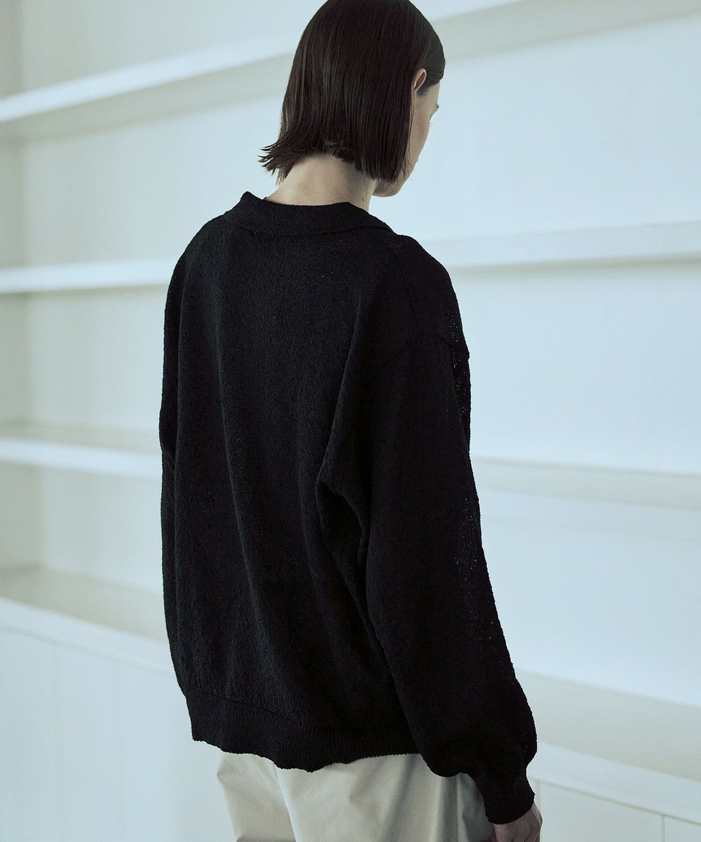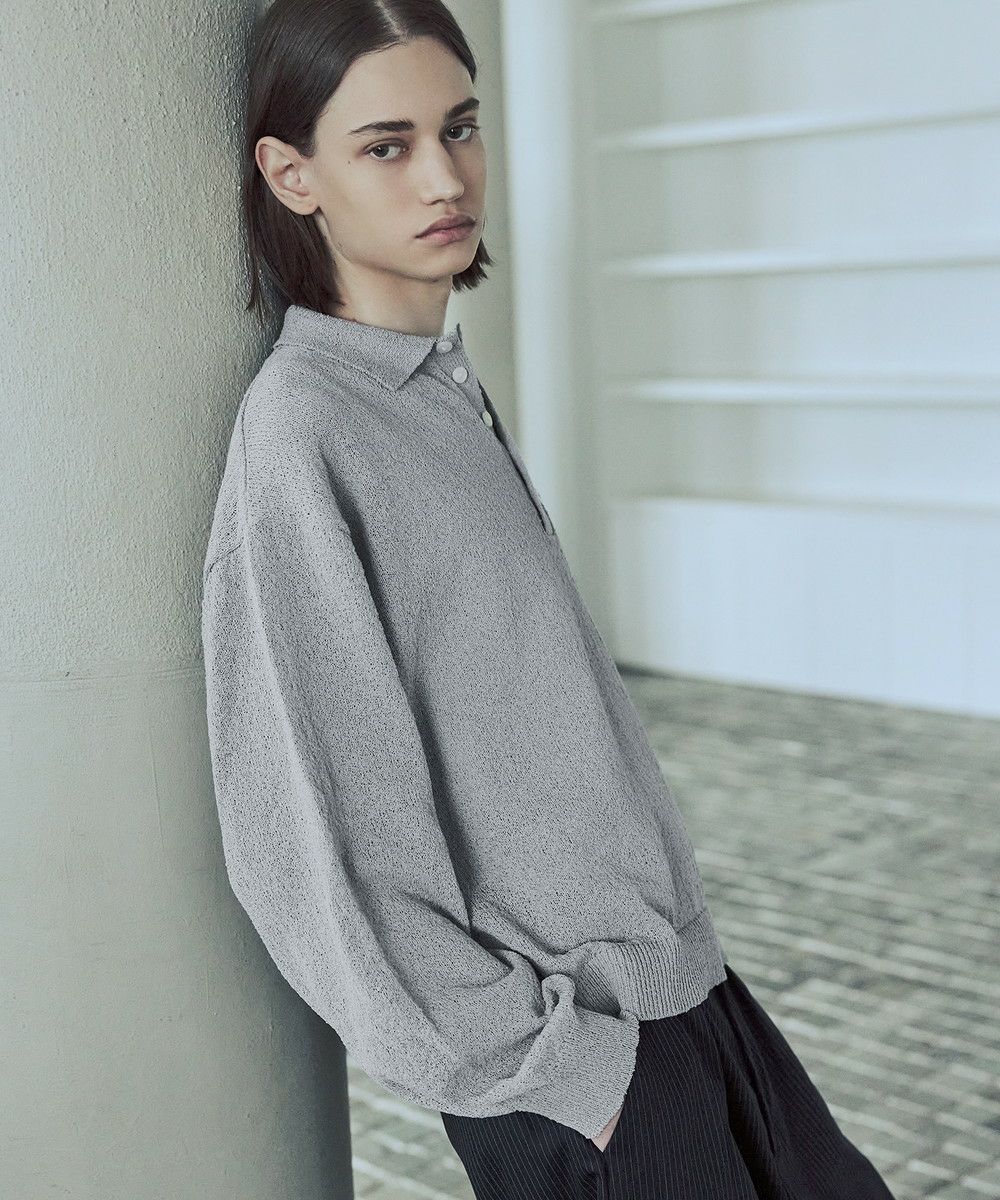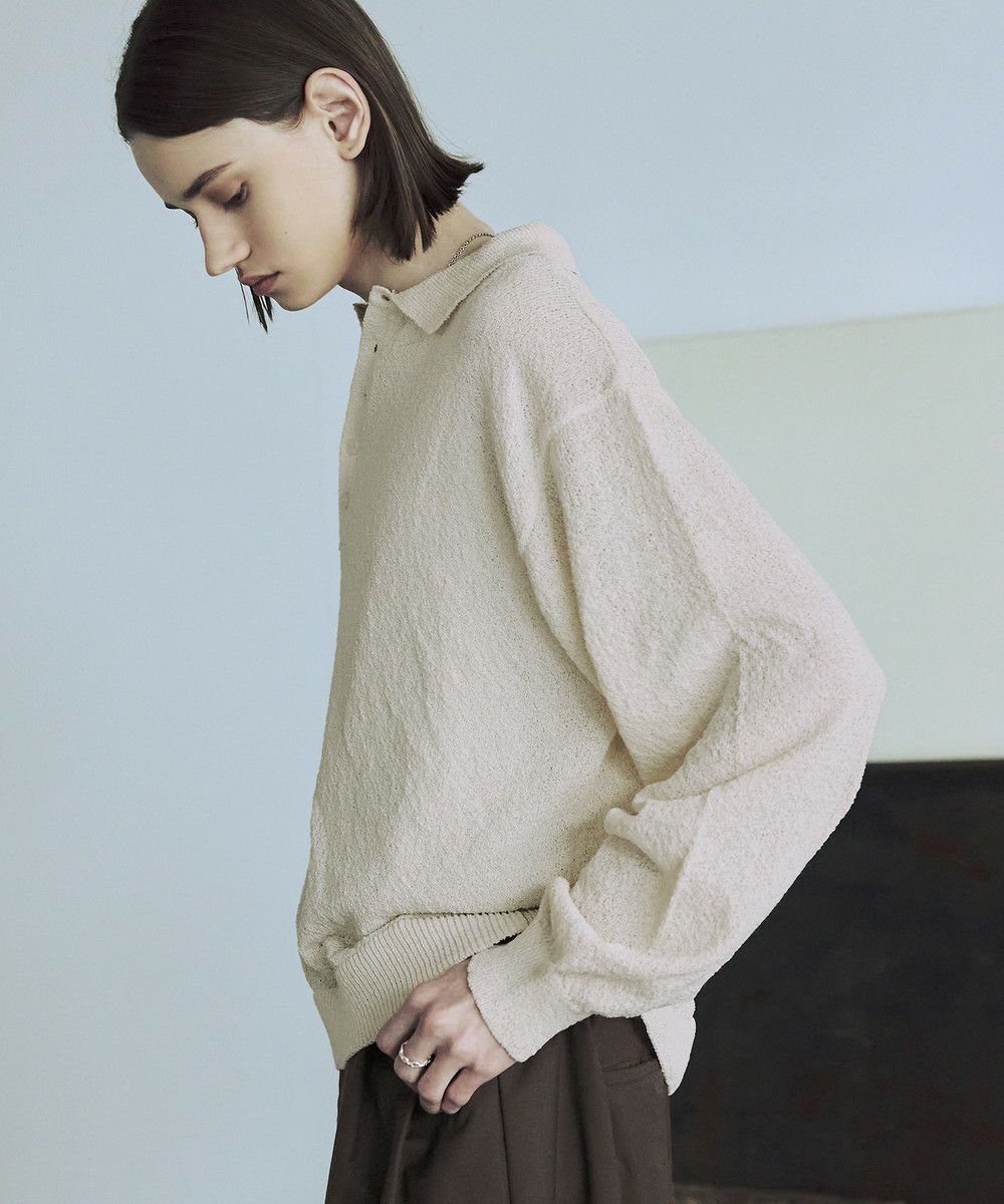 表情豊かなシアーブークレ生地で仕上げた襟付きヘンリーニット。ゆとりを持たせた身幅やアームホール、ドロップショルダーがリラックス感を演出しつつ、襟付きのデザインにすることでカジュアルすぎない品のある印象にまとめてくれます。丸みのある袖は袖口をリブで引き締めることで、だらしなく見えない絶妙なシルエットに。タンクトップとレイヤードして着用すると、上品な透け感がお洒落な着こなしを叶えます。