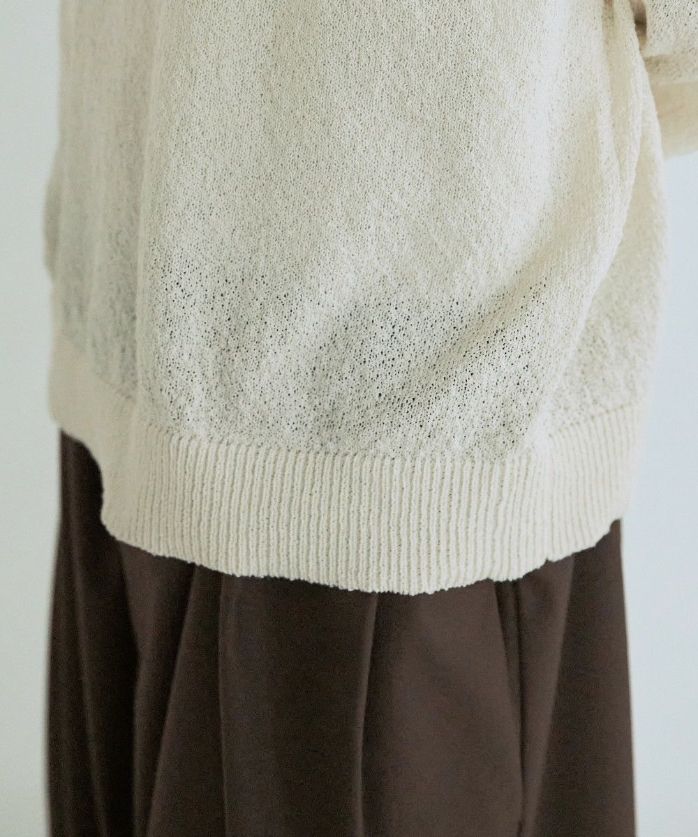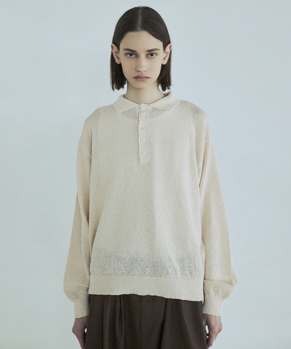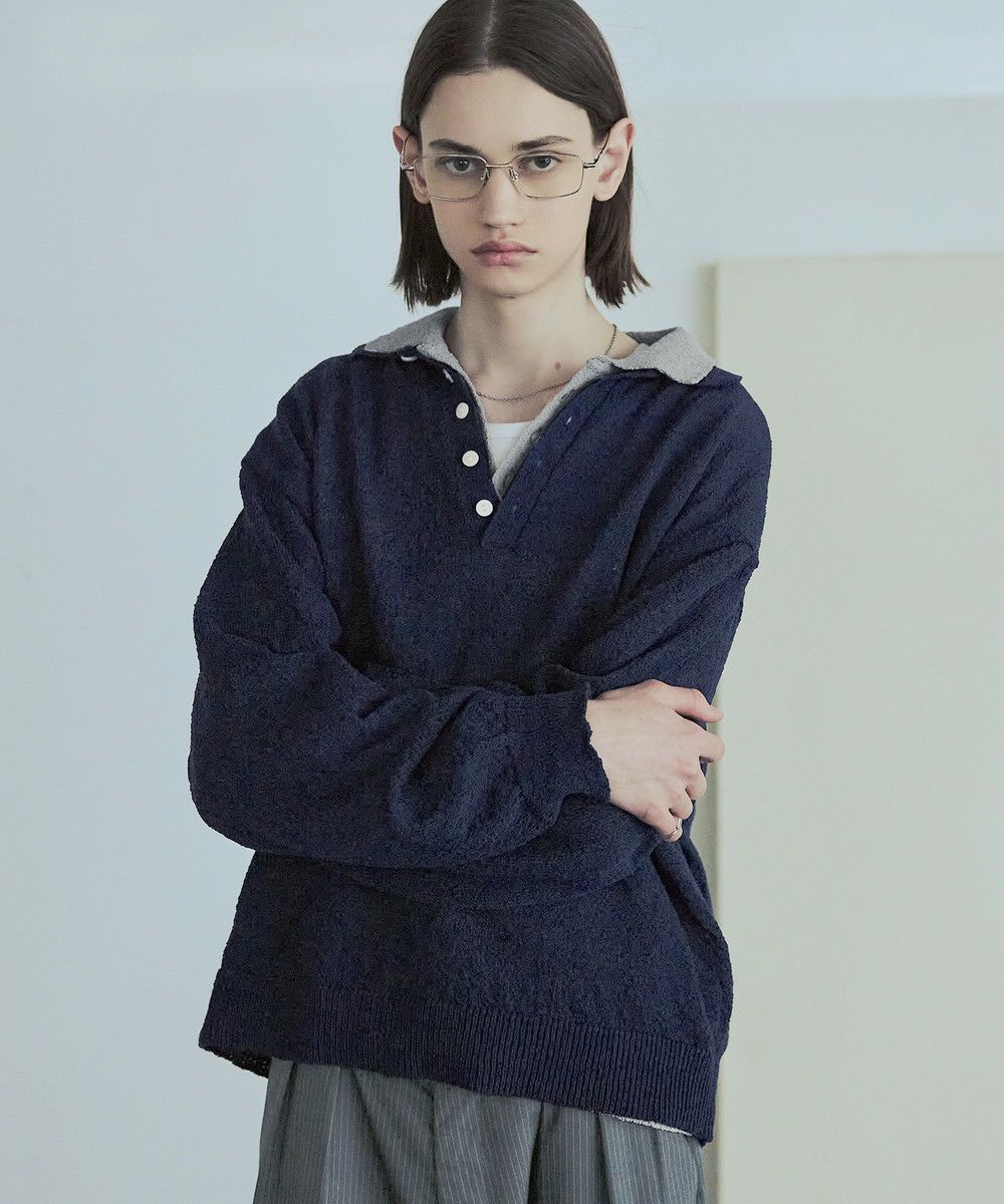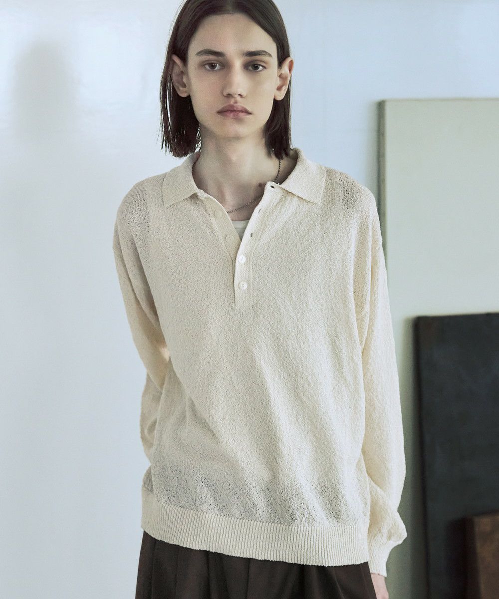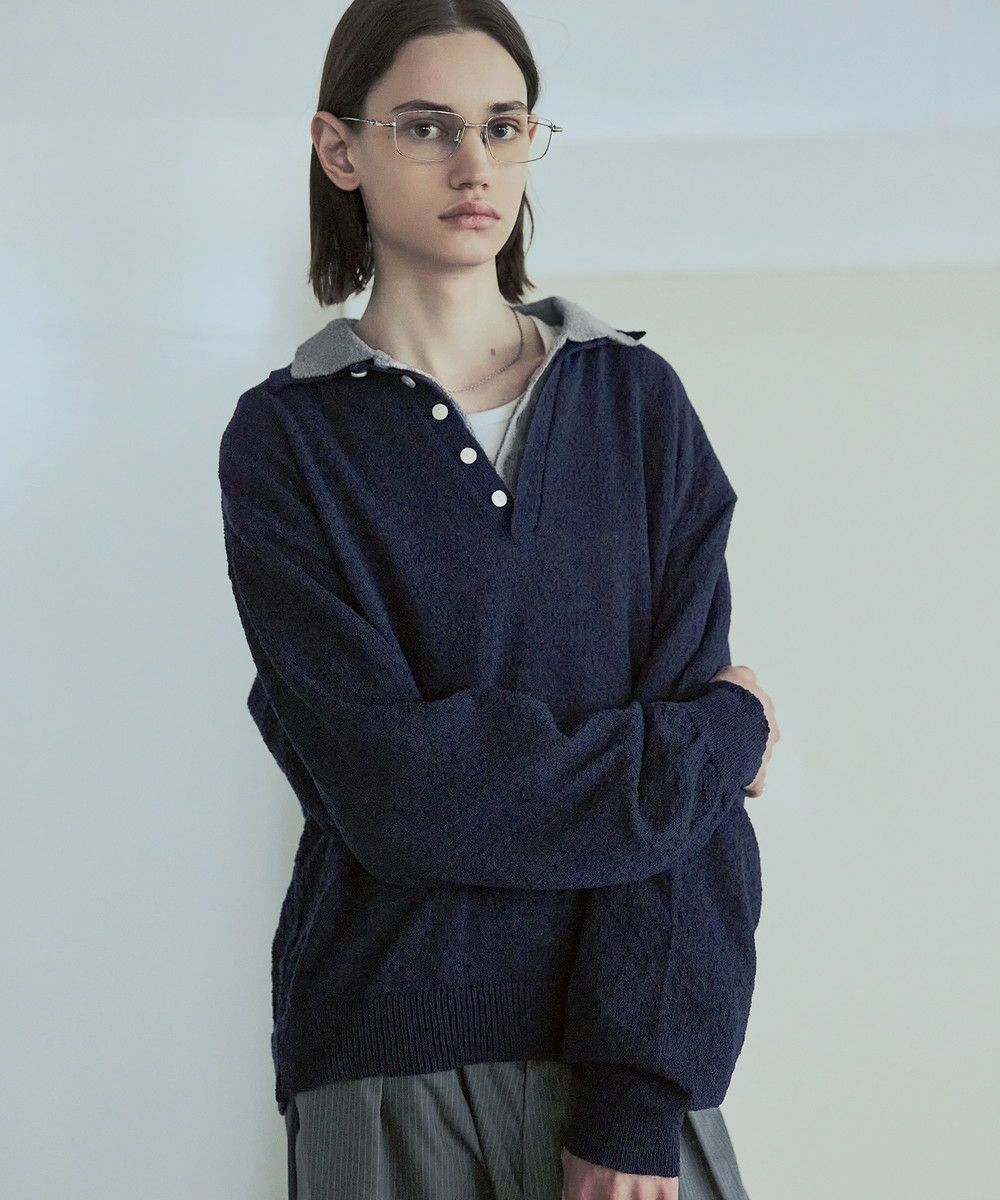 表情豊かなシアーブークレ生地で仕上げた襟付きヘンリーニット。ゆとりを持たせた身幅やアームホール、ドロップショルダーがリラックス感を演出しつつ、襟付きのデザインにすることでカジュアルすぎない品のある印象にまとめてくれます。丸みのある袖は袖口をリブで引き締めることで、だらしなく見えない絶妙なシルエットに。タンクトップとレイヤードして着用すると、上品な透け感がお洒落な着こなしを叶えます。