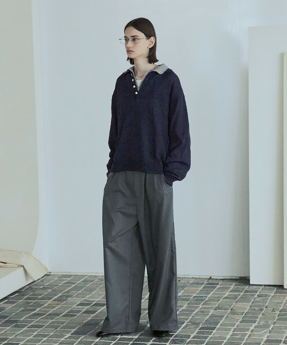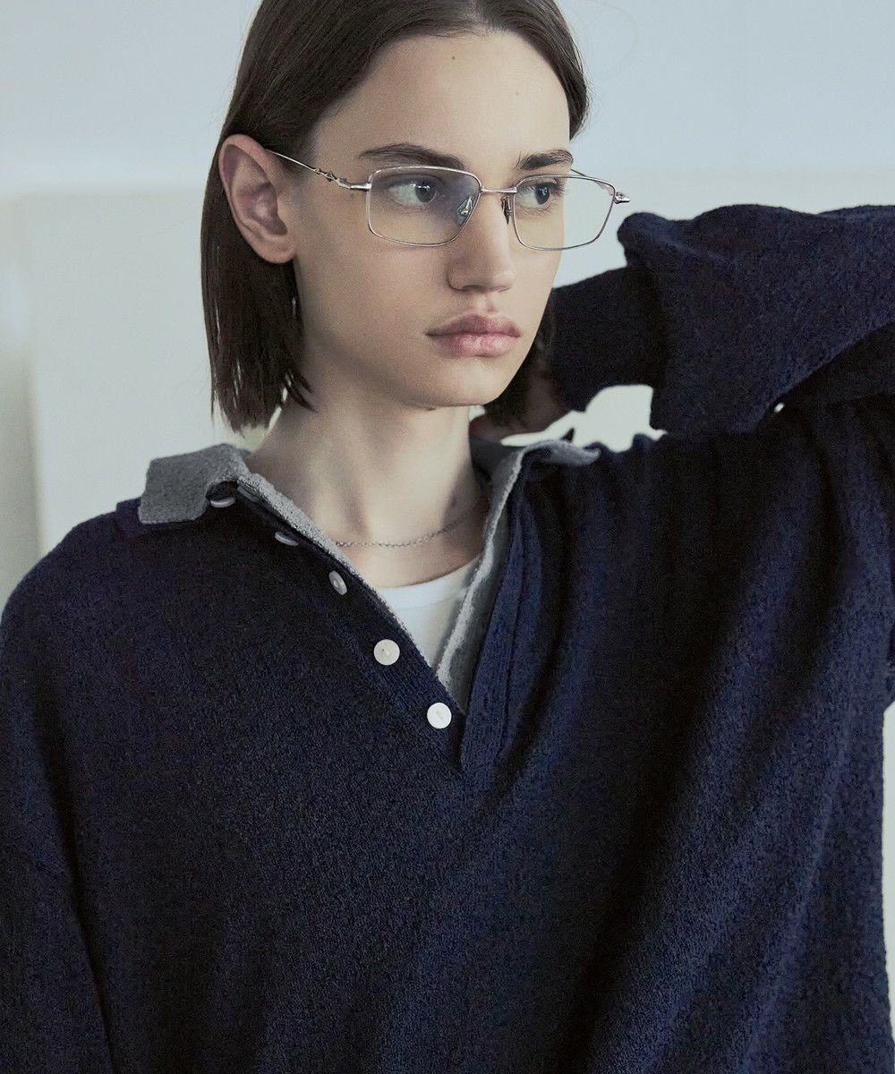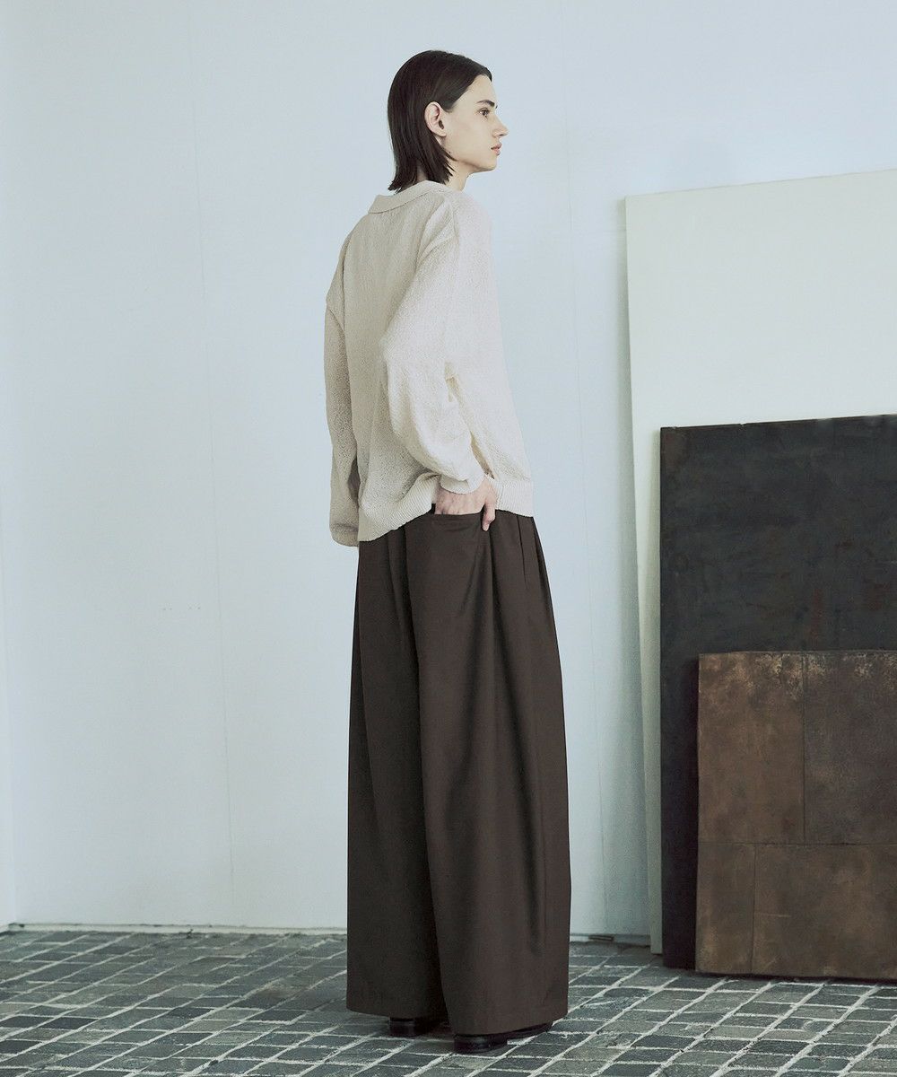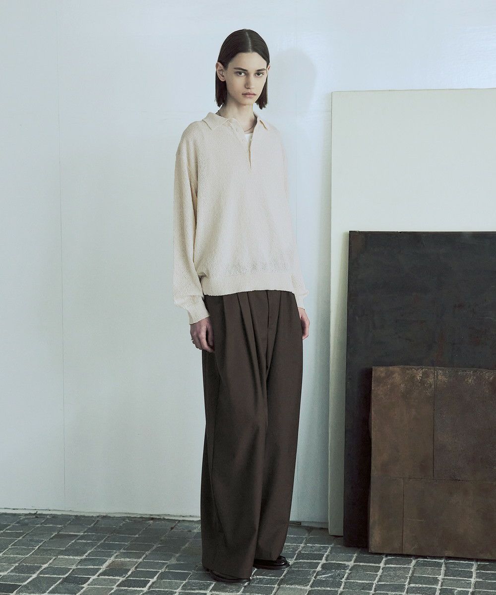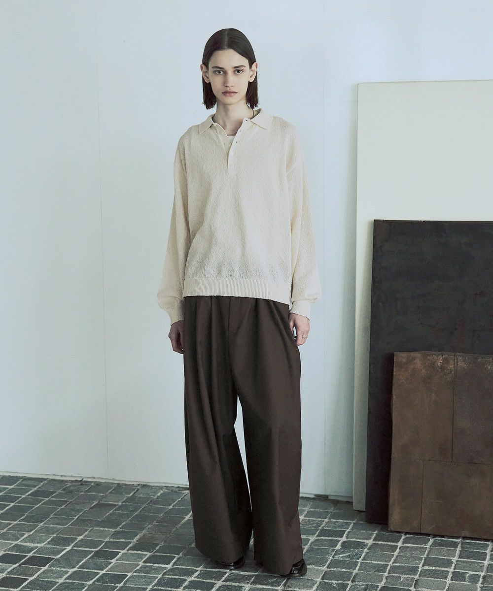 表情豊かなシアーブークレ生地で仕上げた襟付きヘンリーニット。ゆとりを持たせた身幅やアームホール、ドロップショルダーがリラックス感を演出しつつ、襟付きのデザインにすることでカジュアルすぎない品のある印象にまとめてくれます。丸みのある袖は袖口をリブで引き締めることで、だらしなく見えない絶妙なシルエットに。タンクトップとレイヤードして着用すると、上品な透け感がお洒落な着こなしを叶えます。
