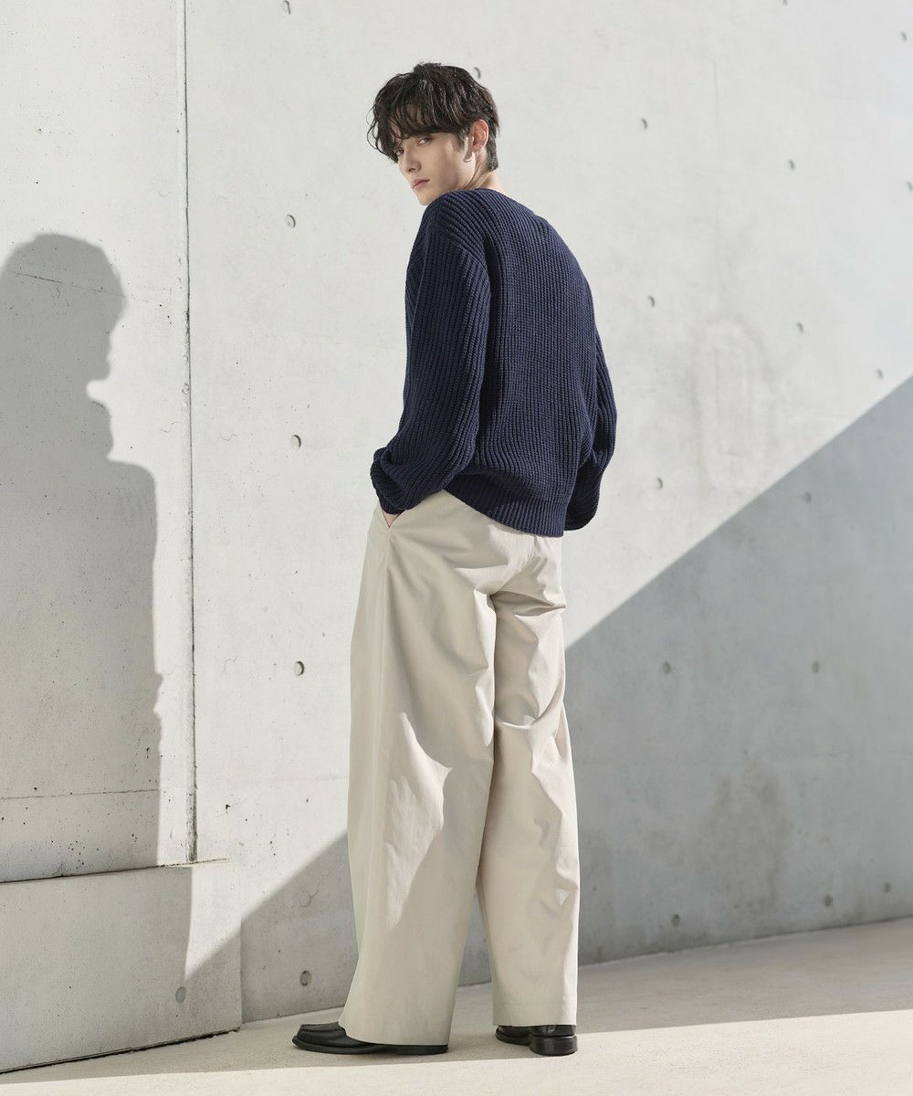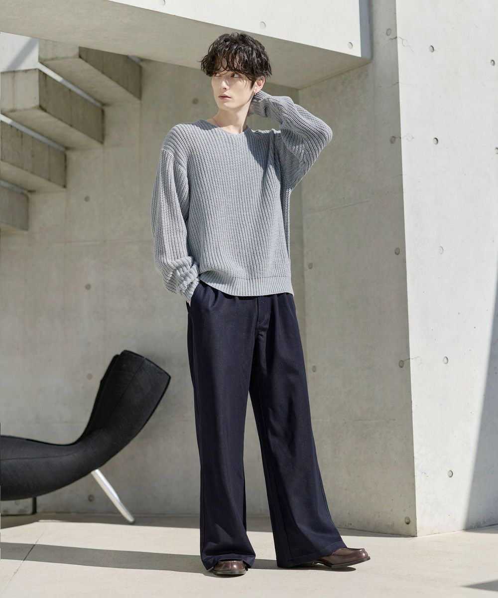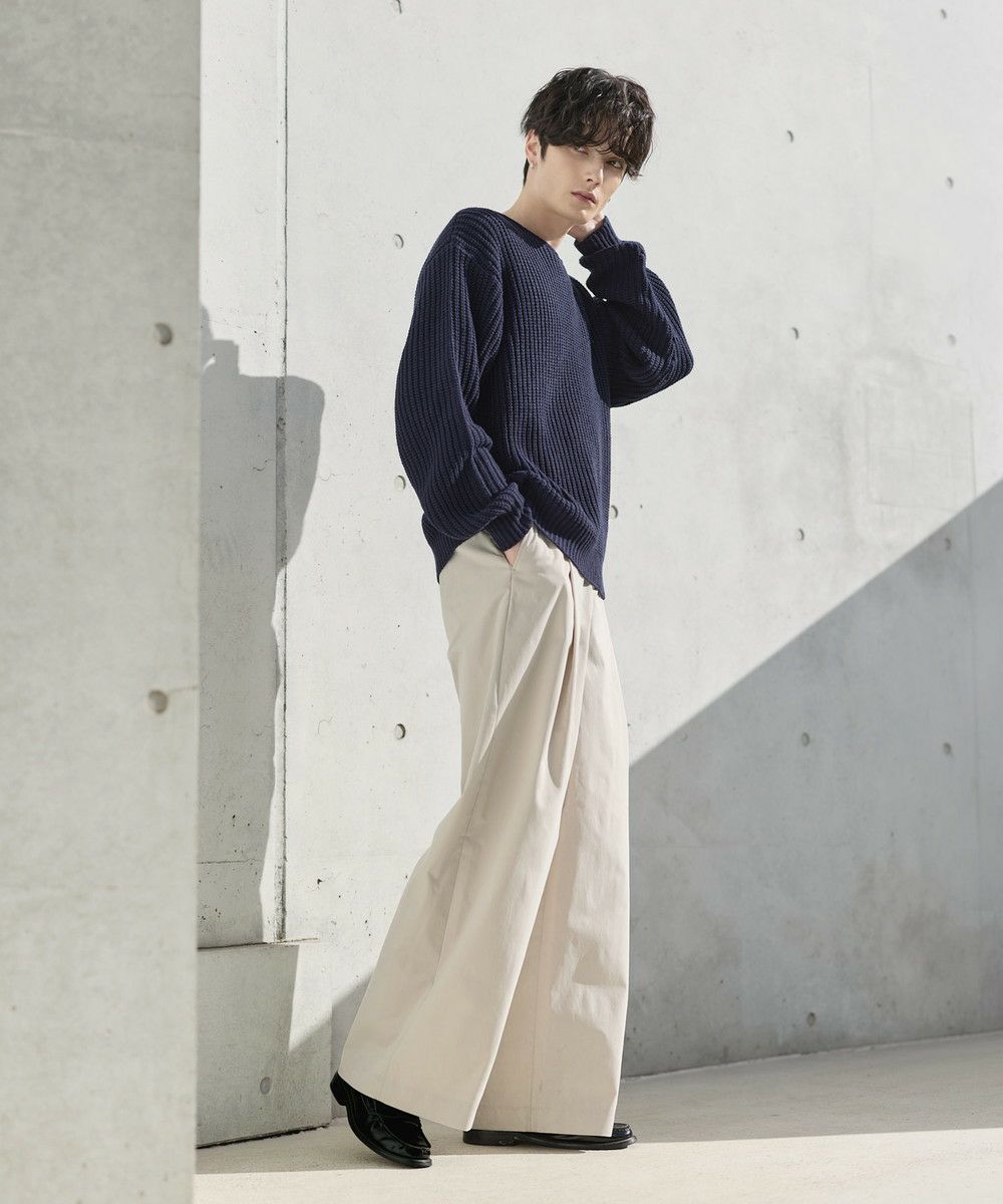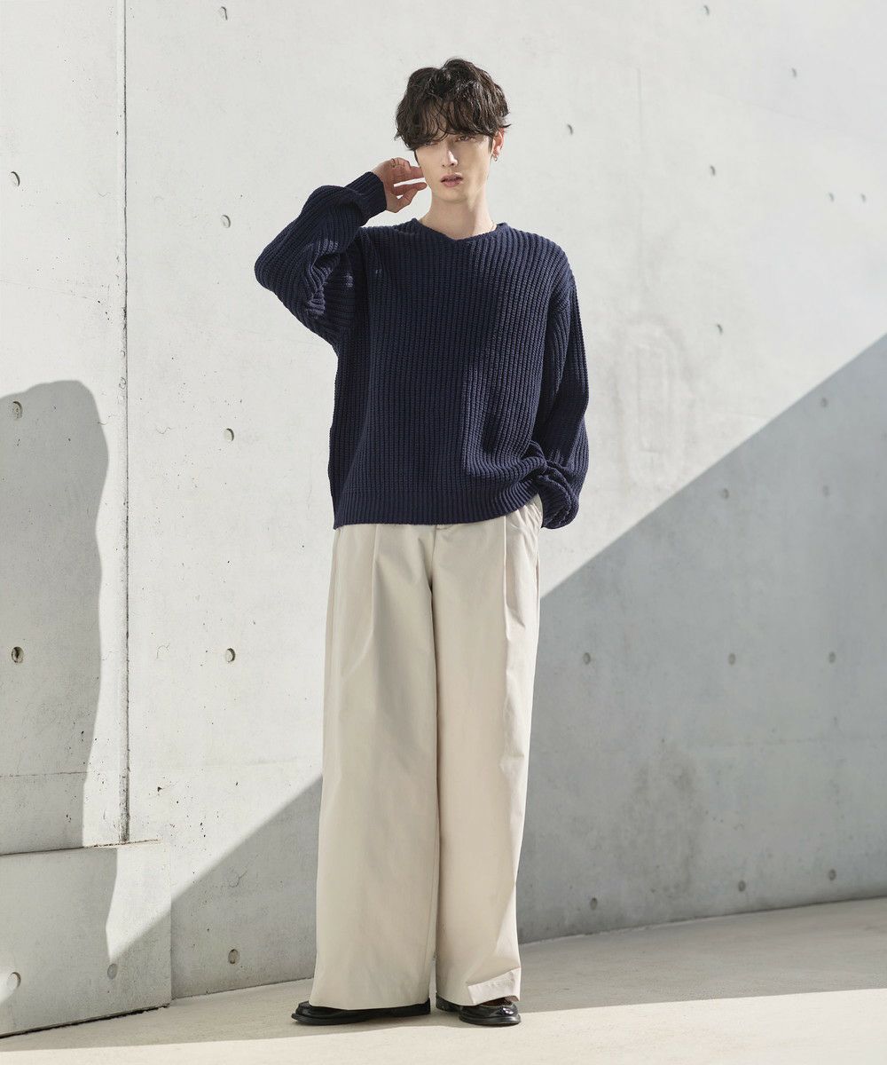 ゆったりとしたサイズなので、パンツもリラックス感のあるアイテムがぴったり。カジュアルなデニムパンツはもちろん、タック入りのスラックスでシルエットをよりワイドに見せるのもおすすめです。