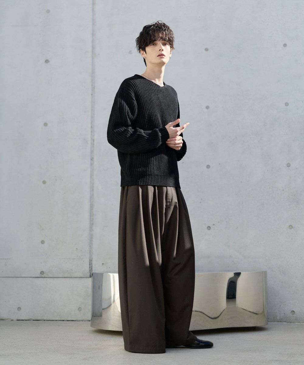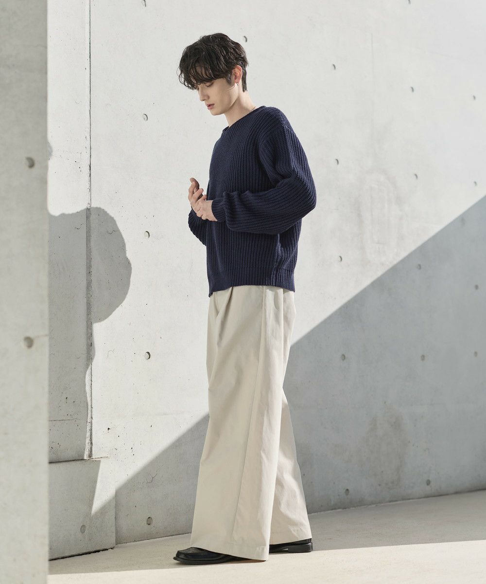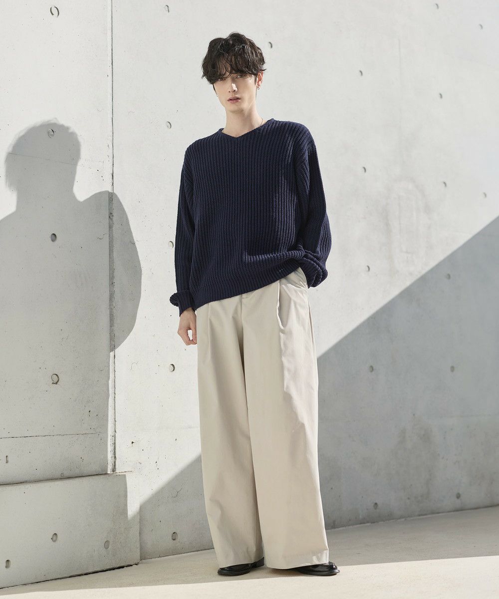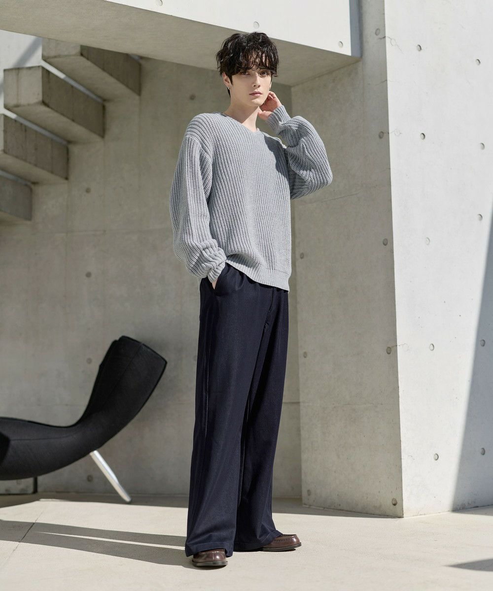ゆったりとしたサイズなので、パンツもリラックス感のあるアイテムがぴったり。カジュアルなデニムパンツはもちろん、タック入りのスラックスでシルエットをよりワイドに見せるのもおすすめです。