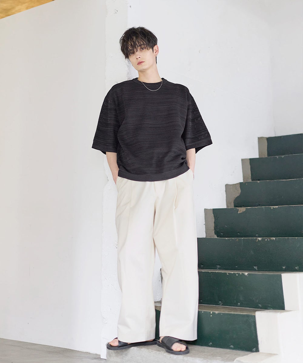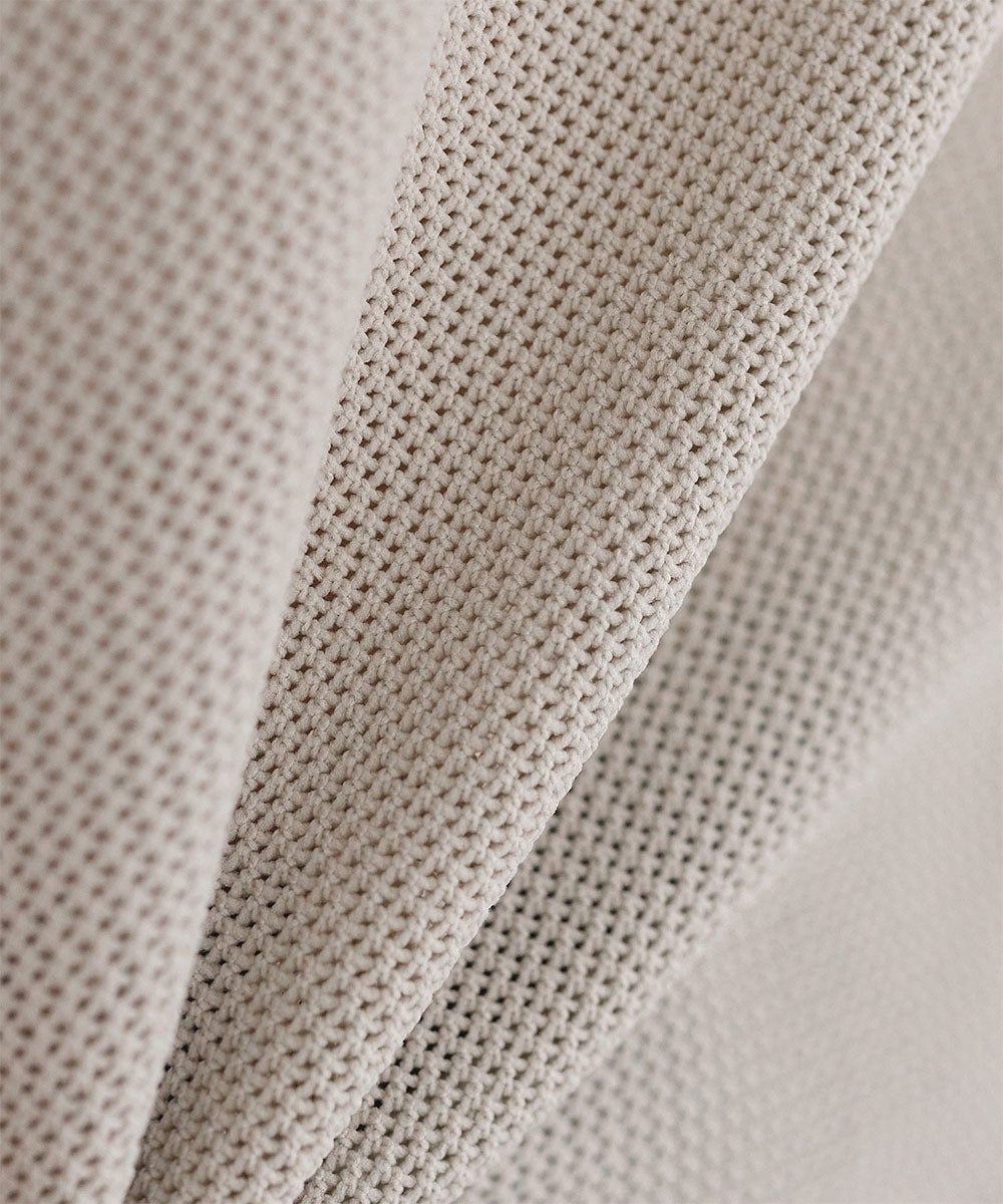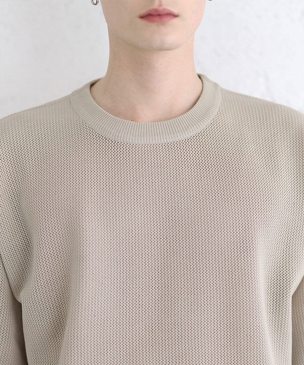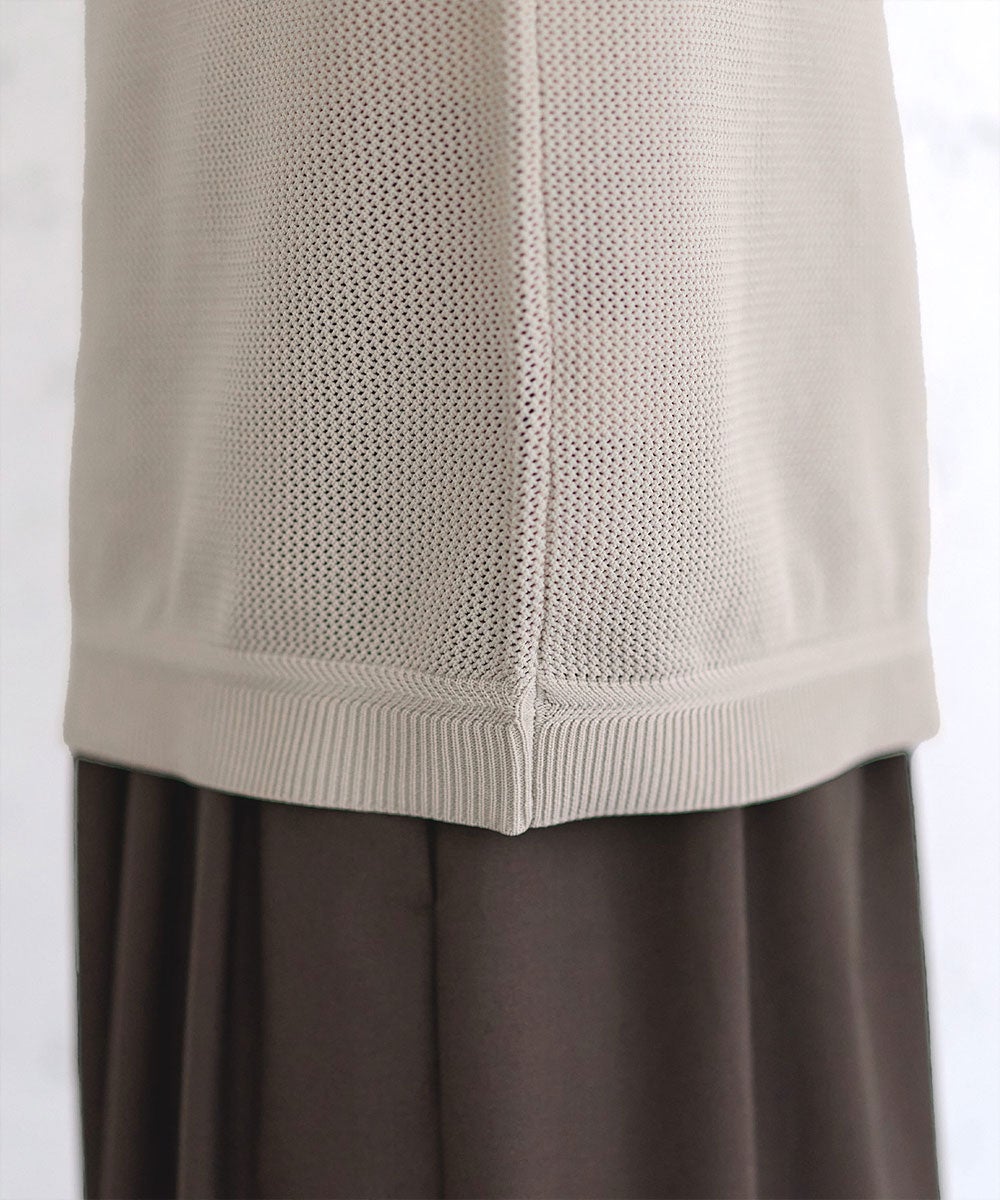 ストレッチ性抜群の、ポリエステル100%素材を使用しました。空気を含んだような弾力性とリラックス感のある着心地が特長。メッシュ編みにより、軽やかで通気性にも優れ、春夏シーズンにぴったりの生地感です。ドライな着心地が続く吸水速乾機能付き。さらに手洗いが可能なイージーケア素材のため、汗ばむ夏のデイリーウェアとして気兼ねなくご着用いただけます。