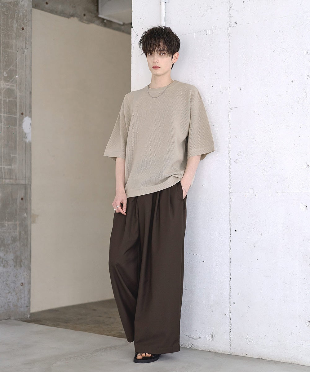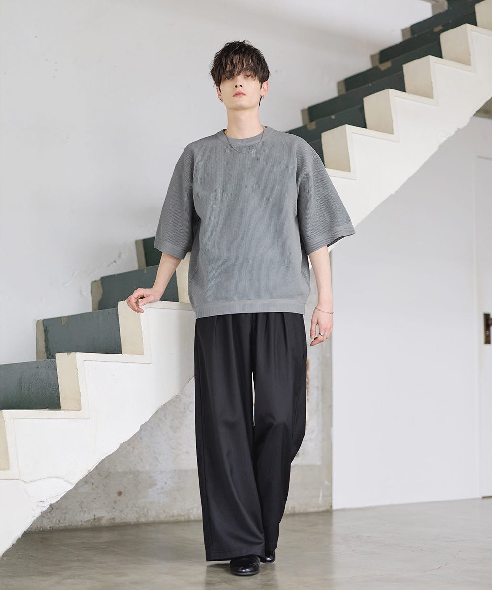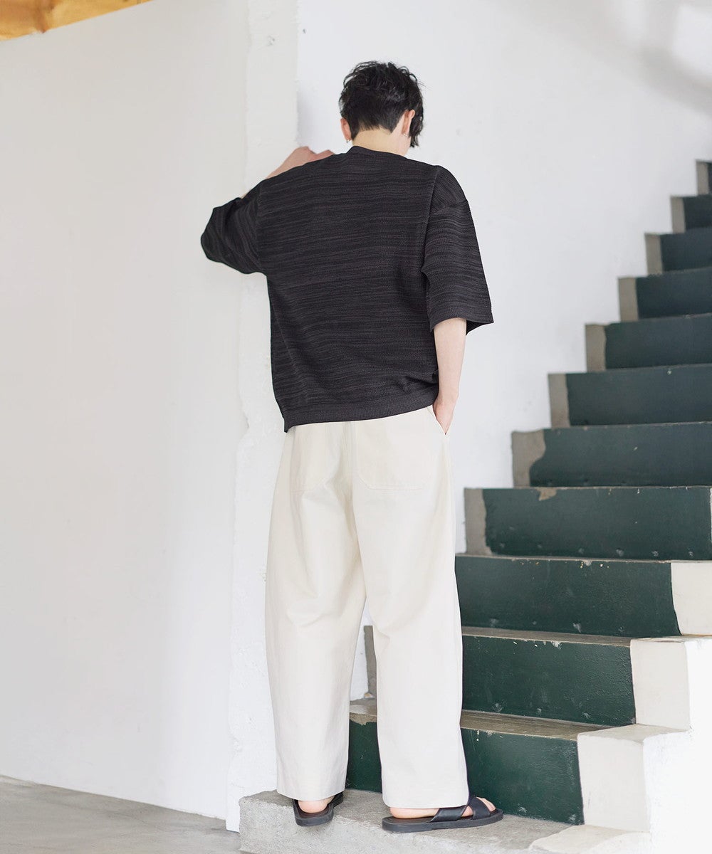 ストレッチ性抜群の、ポリエステル100%素材を使用しました。空気を含んだような弾力性とリラックス感のある着心地が特長。メッシュ編みにより、軽やかで通気性にも優れ、春夏シーズンにぴったりの生地感です。ドライな着心地が続く吸水速乾機能付き。さらに手洗いが可能なイージーケア素材のため、汗ばむ夏のデイリーウェアとして気兼ねなくご着用いただけます。