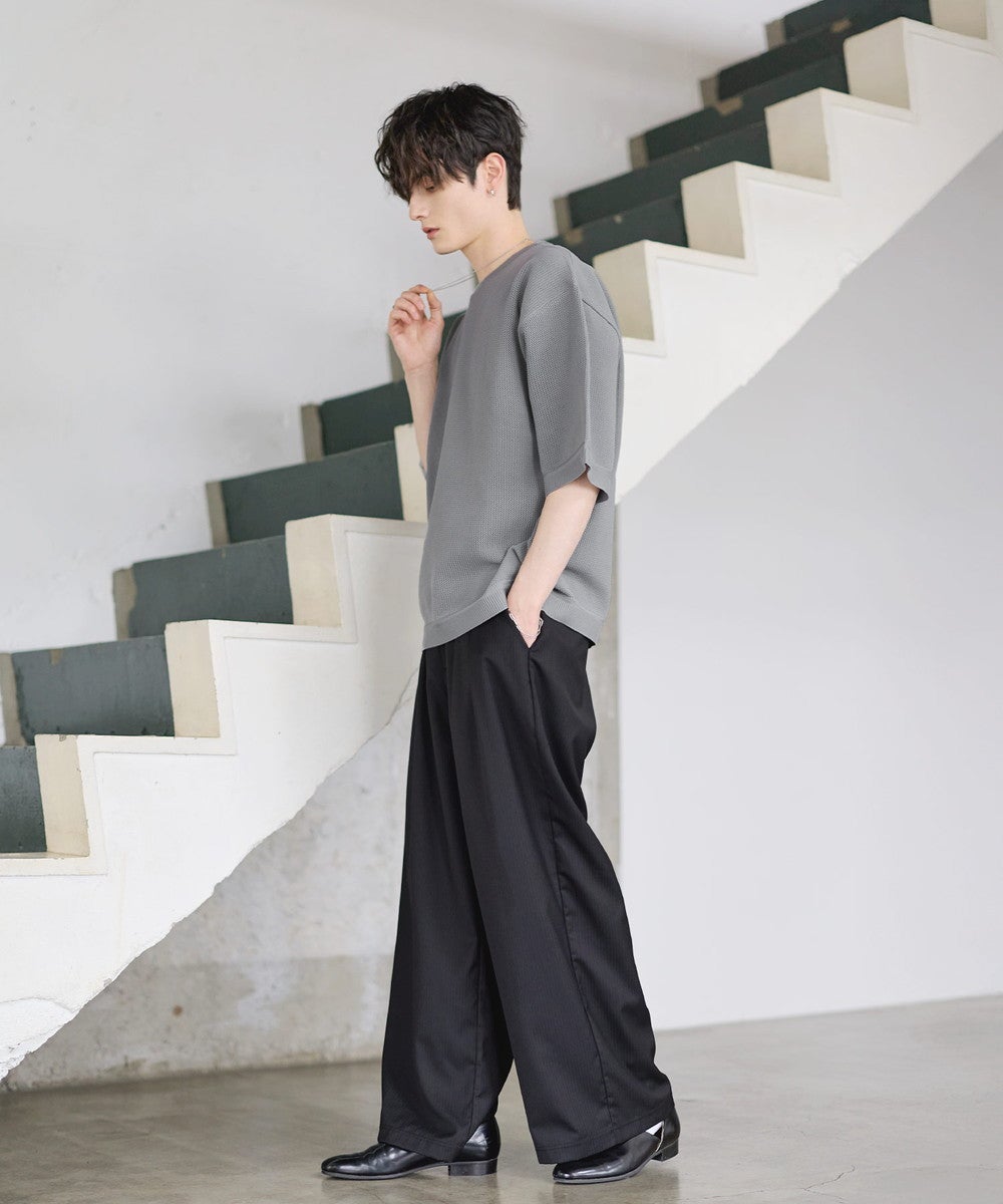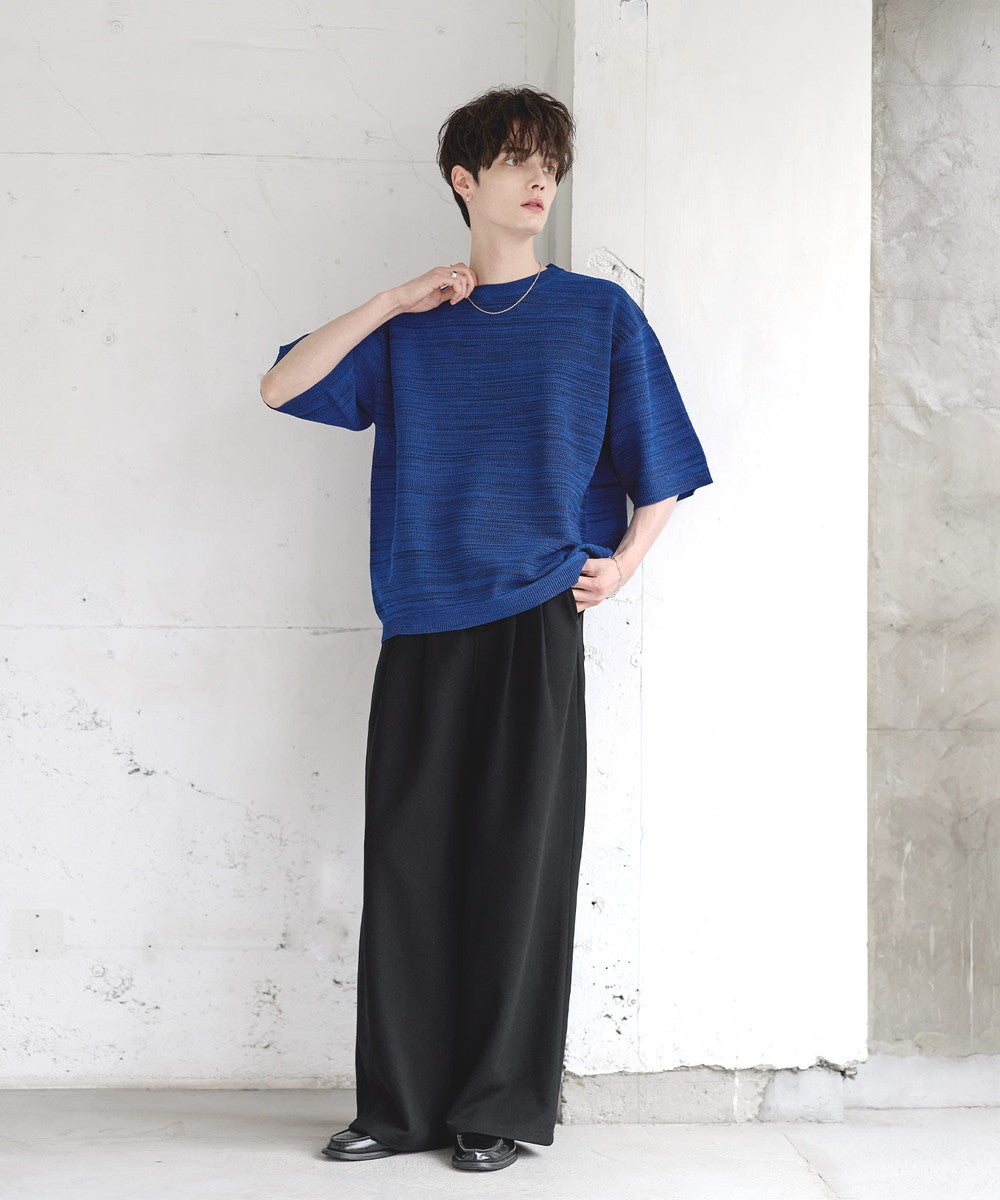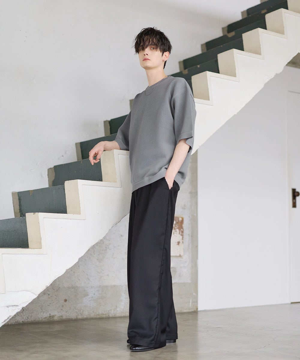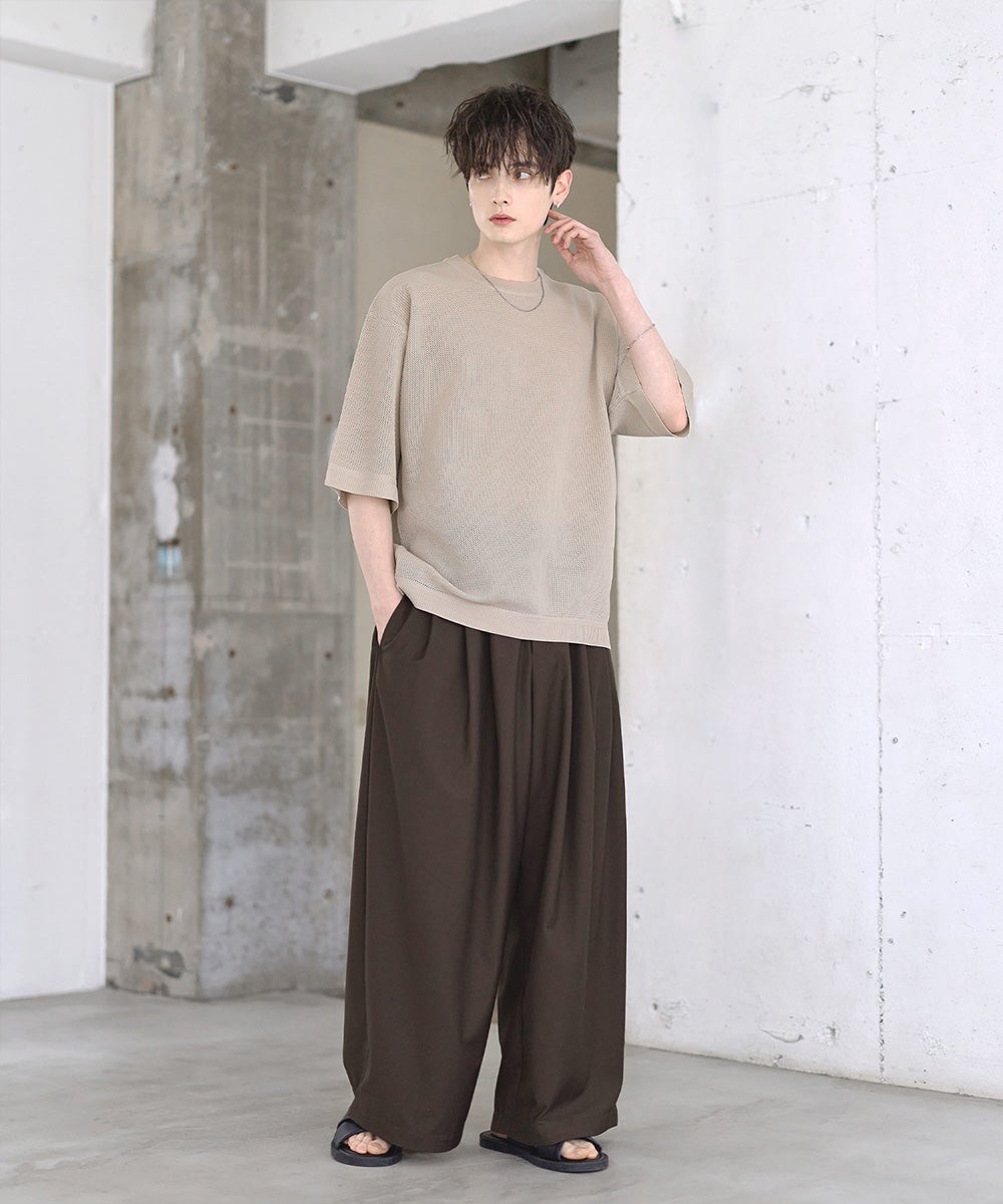 ストレッチ性抜群の、ポリエステル100%素材を使用しました。空気を含んだような弾力性とリラックス感のある着心地が特長。メッシュ編みにより、軽やかで通気性にも優れ、春夏シーズンにぴったりの生地感です。ドライな着心地が続く吸水速乾機能付き。さらに手洗いが可能なイージーケア素材のため、汗ばむ夏のデイリーウェアとして気兼ねなくご着用いただけます。