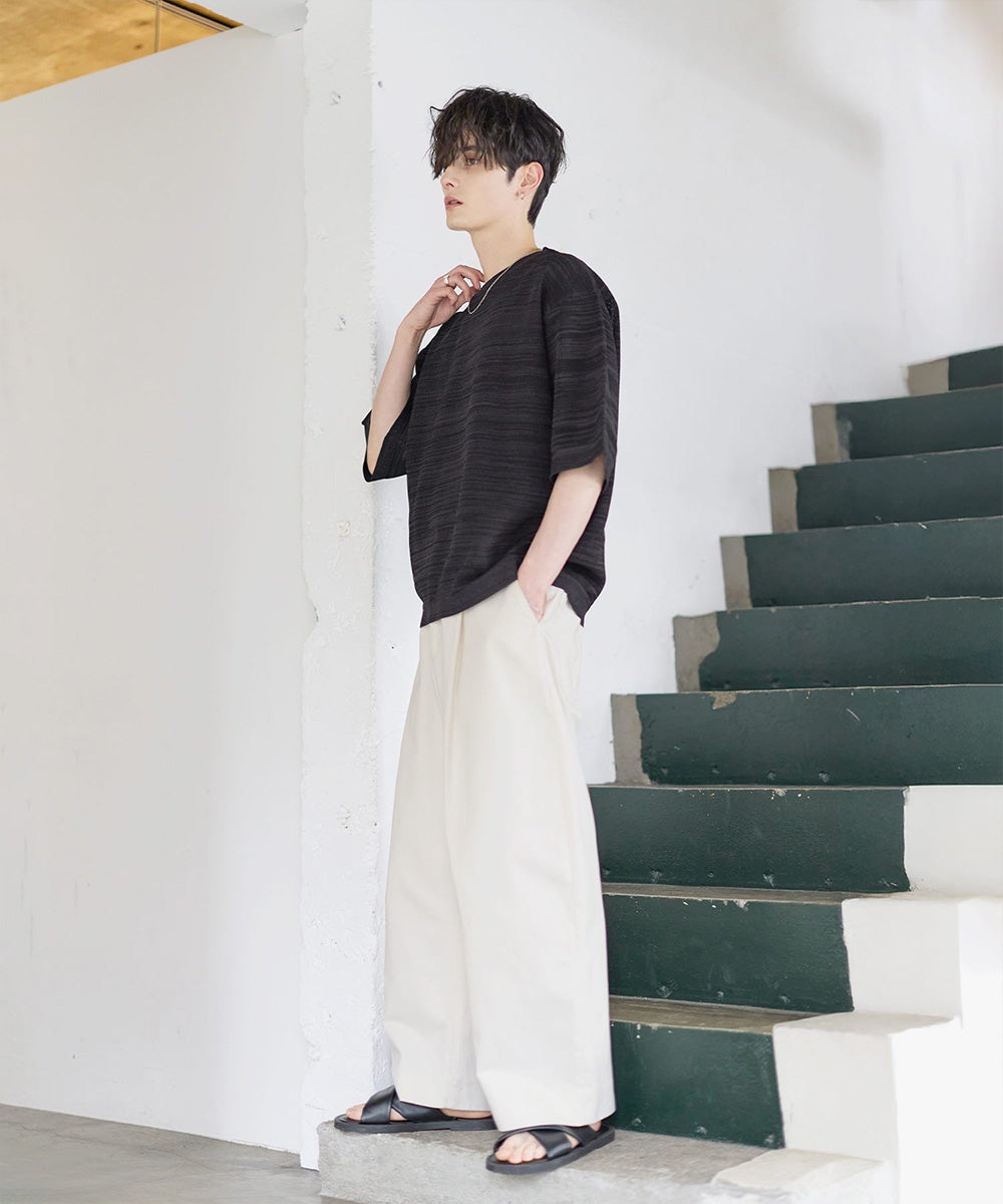 素材の風合いと透け感を活かしたシンプルな着こなしがおすすめ。インナーにタンクトップなどを合わせたレイヤードコーデが映える一着。スラックスやワイドパンツなど、テイストを選ばず幅広いボトムスと相性抜群です。