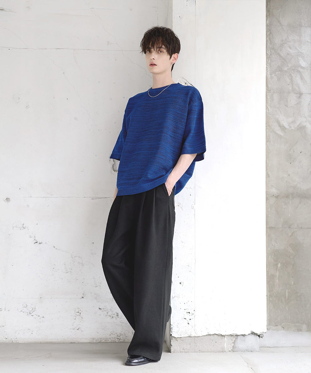 ゆとりのある身幅とドロップショルダーでリラックス感のある雰囲気に仕上げました。首元、袖、裾部分のリブデザインで、さりげないアクセントをプラス。