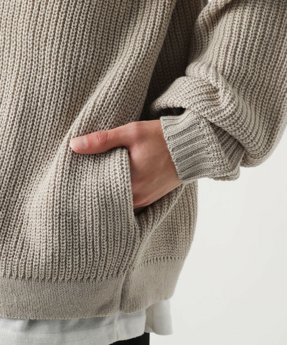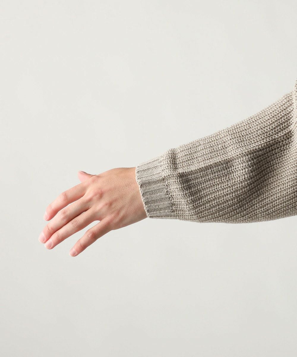 片畦編みという編み方のニットで、程よい厚みと凹凸のある編地が特長です。アクリル100%なので肌に触れてもチクチク感がなく、柔らかな触り心地が魅力。ご自宅でお洗濯もできるため、デイリー使いに最適な一着です。