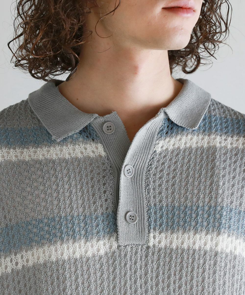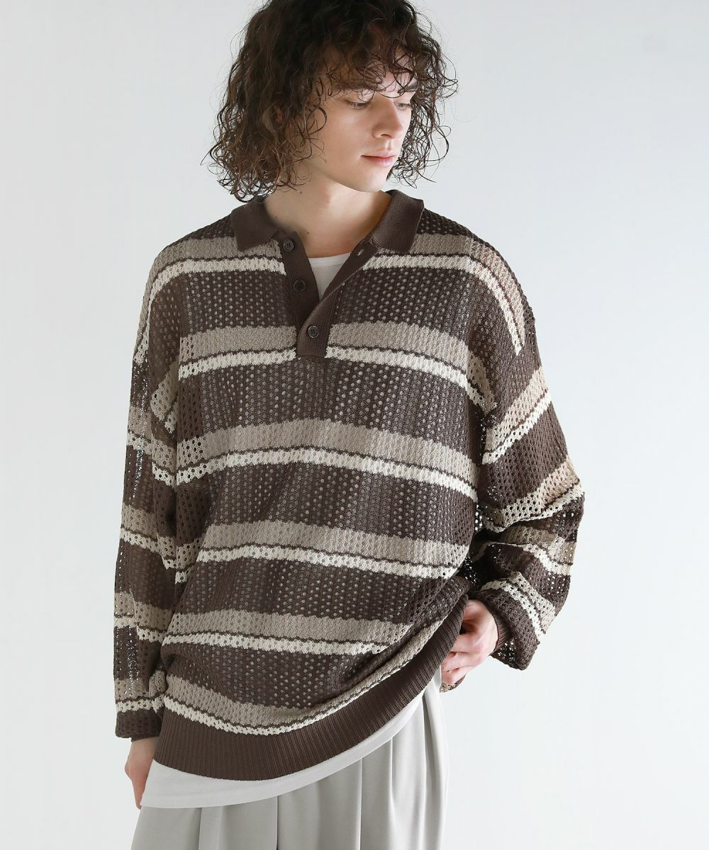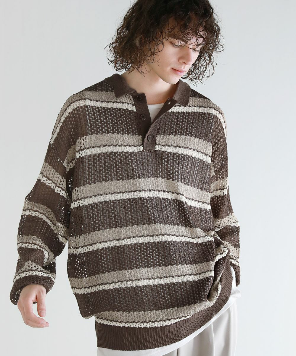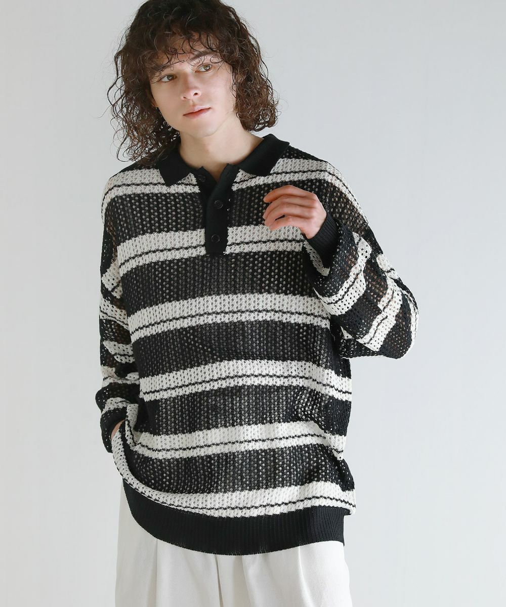 軽い着心地と透け感が魅力のメッシュ編みポロニットシャツ。メッシュ素材と配色ボーダー柄をミックスさせたデザイン。 落ち着いた印象のニットポロシャツで、ルーズシルエット&ドロップショルダーが今っぽいリラックス感を演出します。大きめのメッシュ編みでタンクトップやカットソーなどインナーの透け感を楽しめる1着。春から秋にかけてロングシーズン活躍するアイテムです。