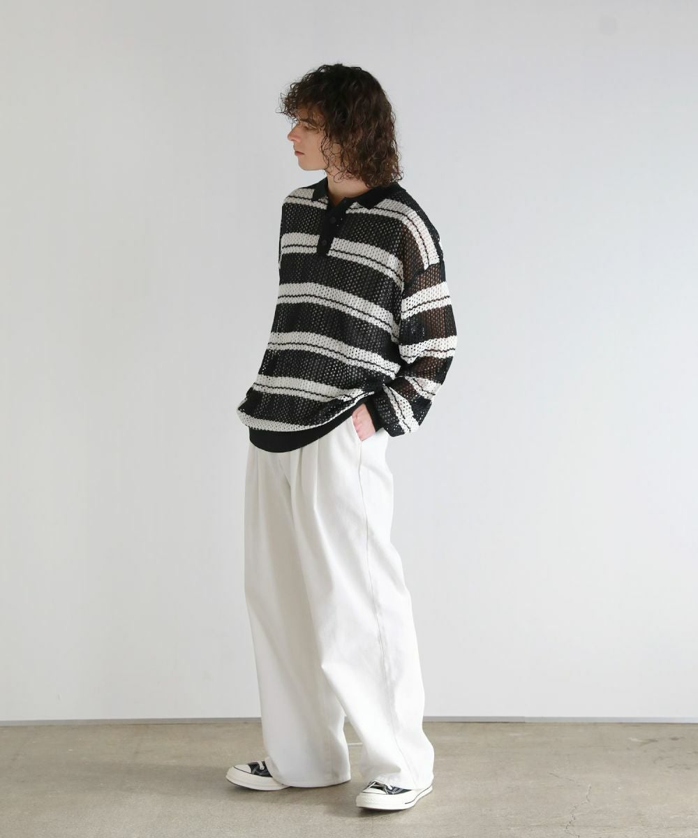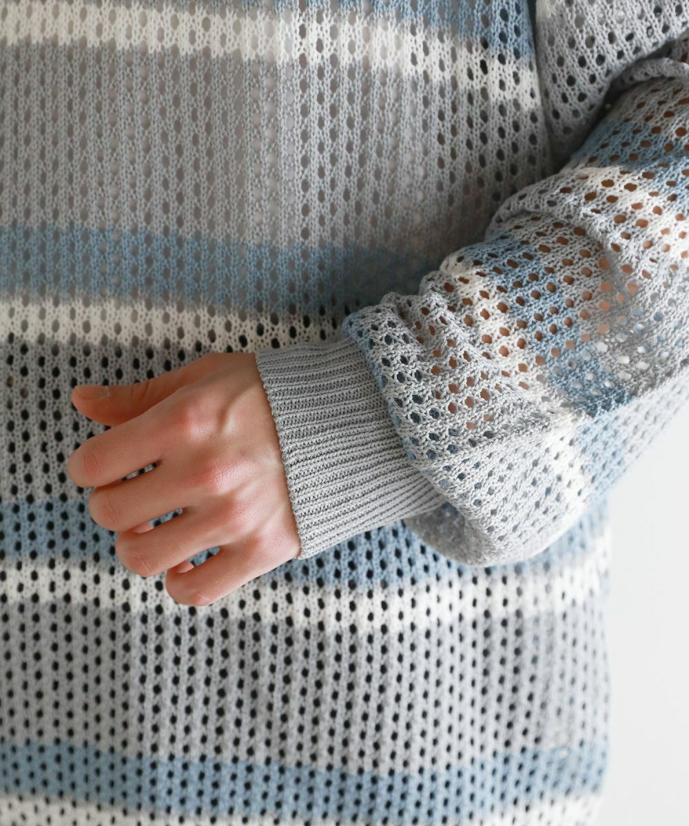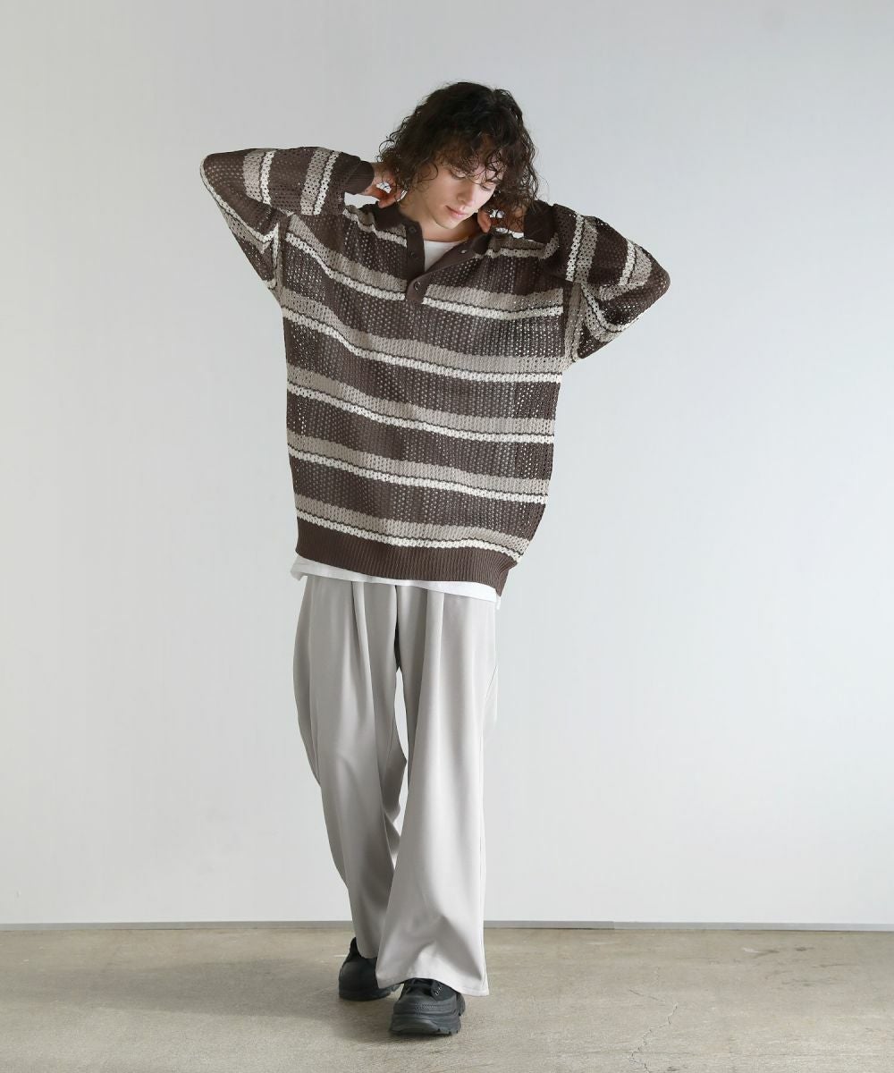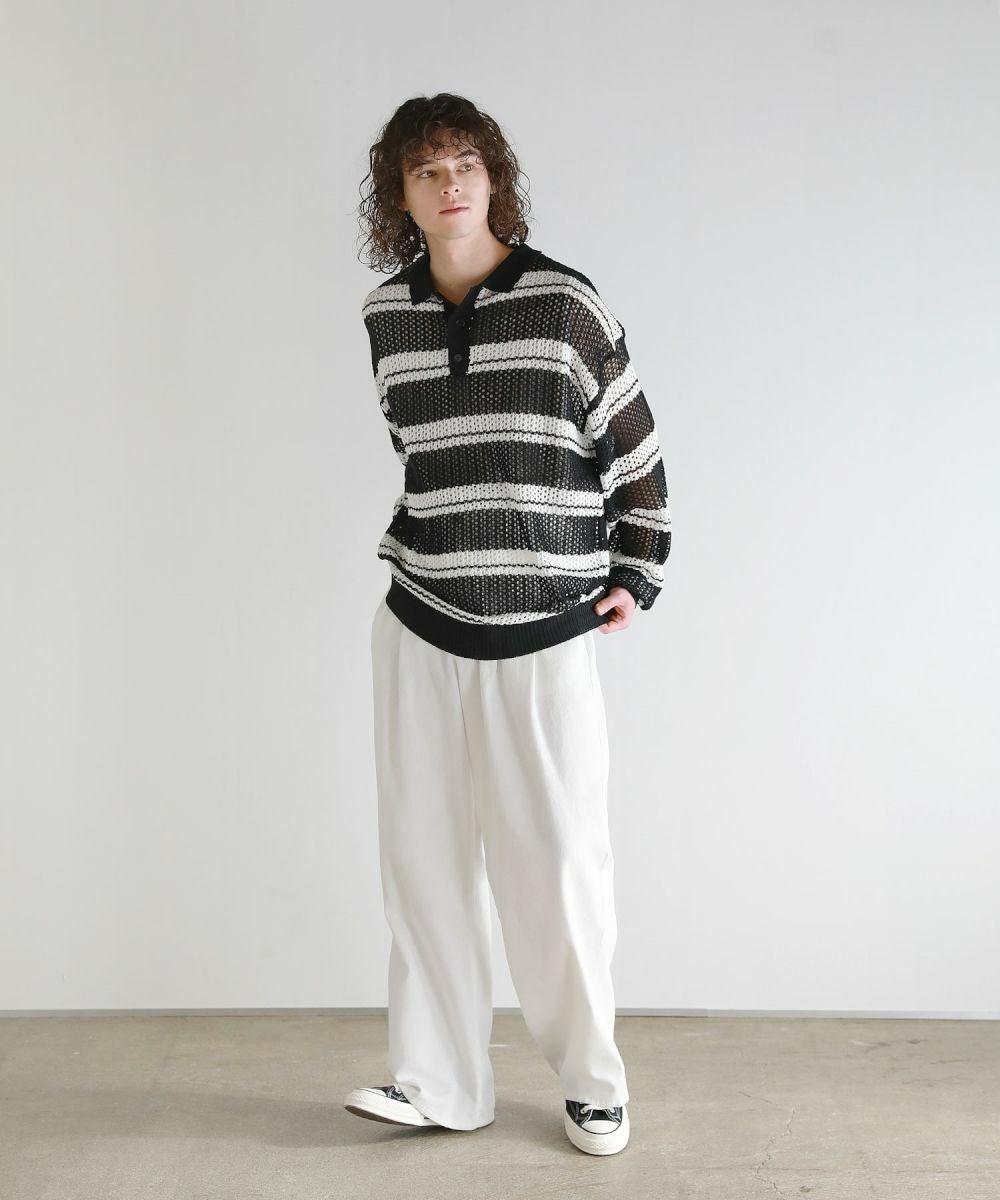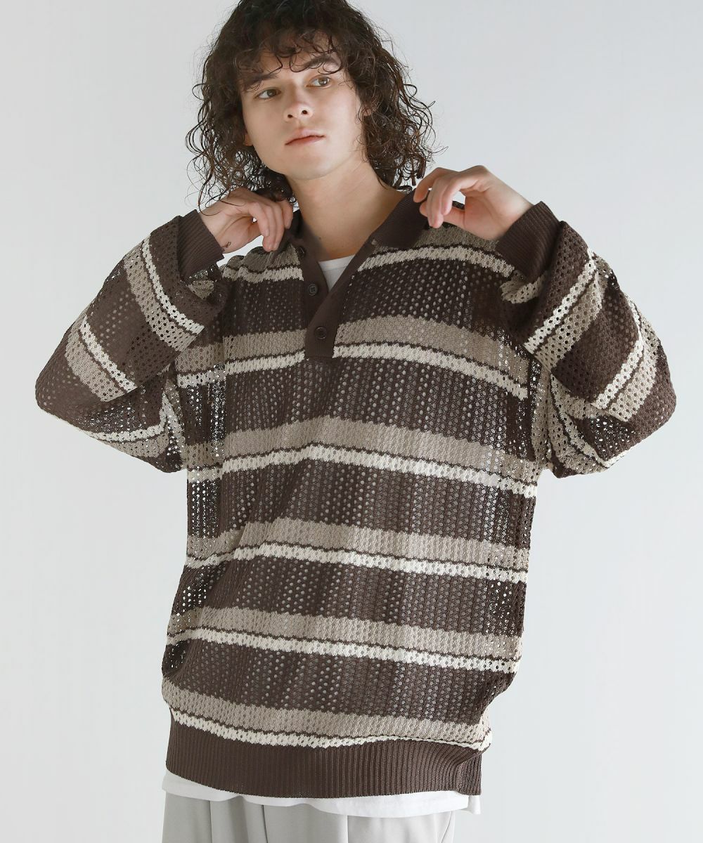 軽い着心地と透け感が魅力のメッシュ編みポロニットシャツ。メッシュ素材と配色ボーダー柄をミックスさせたデザイン。 落ち着いた印象のニットポロシャツで、ルーズシルエット&ドロップショルダーが今っぽいリラックス感を演出します。大きめのメッシュ編みでタンクトップやカットソーなどインナーの透け感を楽しめる1着。春から秋にかけてロングシーズン活躍するアイテムです。