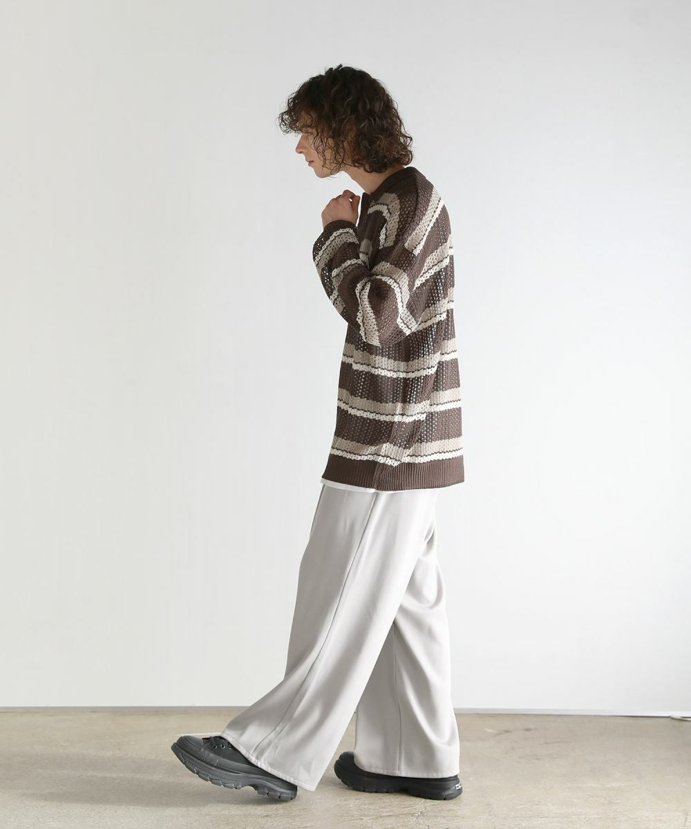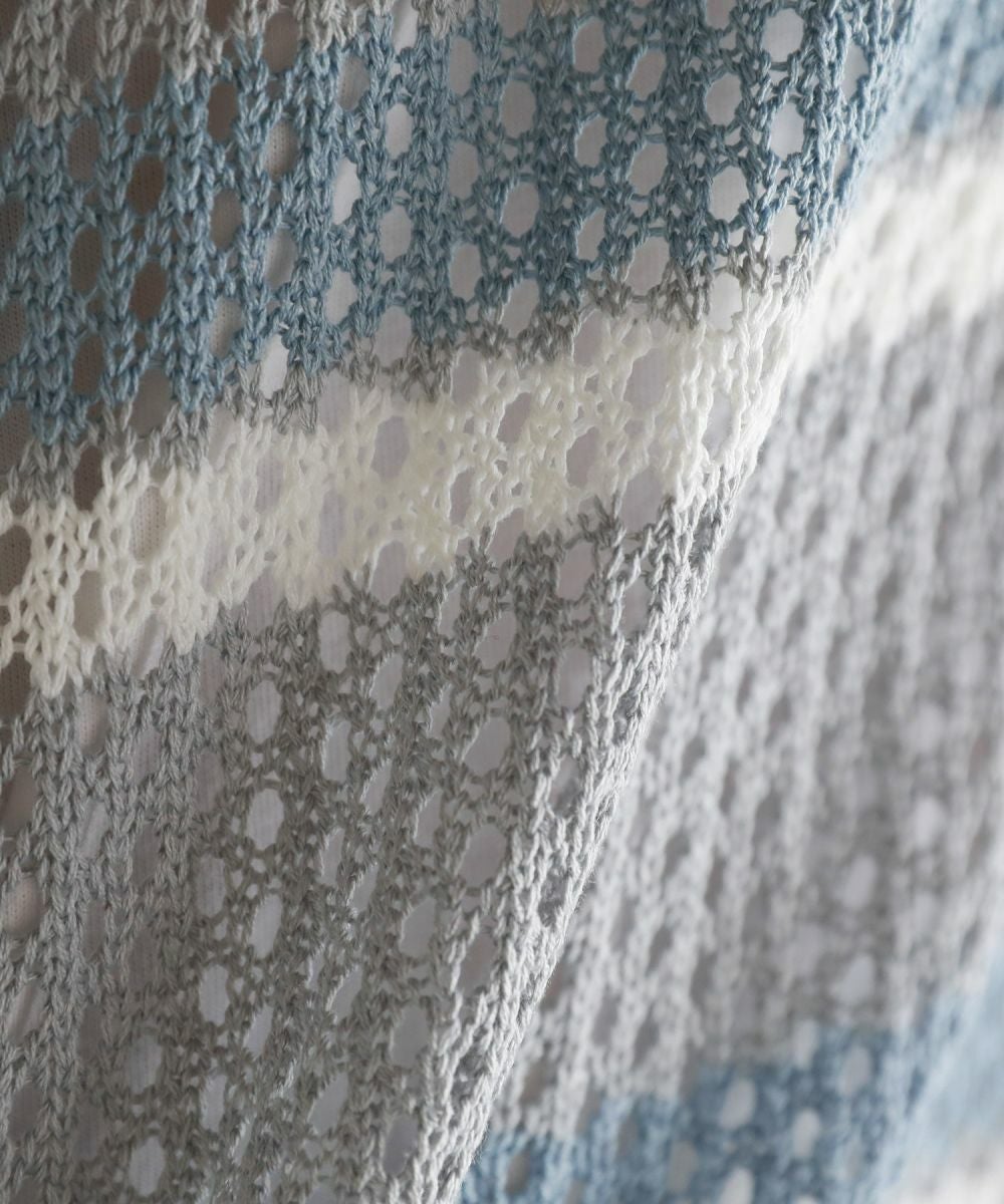 ニット生地のアクリル素材を使用。透け感のあるざっくりとした編み地は軽やかな着心地で、季節の変わり目に使い勝手の良い1着です。