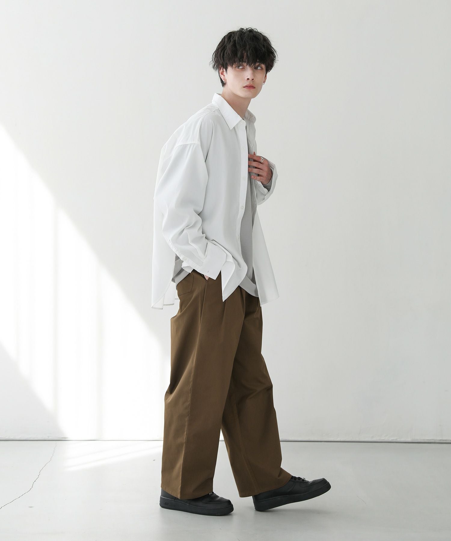 ゆったりとした身幅に、着丈のバランスや袖の太さ、サイドスリットなど計算されたバランスのブロードシャツ。