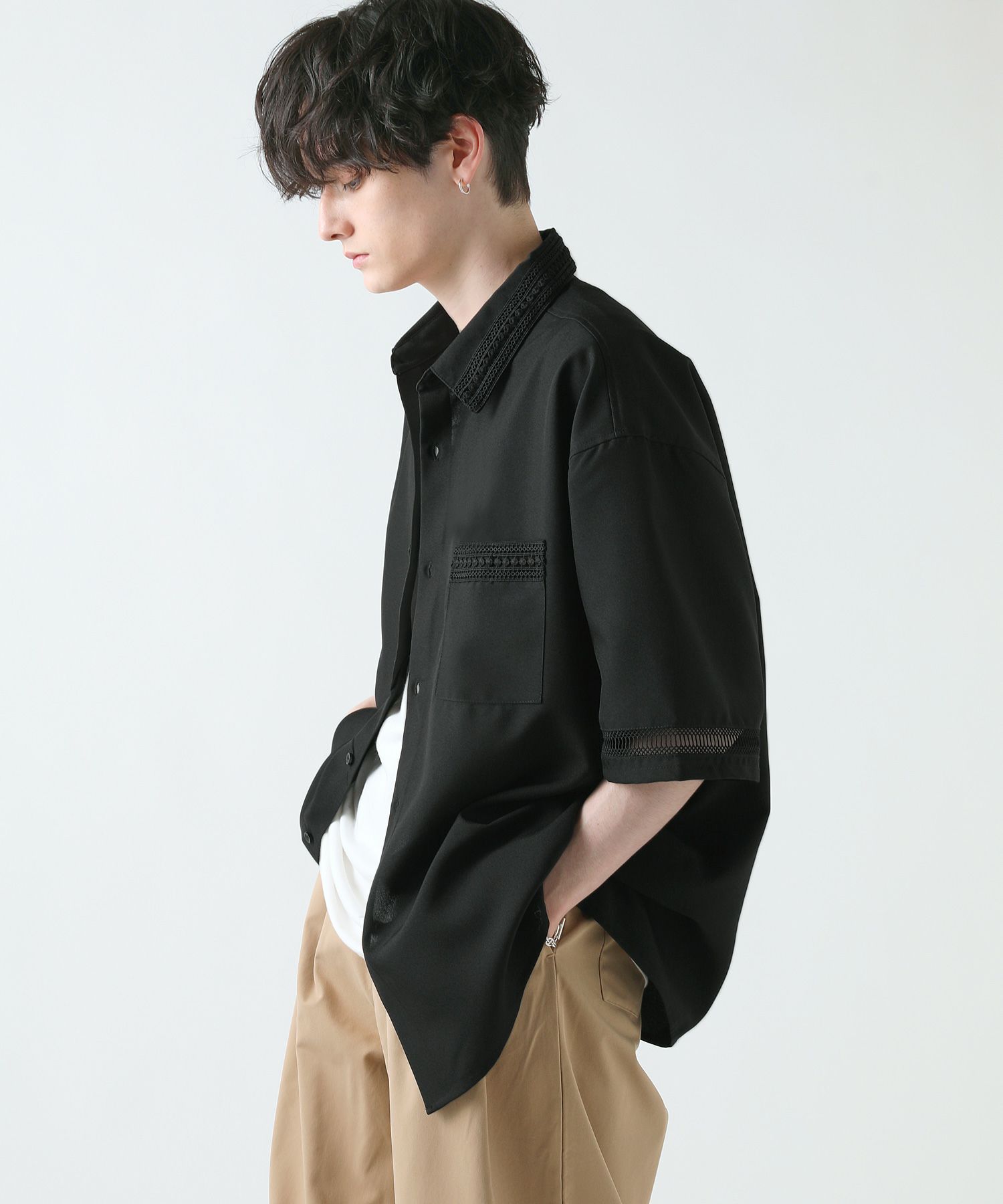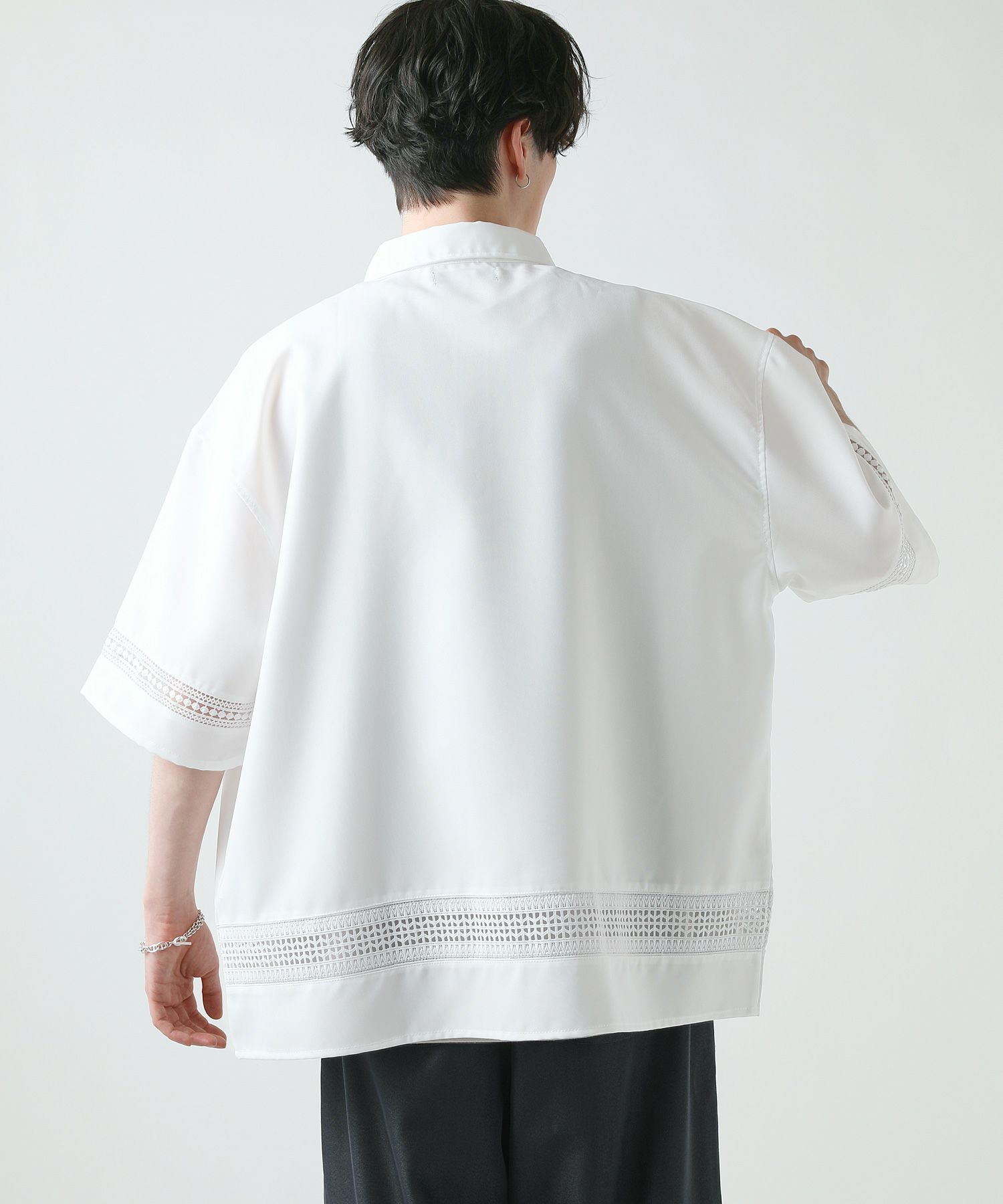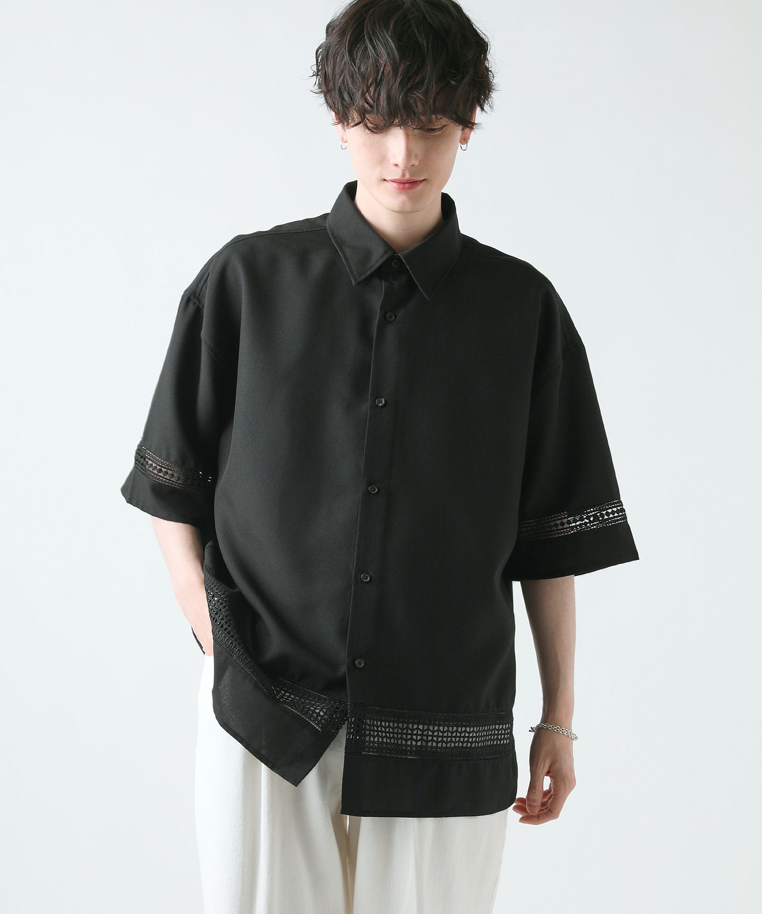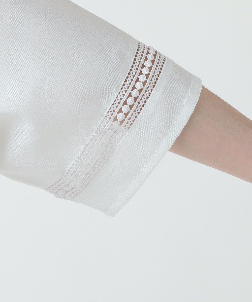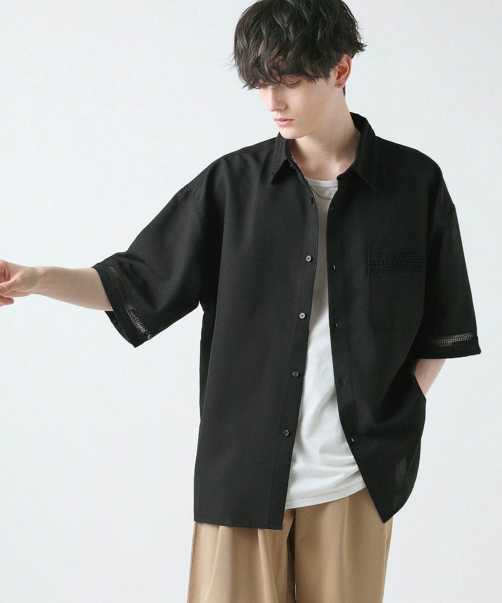 襟や裾、袖の切り替え部分にレースを施した華やかなシャツ。ワントーンに馴染みながらも、異素材のコントラストがメリハリと上品さをプラスします。袖や身幅をワイドに設定し、抜け感のある印象に仕上げました。レースのデザインと切り替え部分が異なるタイプA、Bの2種類展開。Aは襟、胸ポケット、袖口部分。Bは袖口、裾部分にレース切り替えが入っています。ホワイト、ブラックの2色展開で、お持ちのアイテムに取り入れやすくコーデを上品にまとめられます。