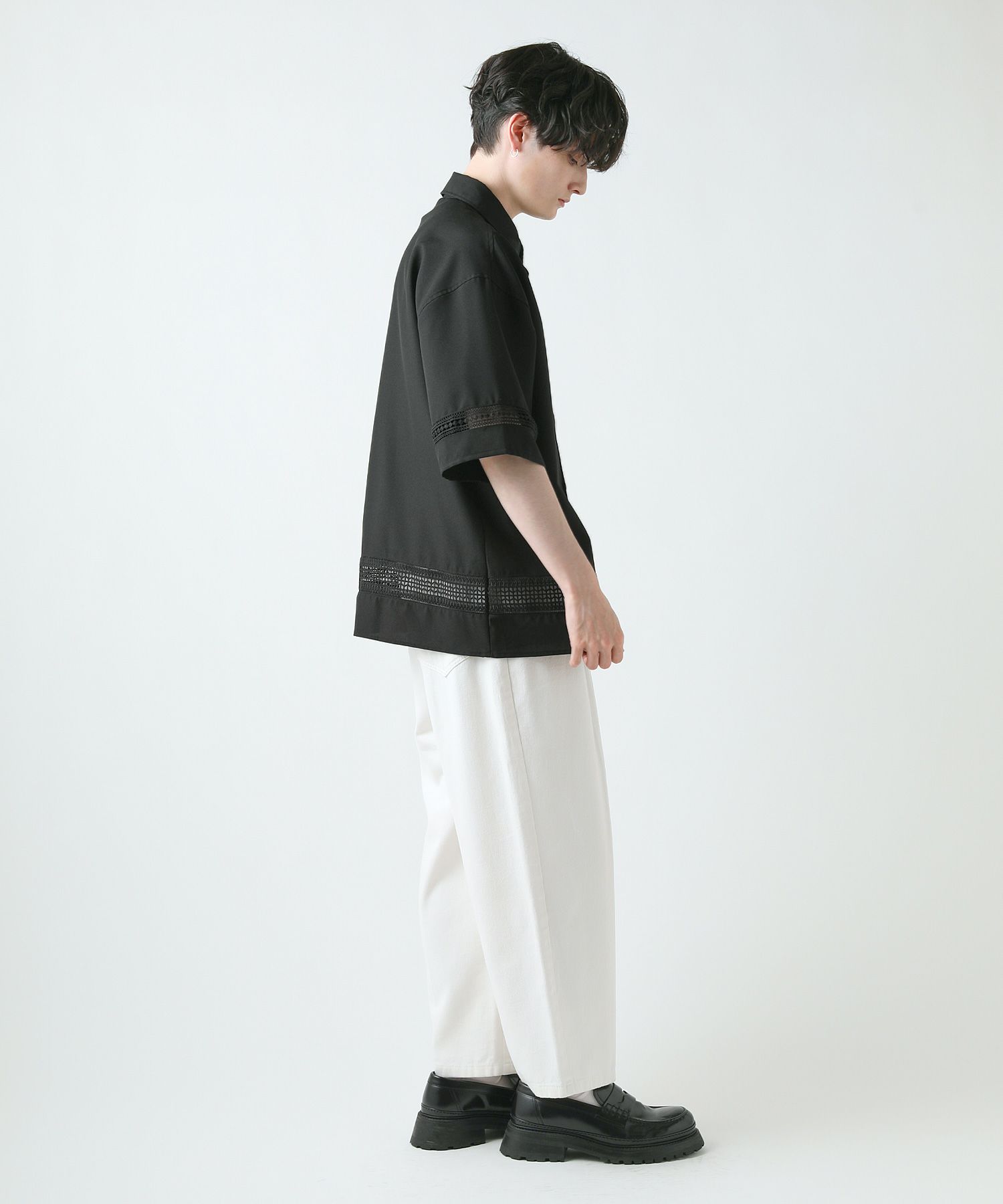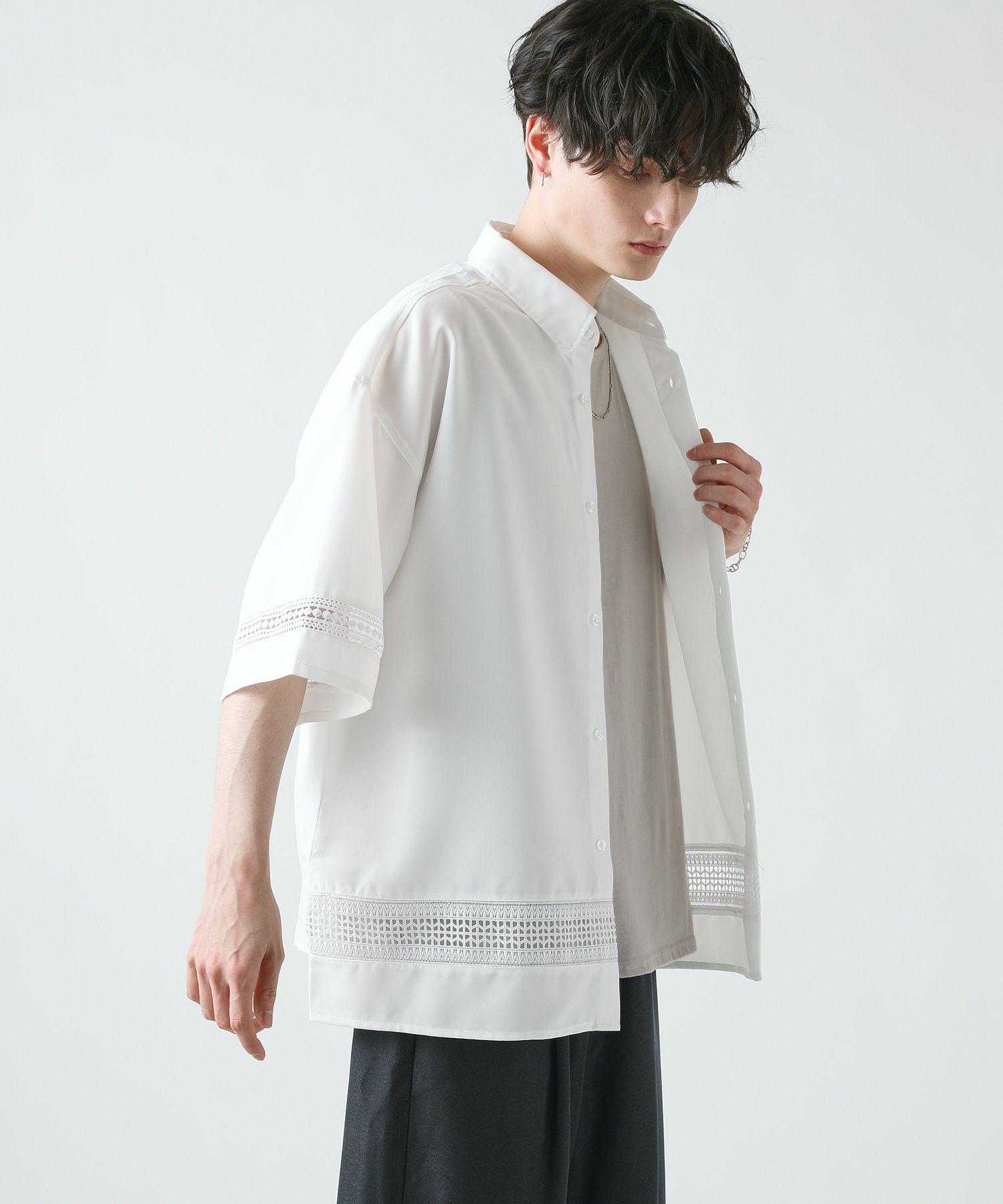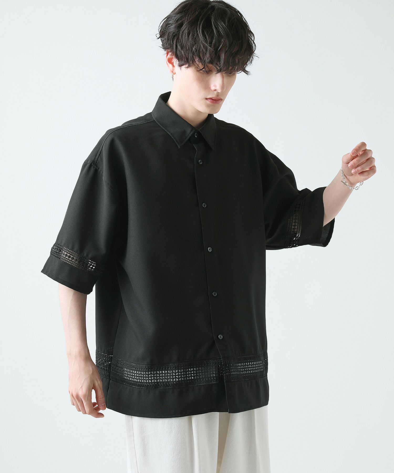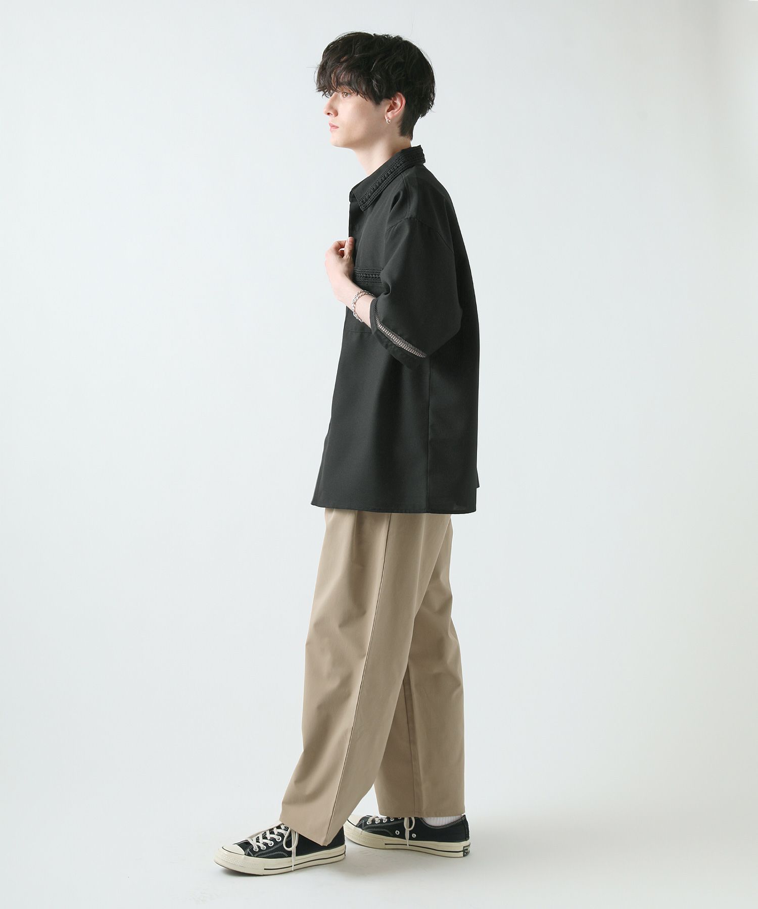 襟や裾、袖の切り替え部分にレースを施した華やかなシャツ。ワントーンに馴染みながらも、異素材のコントラストがメリハリと上品さをプラスします。袖や身幅をワイドに設定し、抜け感のある印象に仕上げました。レースのデザインと切り替え部分が異なるタイプA、Bの2種類展開。Aは襟、胸ポケット、袖口部分。Bは袖口、裾部分にレース切り替えが入っています。ホワイト、ブラックの2色展開で、お持ちのアイテムに取り入れやすくコーデを上品にまとめられます。