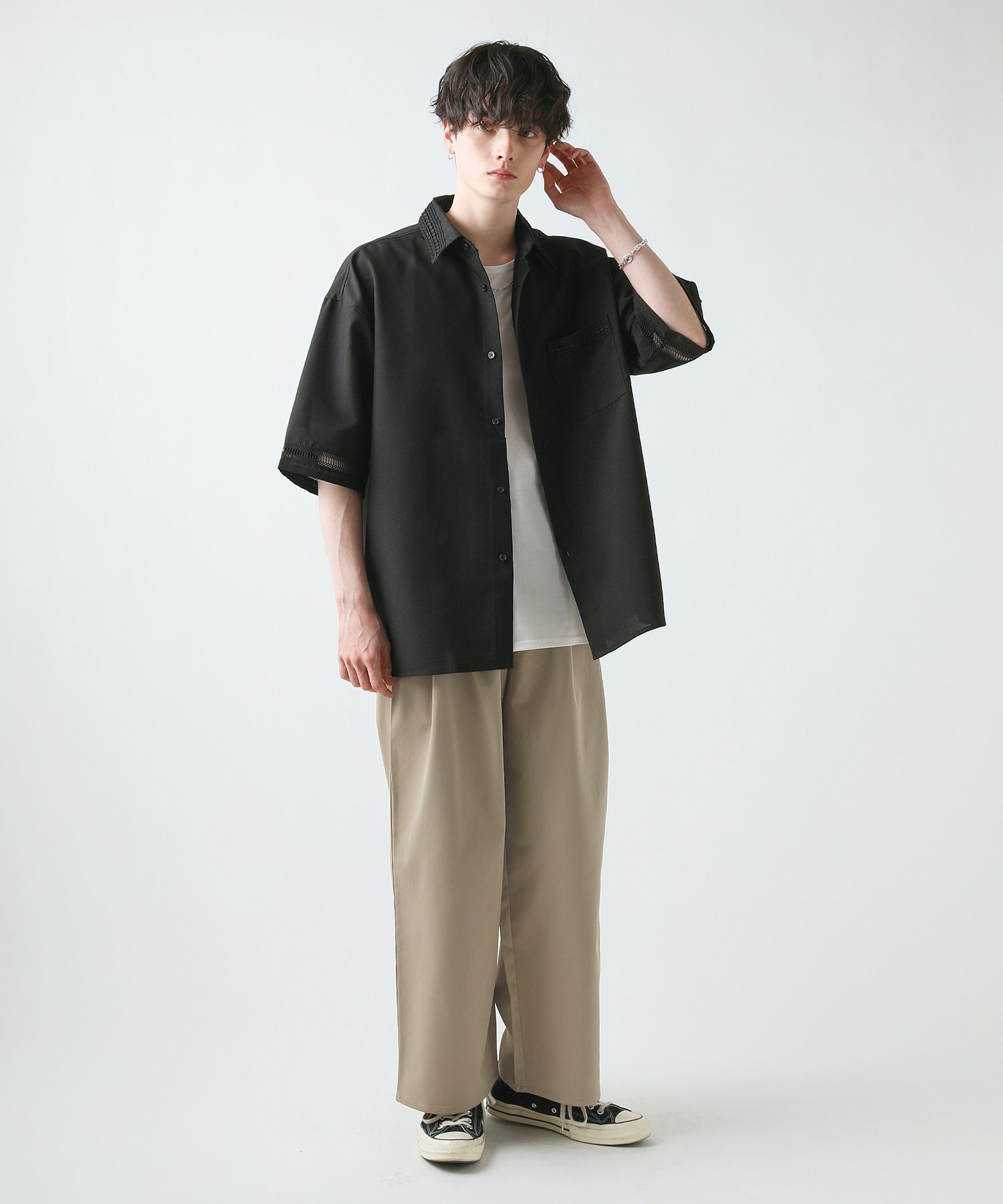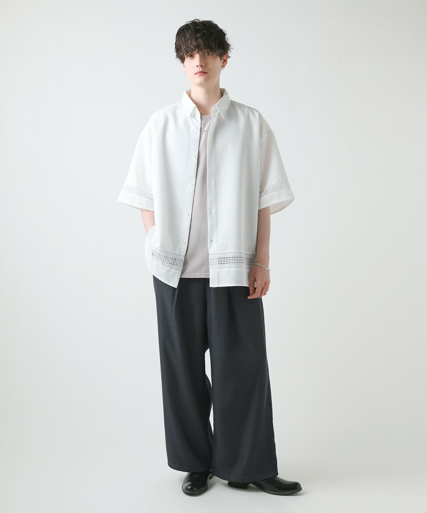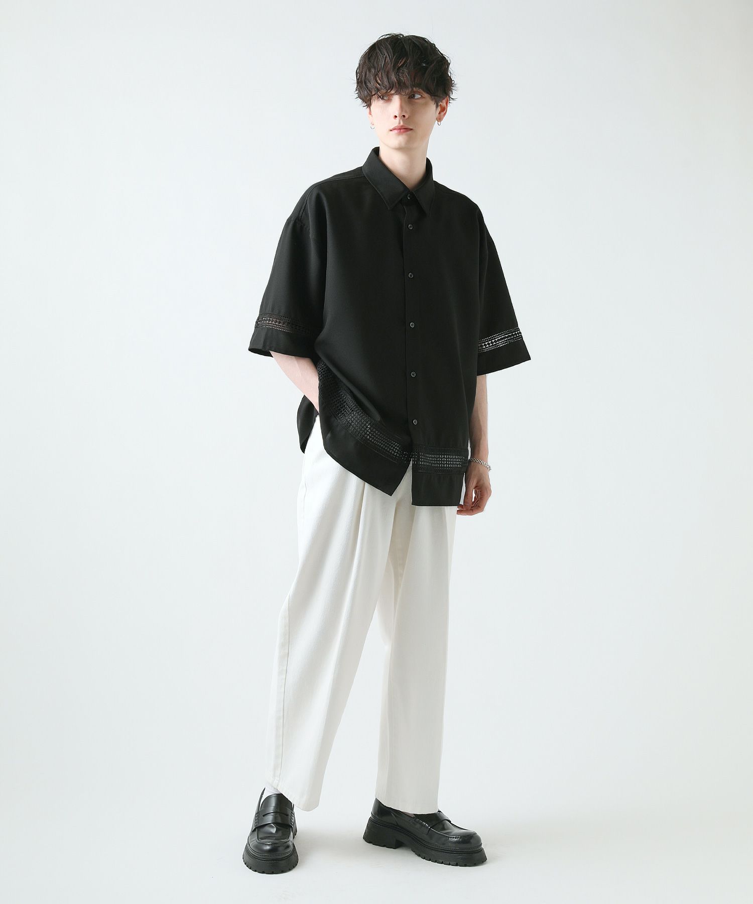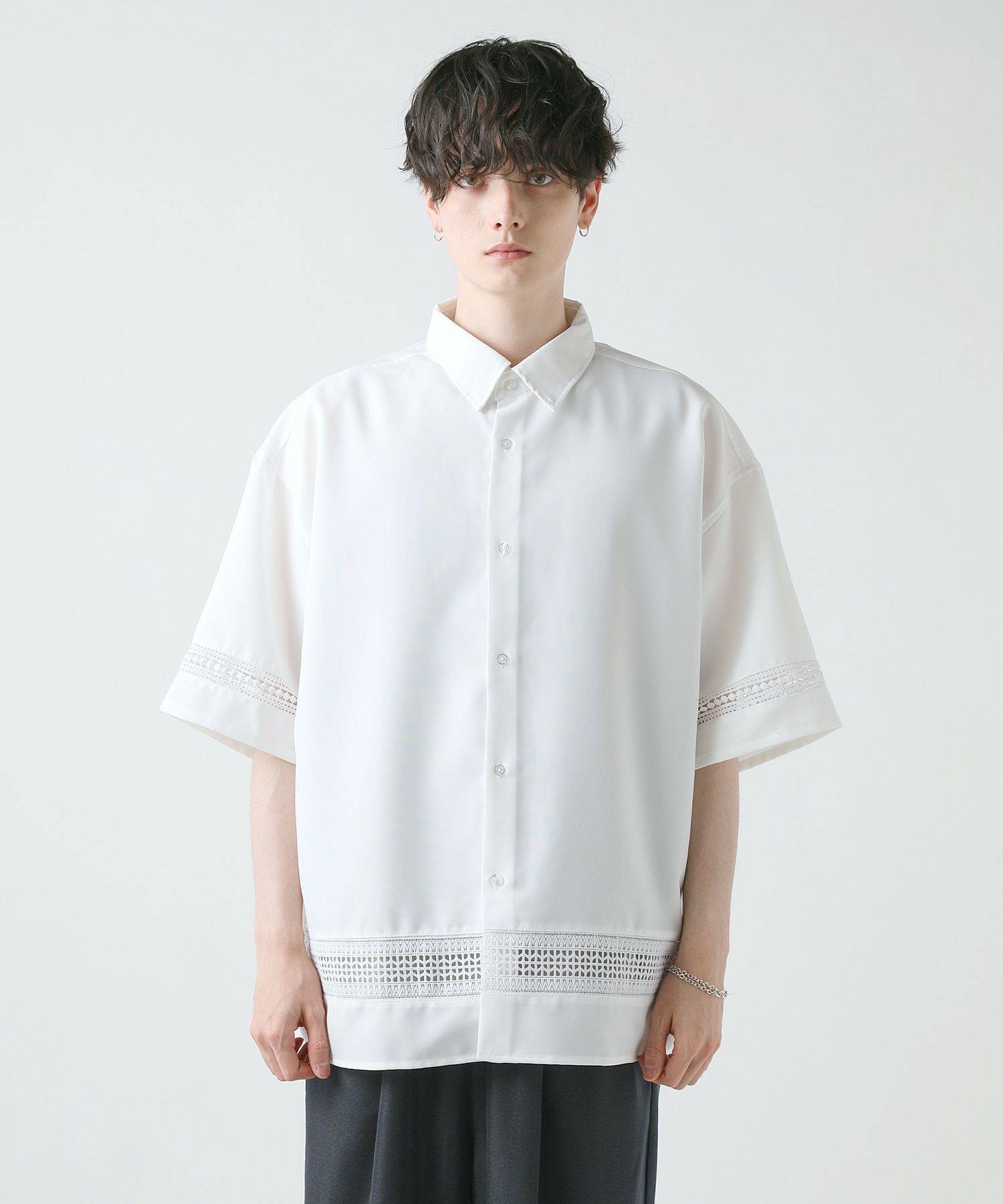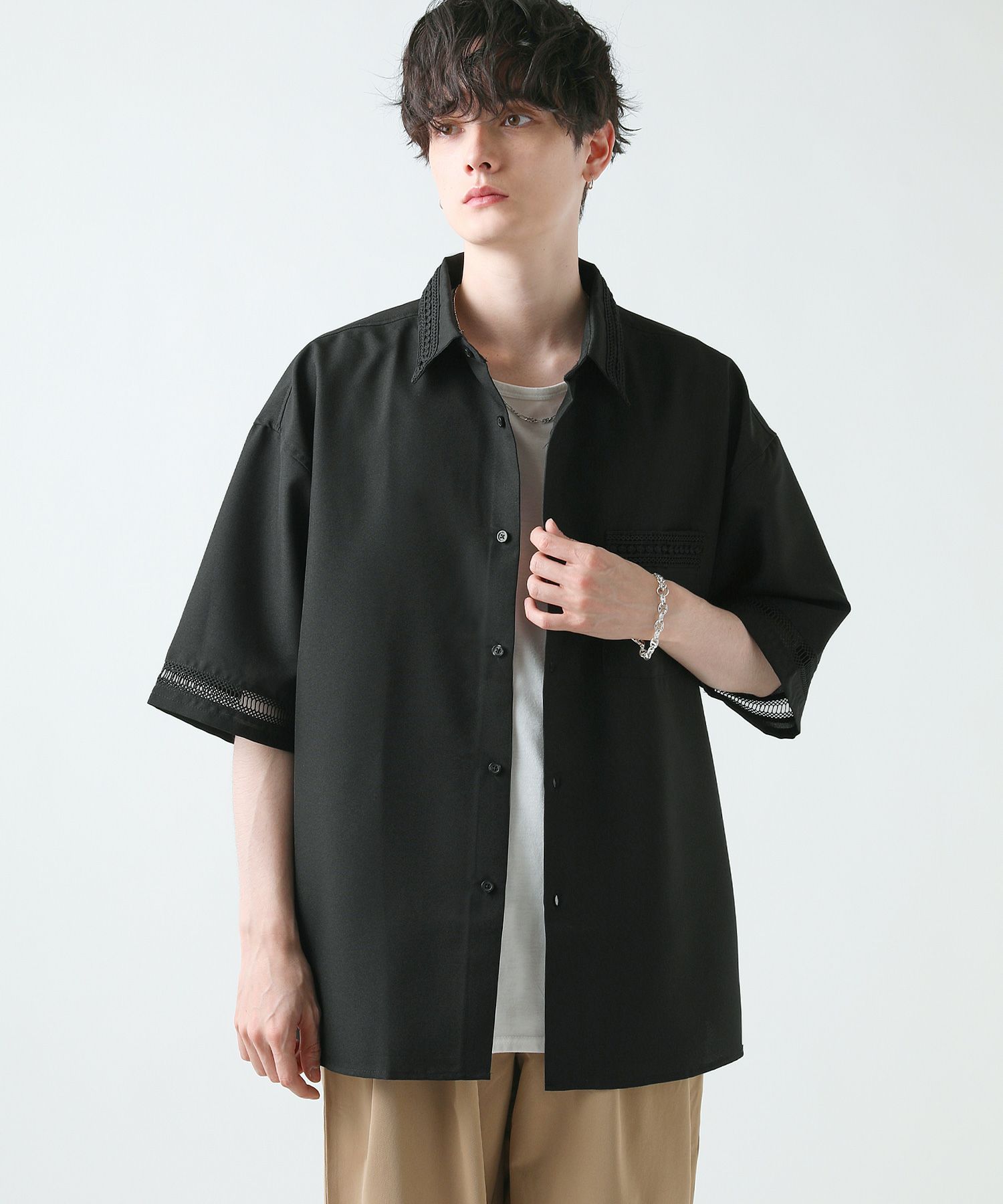 襟や裾、袖の切り替え部分にレースを施した華やかなシャツ。ワントーンに馴染みながらも、異素材のコントラストがメリハリと上品さをプラスします。袖や身幅をワイドに設定し、抜け感のある印象に仕上げました。レースのデザインと切り替え部分が異なるタイプA、Bの2種類展開。Aは襟、胸ポケット、袖口部分。Bは袖口、裾部分にレース切り替えが入っています。ホワイト、ブラックの2色展開で、お持ちのアイテムに取り入れやすくコーデを上品にまとめられます。