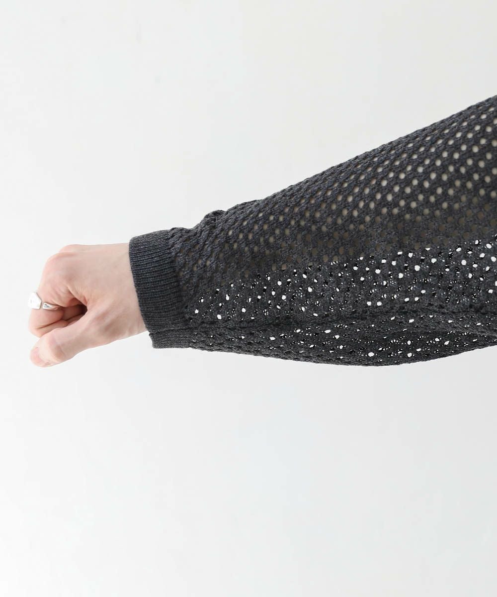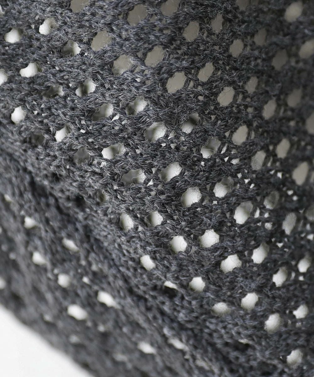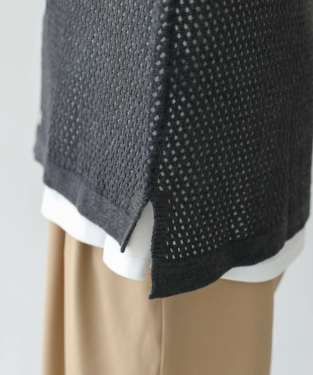 透け感のあるメッシュニット素材を使用しています。自宅での手洗いが可能なイージーケアも魅力。透け感のあるざっくりとした編み地は軽やかな着心地で、季節の変わり目に使い勝手の良い一着です。