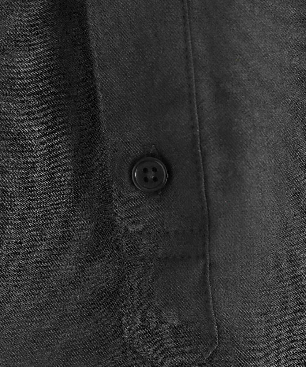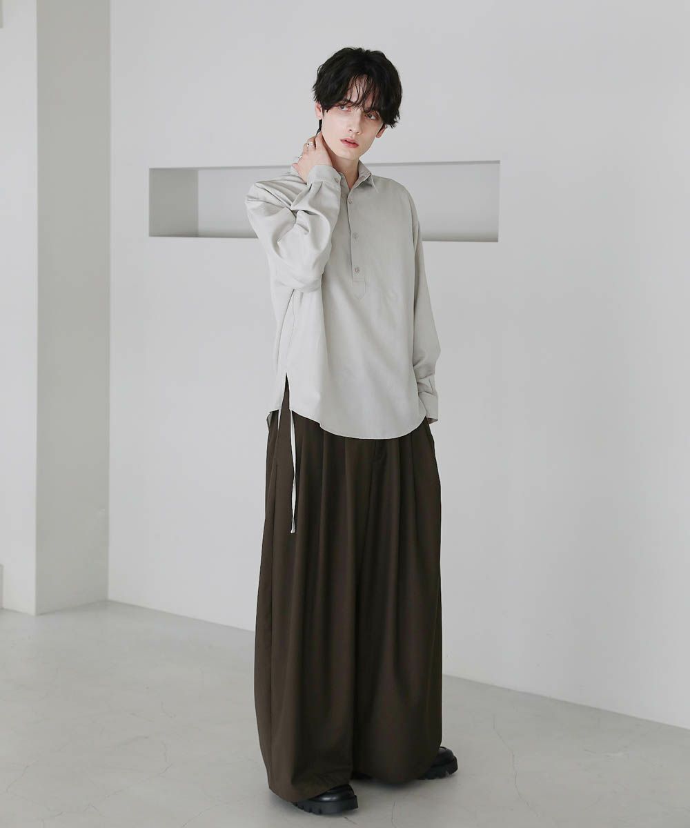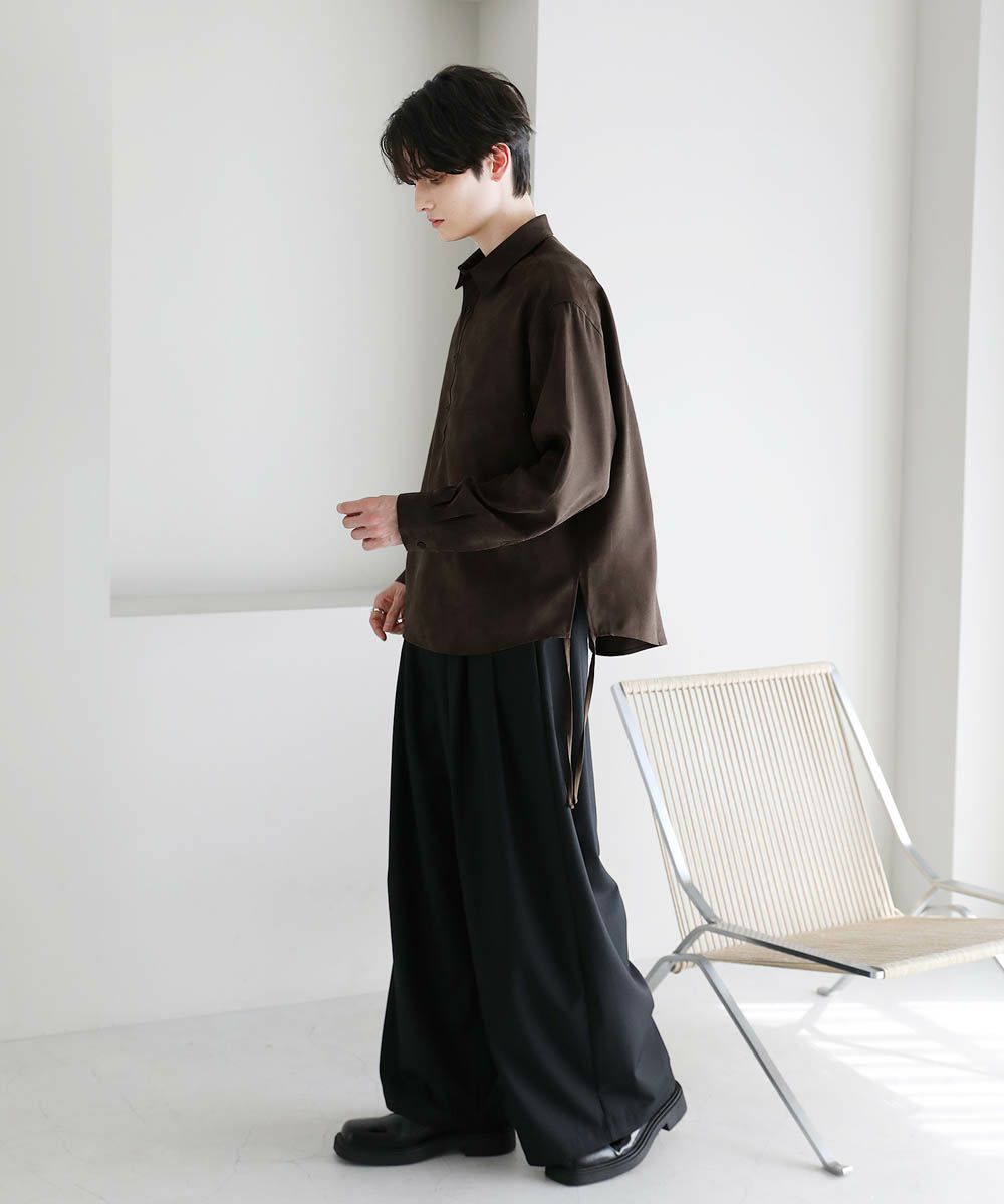 両脇にサイドコードを付属したシルエットの変化が楽しめるアイテム。適度な光沢感とハリを持った質感で高級感のある1枚です。カフスとバックヨークにタックを設置、裾は動きのあるラウンドカットを採用したことで立体感のあるシルエットに。前立ては比翼仕様のハーフボタンで仕上げ、ミニマルな印象に仕上げました。カラーは落ち着いた雰囲気のあるブラック、グレー、ブラウンの3色展開です。