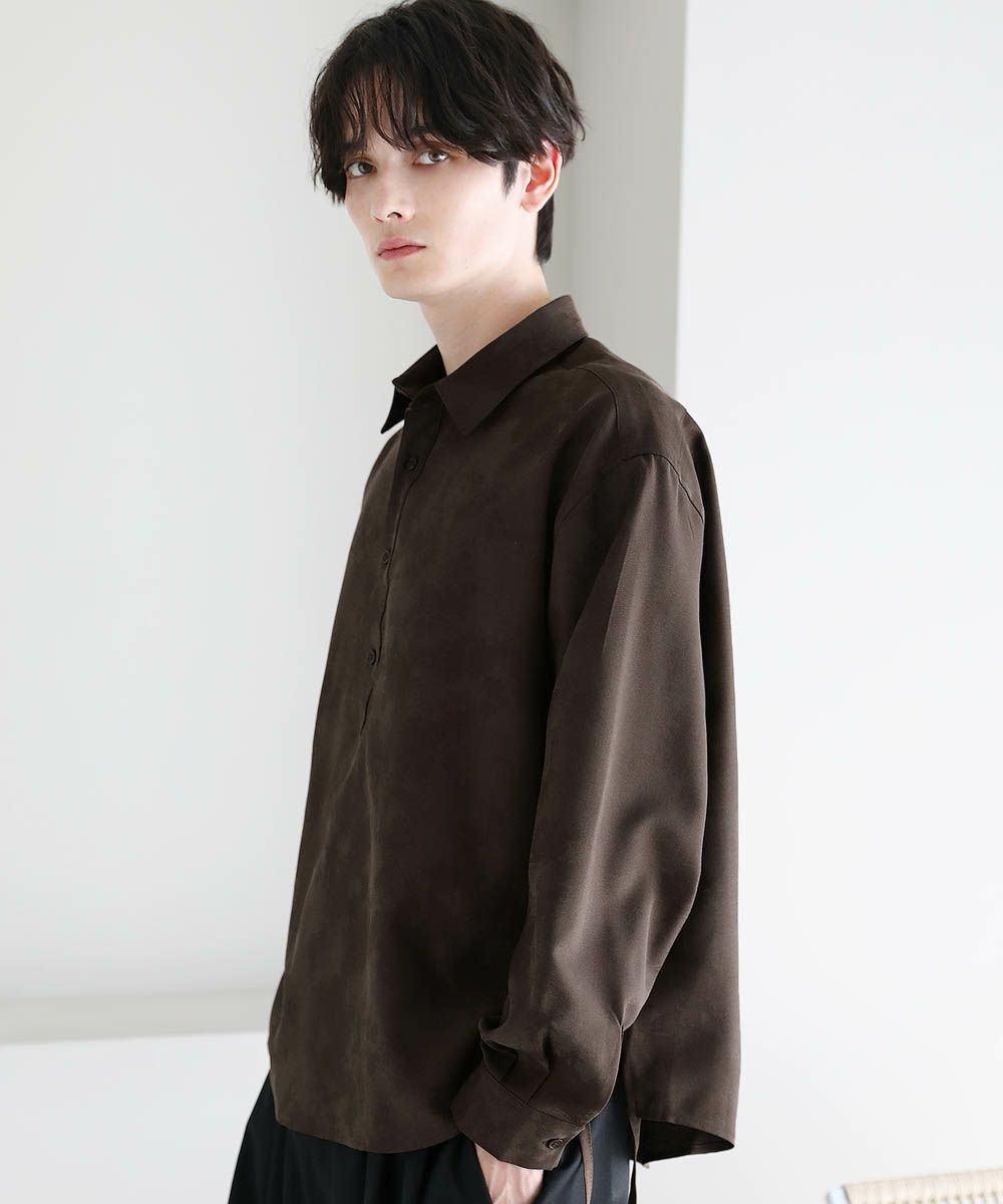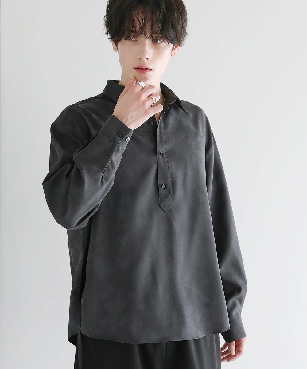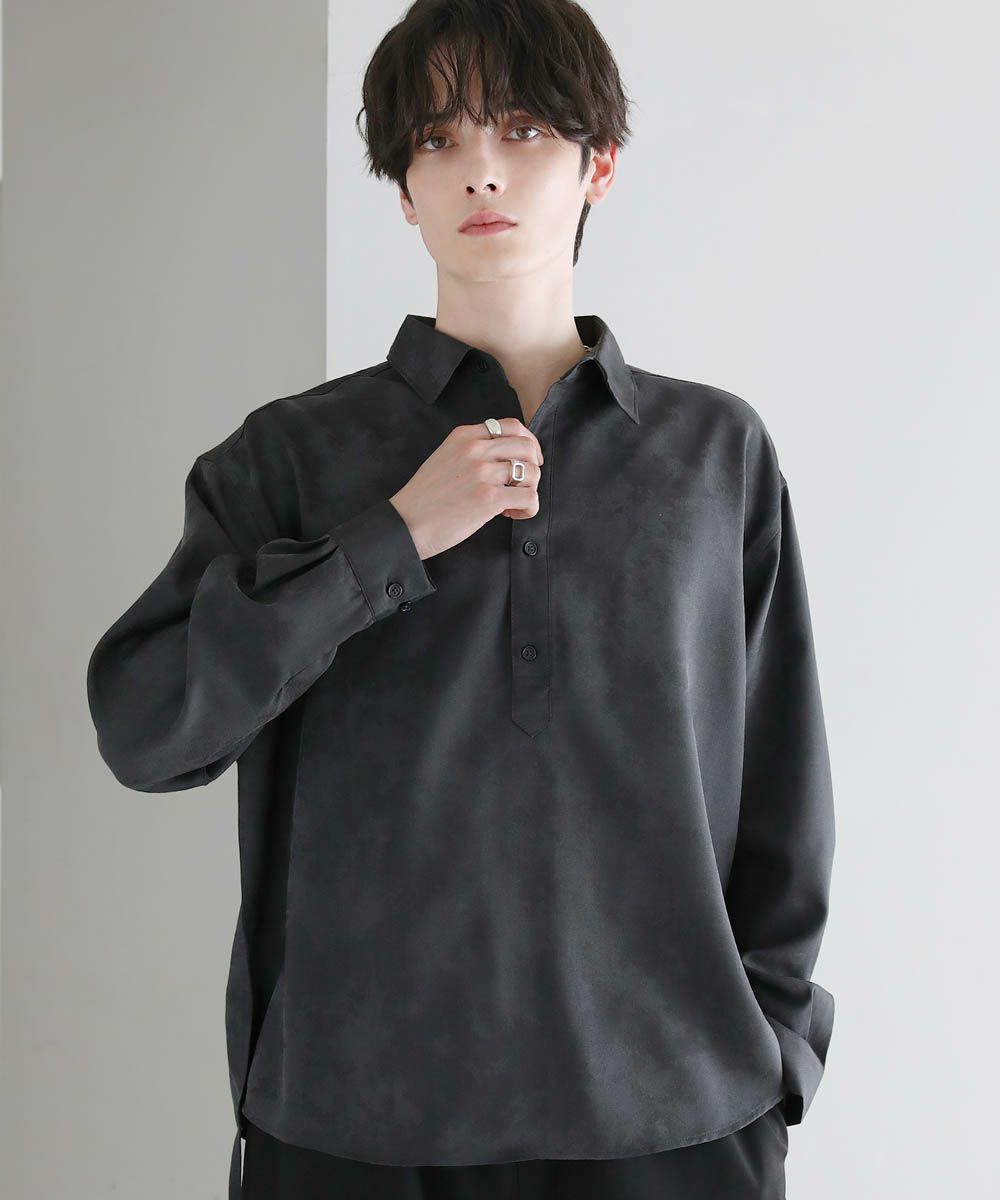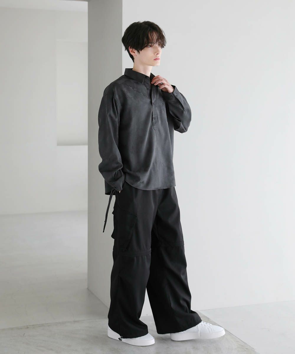 両脇にサイドコードを付属したシルエットの変化が楽しめるアイテム。適度な光沢感とハリを持った質感で高級感のある1枚です。カフスとバックヨークにタックを設置、裾は動きのあるラウンドカットを採用したことで立体感のあるシルエットに。前立ては比翼仕様のハーフボタンで仕上げ、ミニマルな印象に仕上げました。カラーは落ち着いた雰囲気のあるブラック、グレー、ブラウンの3色展開です。