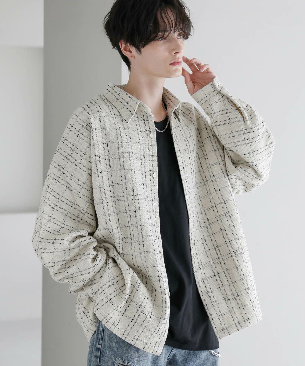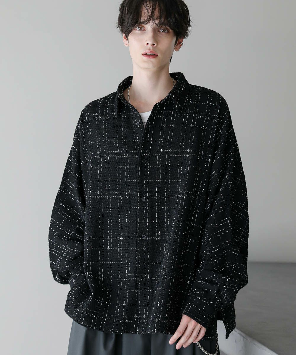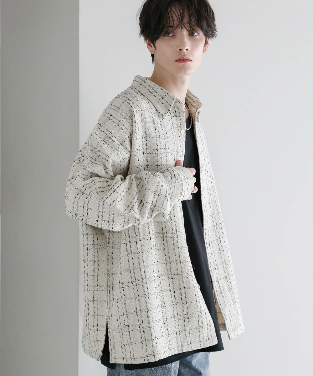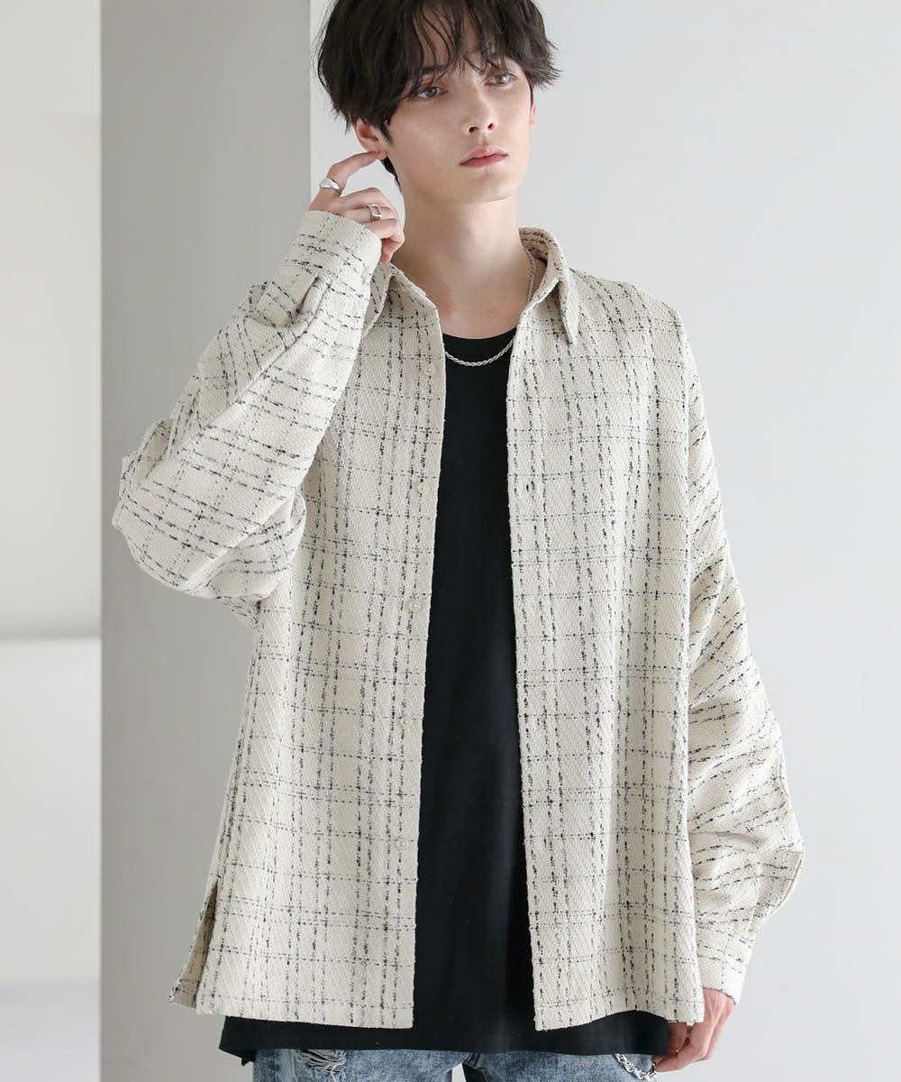 秋冬らしい季節感を演出するツイード生地のドルマンシャツ。ビッグシルエットとドルマンスリーブ、サイドスリットが抜け感のある着こなしを作ります。やや厚みのある生地感で、季節の変わり目のライトアウターとしても活躍。糸が織り込まれた生地表面の立体感がアクセントとなり、1枚で着こなしが決まるアイテムです。