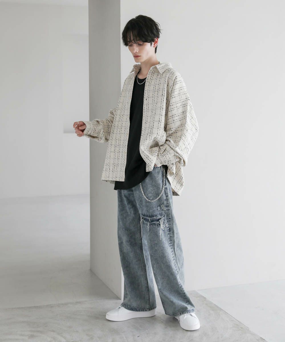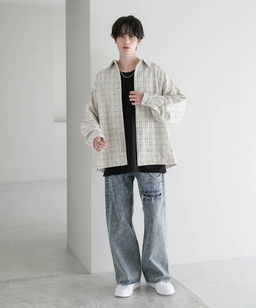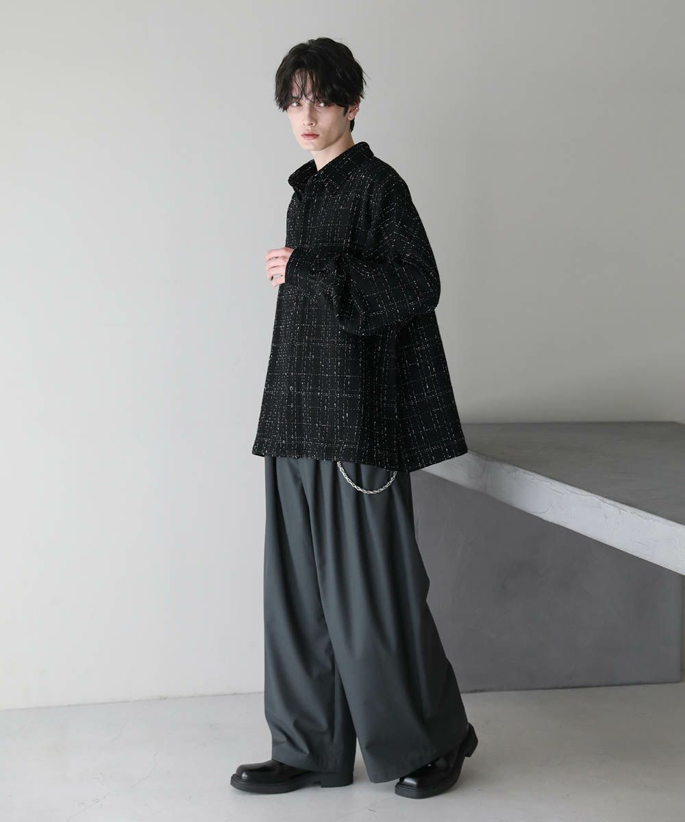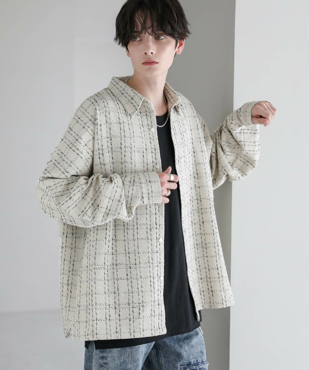 秋冬らしい季節感を演出するツイード生地のドルマンシャツ。ビッグシルエットとドルマンスリーブ、サイドスリットが抜け感のある着こなしを作ります。やや厚みのある生地感で、季節の変わり目のライトアウターとしても活躍。糸が織り込まれた生地表面の立体感がアクセントとなり、1枚で着こなしが決まるアイテムです。