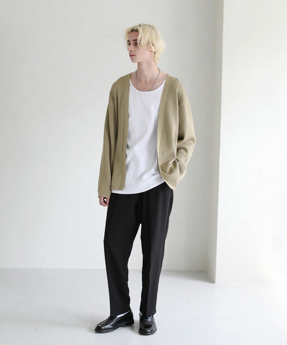 ボタンがないデザインの『ボタンレスカーデ』です。ガウンのようにも見えるデザインで、普通のカーディガンよりもリラックス感のある着こなしがお楽しみいただけます。シンプルなコーディネートにボタンレスカーデをプラスするだけで簡単に抜け感が出て、グッとお洒落な装いになります。