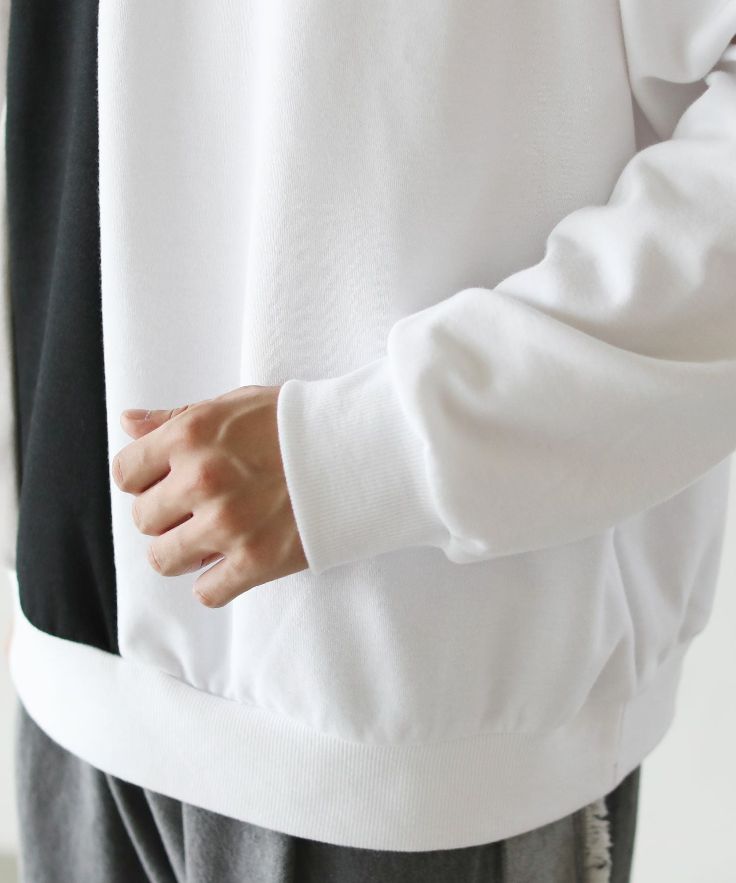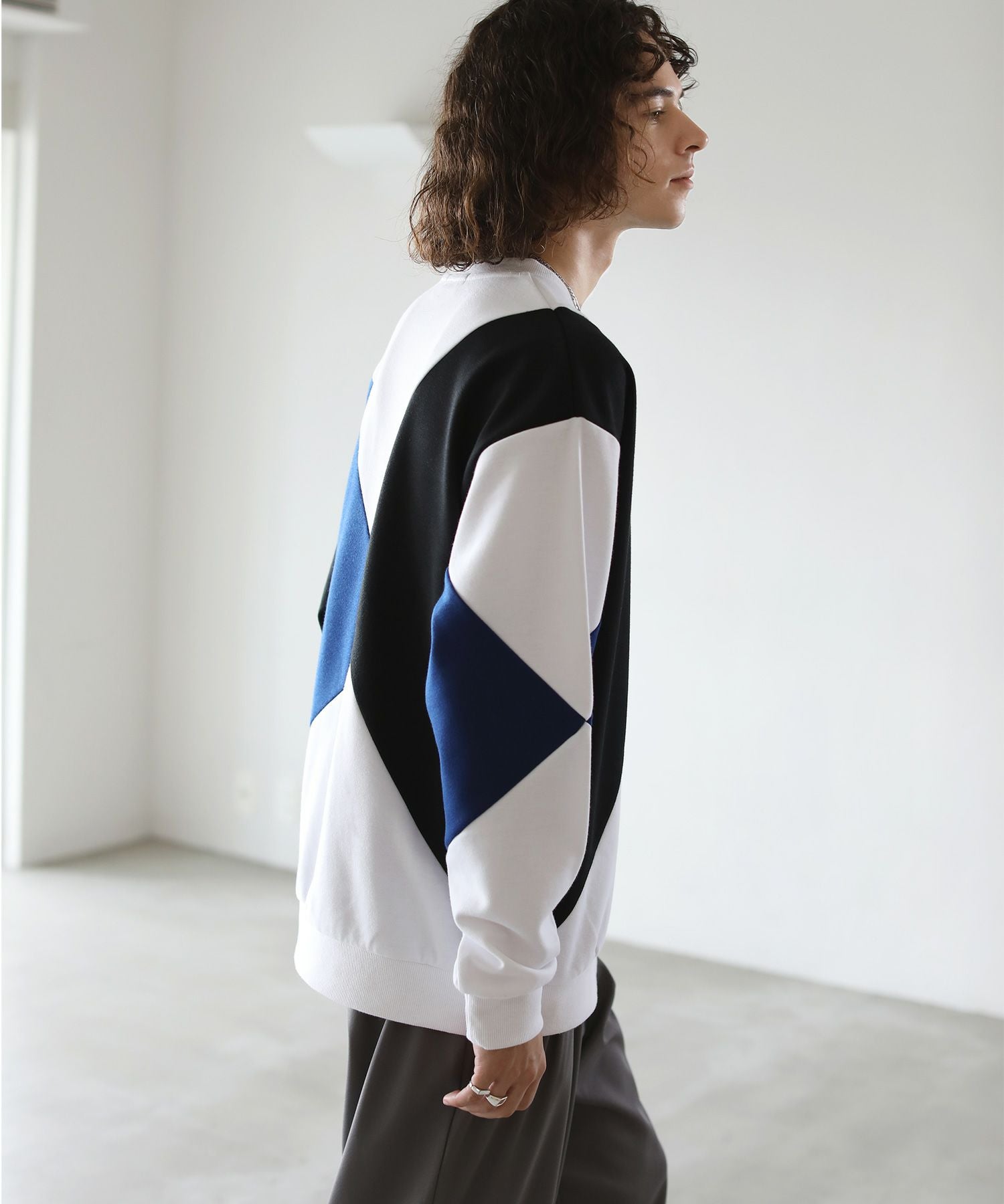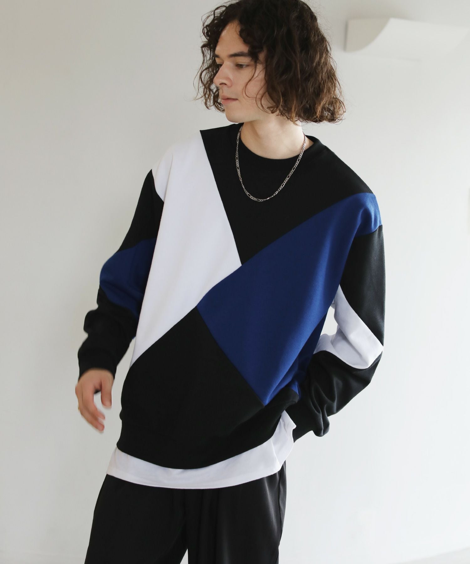大胆な切り替デザインが印象的なトレーナー。ゆとりを持たせた身幅や肩幅でリラックス感のあるアイテムです。やや肉厚&伸縮性のあるポンチ素材を採用し、ロングシーズン活躍します。程よく光沢感があることで抜け感のあるファッショナブルなスタイルに仕上げてくれます。ブルー・ホワイト・ブラック・グレーを混ぜた配色により、合わせるアイテムを選ばず着回しやすいです。